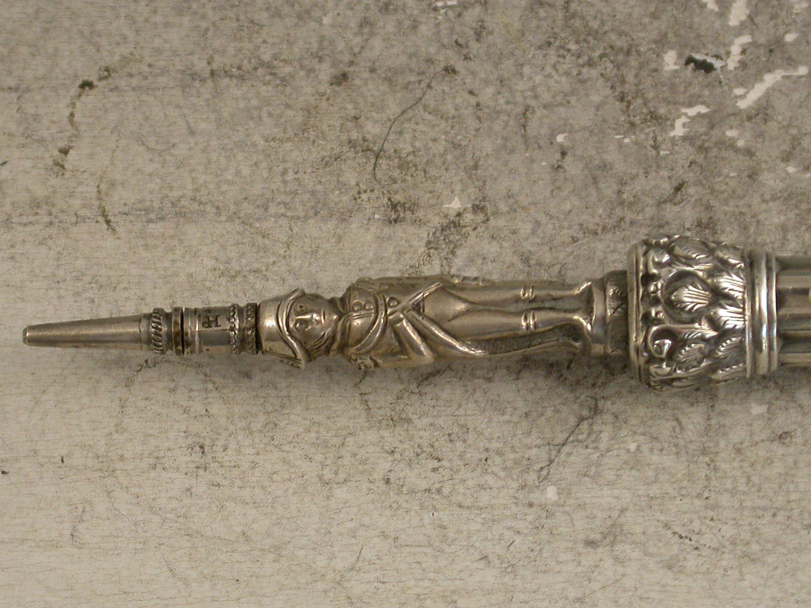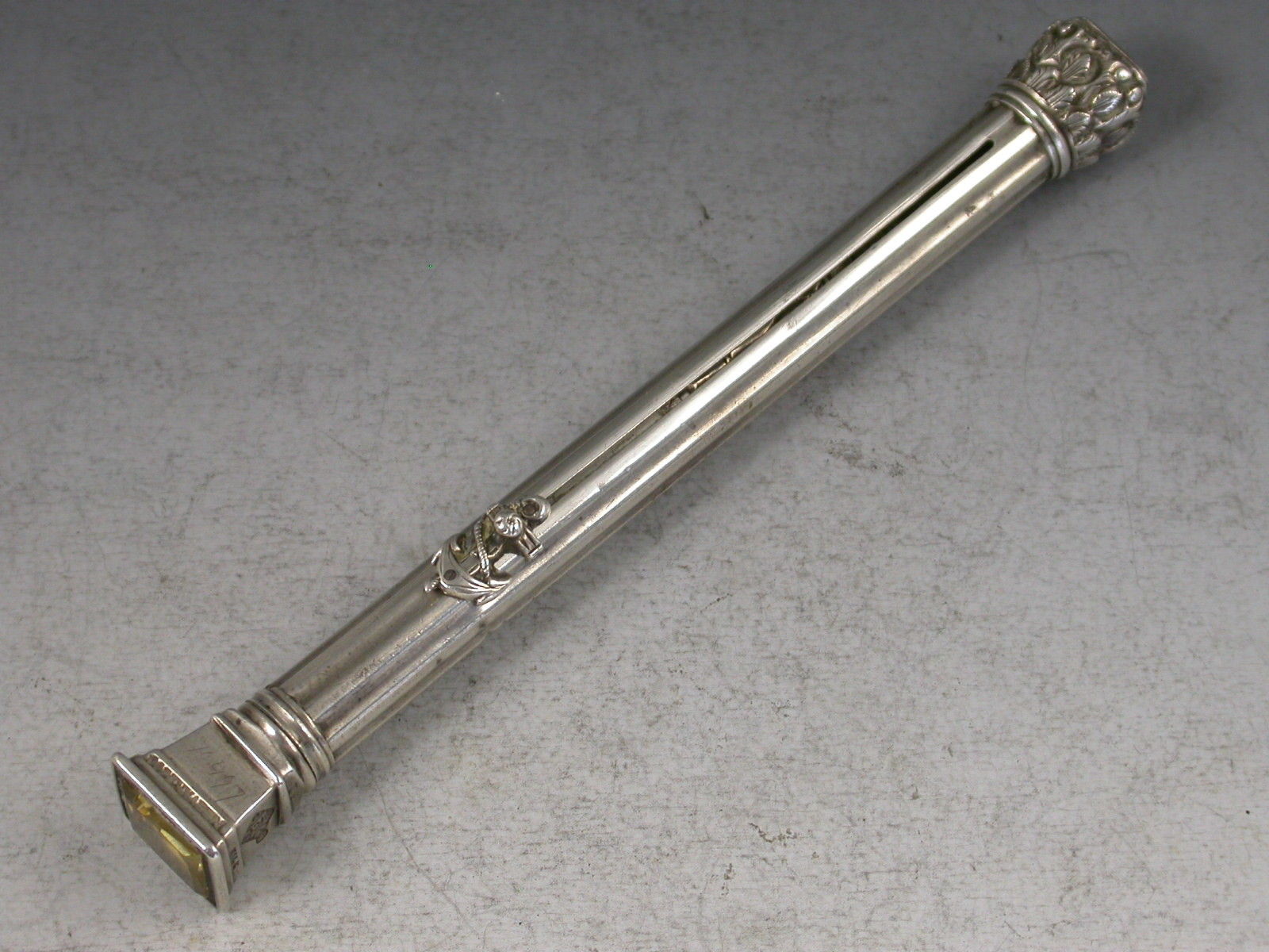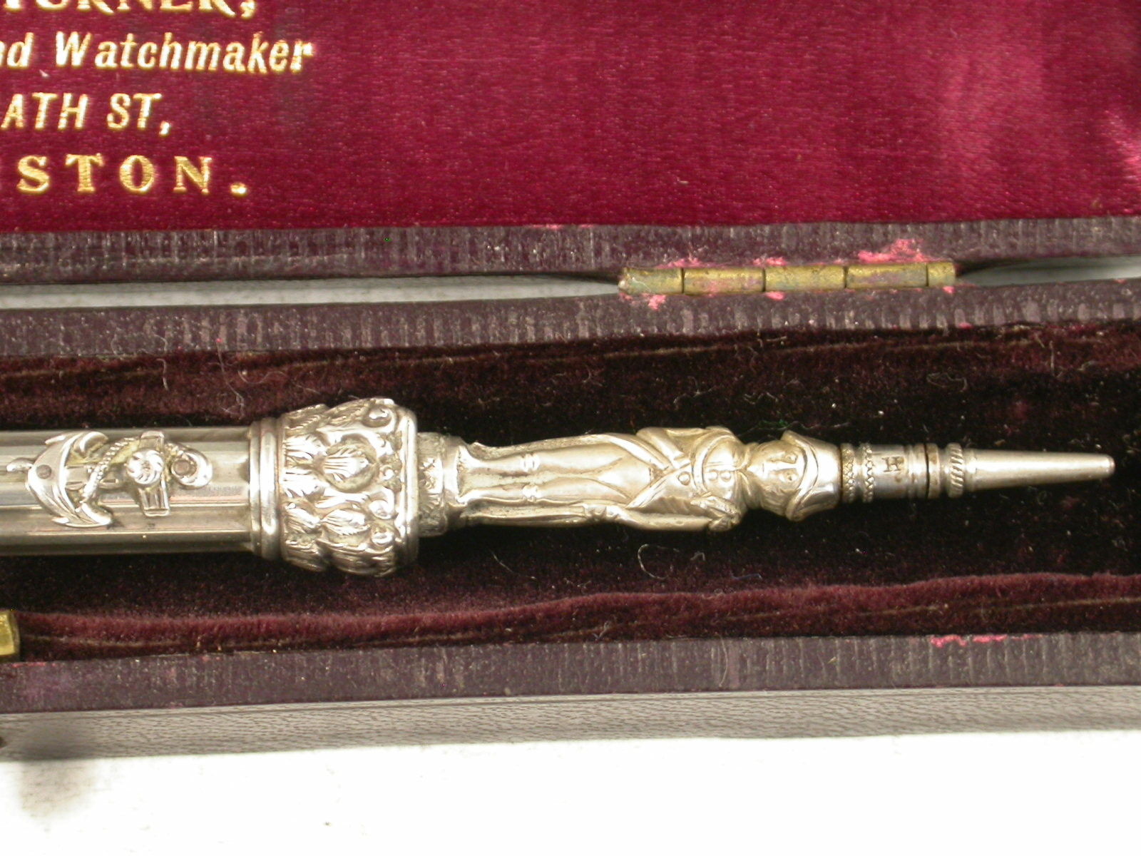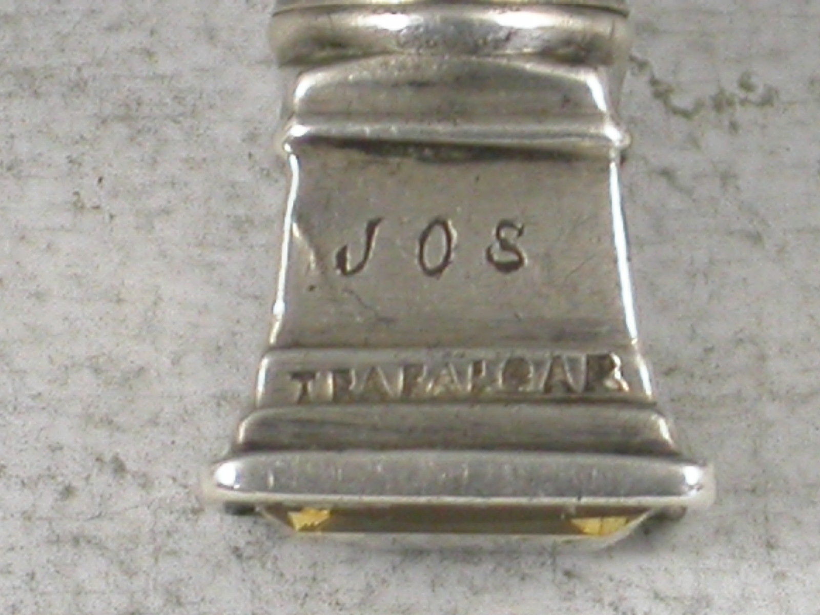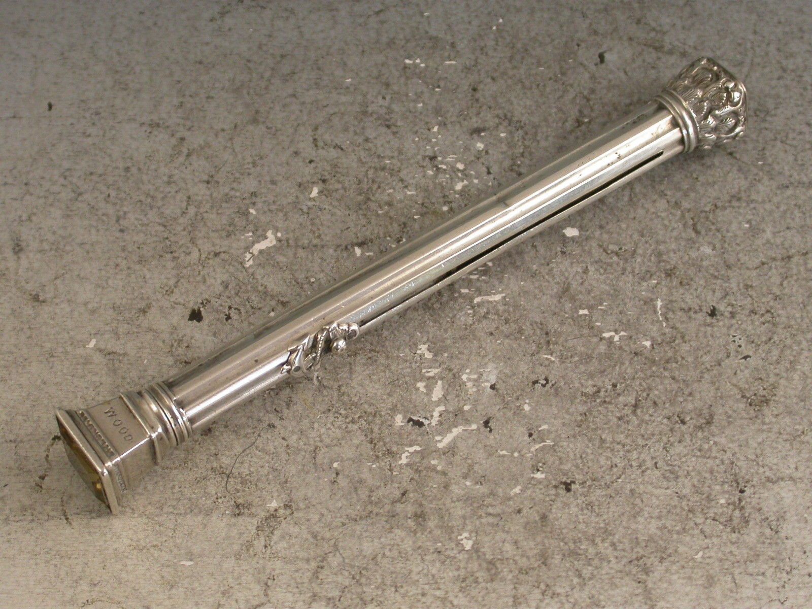 An extremely rare early Victorian silver Propelling Pencil made in the form of Nelson’s Column. The slider button formed as a fouled anchor. The screw-off top revealing a lead reserve and set with a citrine seal stone. The plinth stamped with the owners name: 'Jos Wood' and engraved with a diamond registration mark for the 30th January 1844. Also stamped with four of Nelson’s most famous Victories – Trafalgar, Nile, St Vincent and Copenhagen.