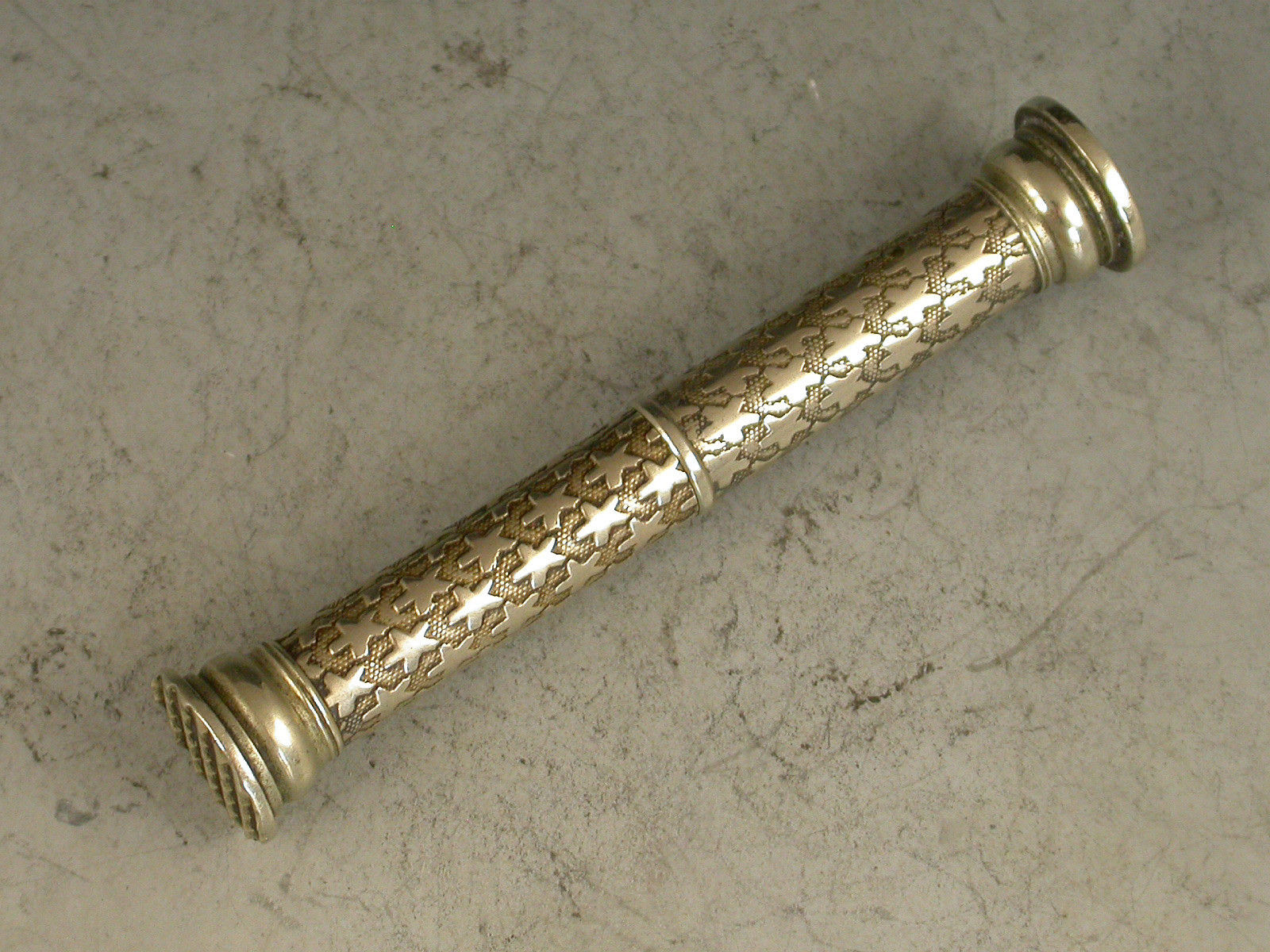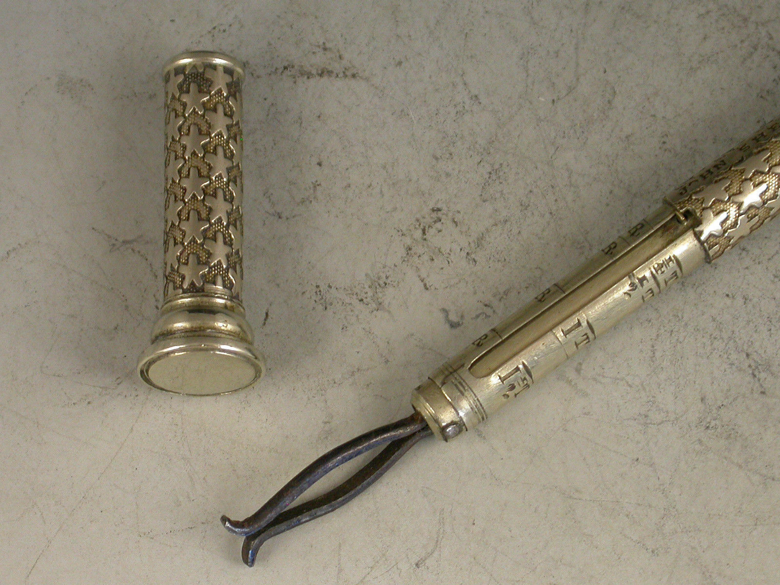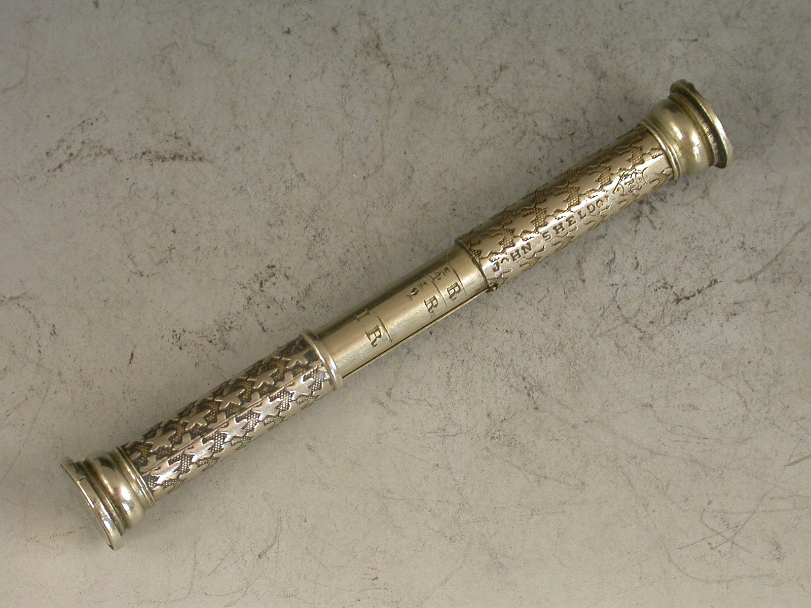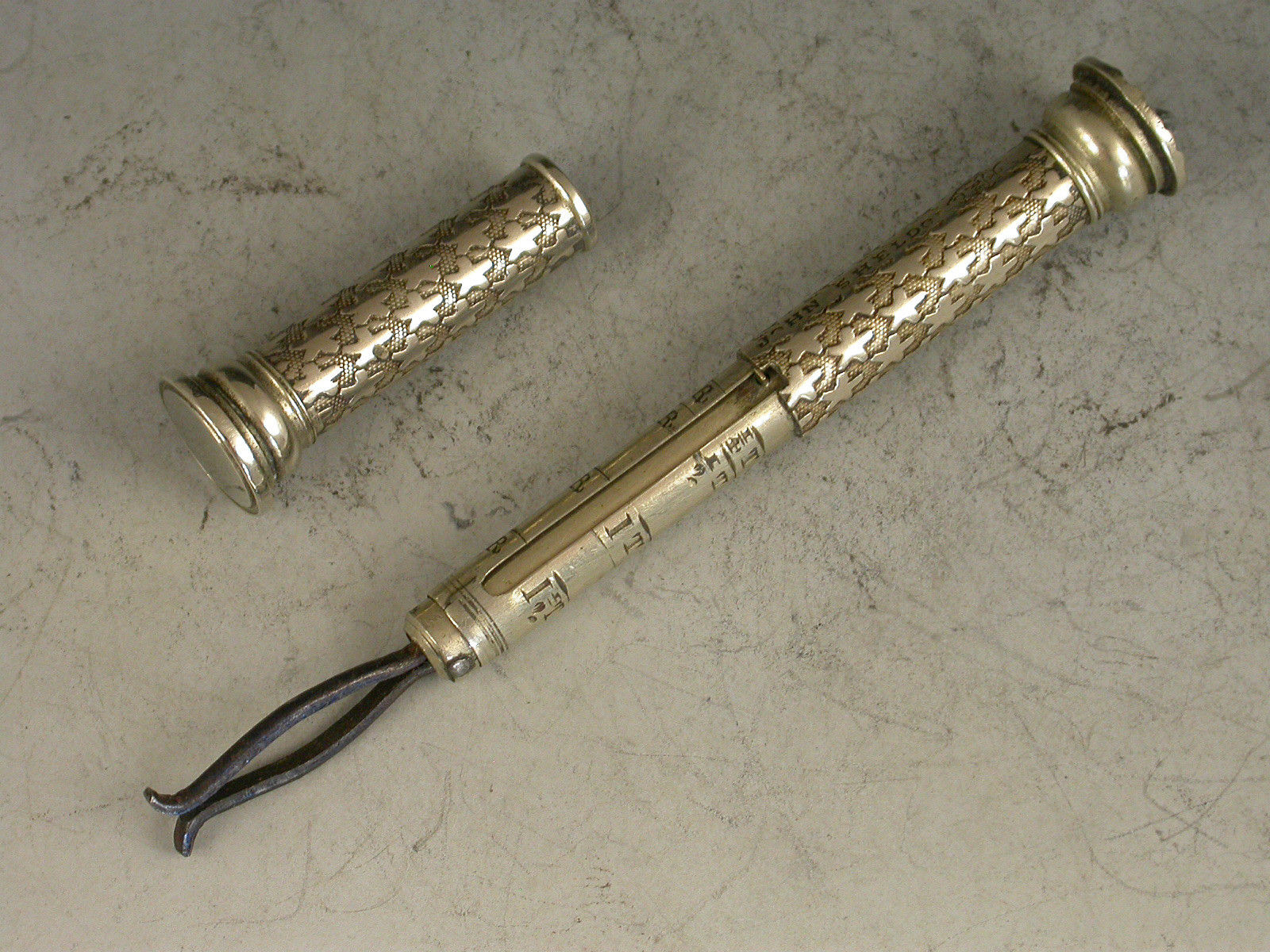A rare Victorian German silver Pocket Telescope Letter Balance of tubular form, pulling apart at the centre, the body with unusual 'star' decoration on a stippled background, a chequered wafer seal to one end and a plain seal to the other. The scale calibrated for Tola's and Rupees specifically for the East Indies market (a rare variant).