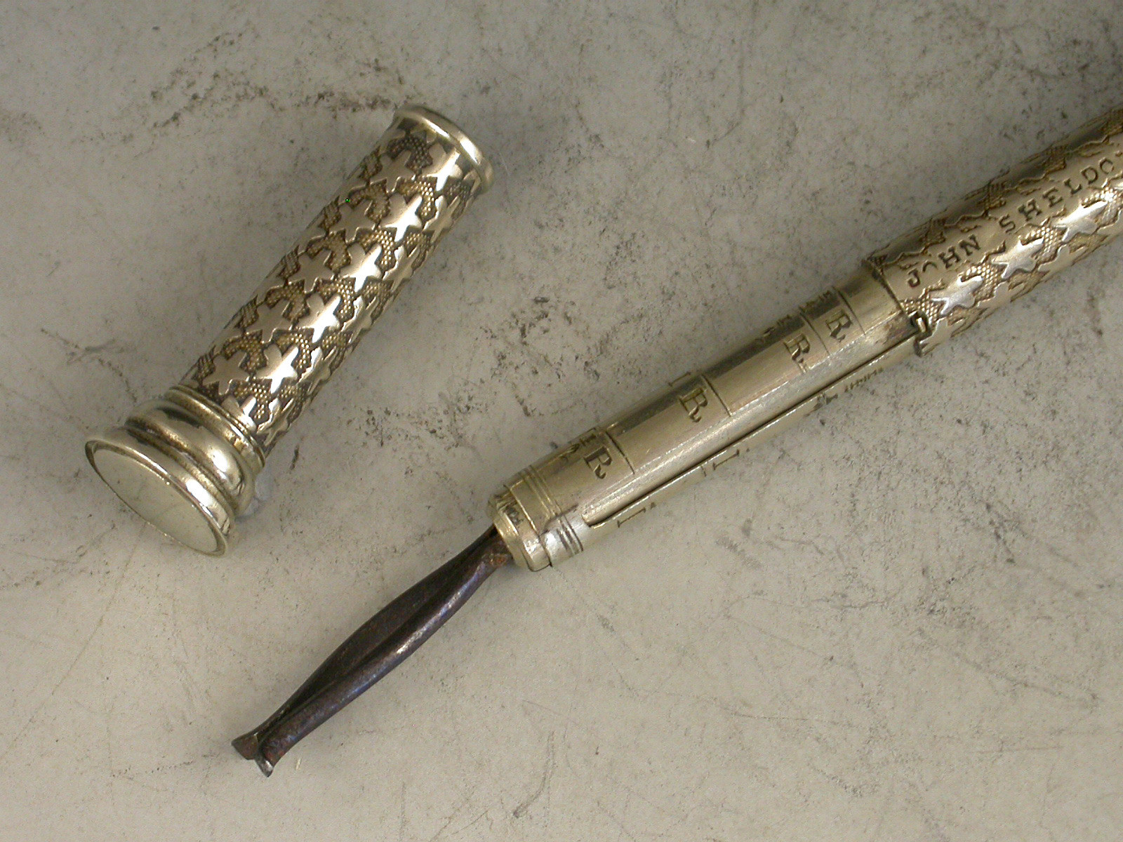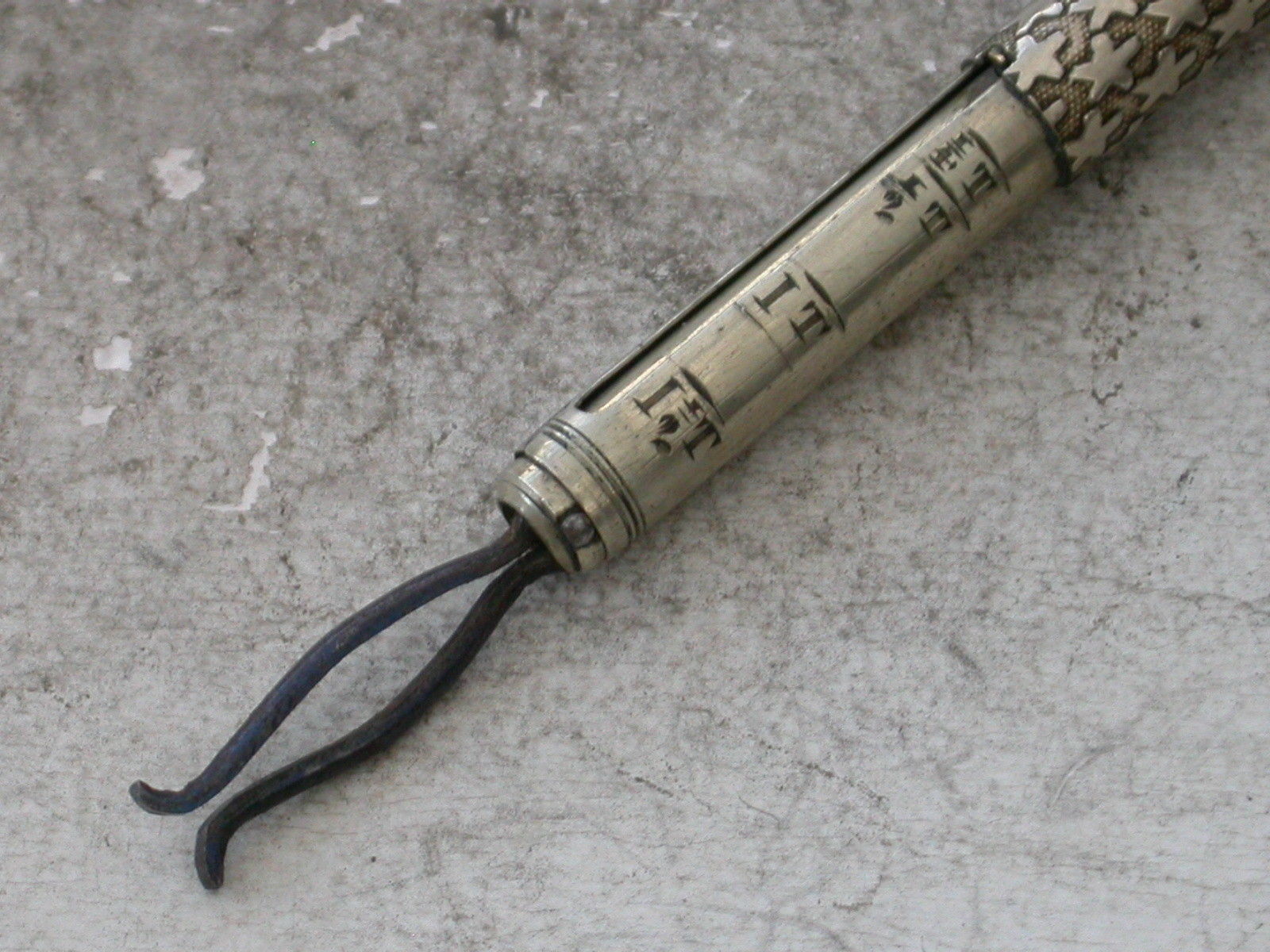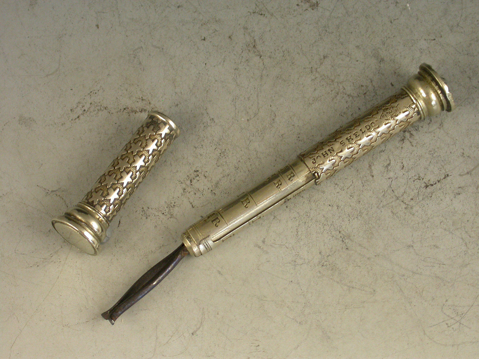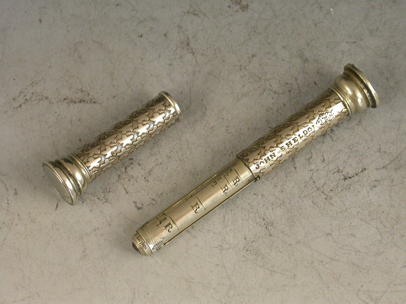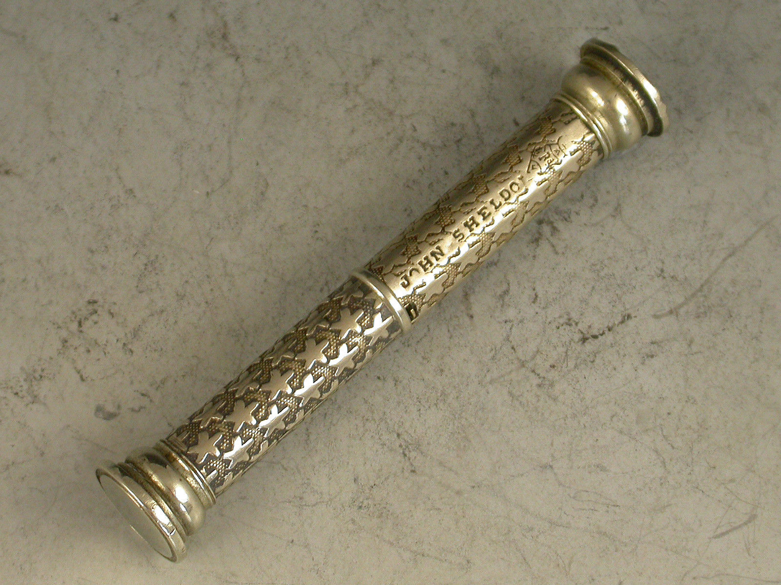 A rare Victorian German silver Pocket Telescope Letter Balance of tubular form, pulling apart at the centre, the body with unusual 'star' decoration on a stippled background, a chequered wafer seal to one end and a plain seal to the other. The scale calibrated for Tola's and Rupees specifically for the East Indies market (a rare variant).