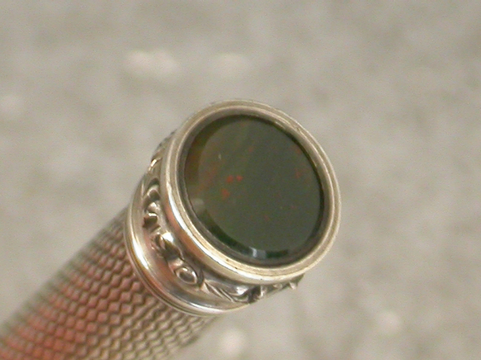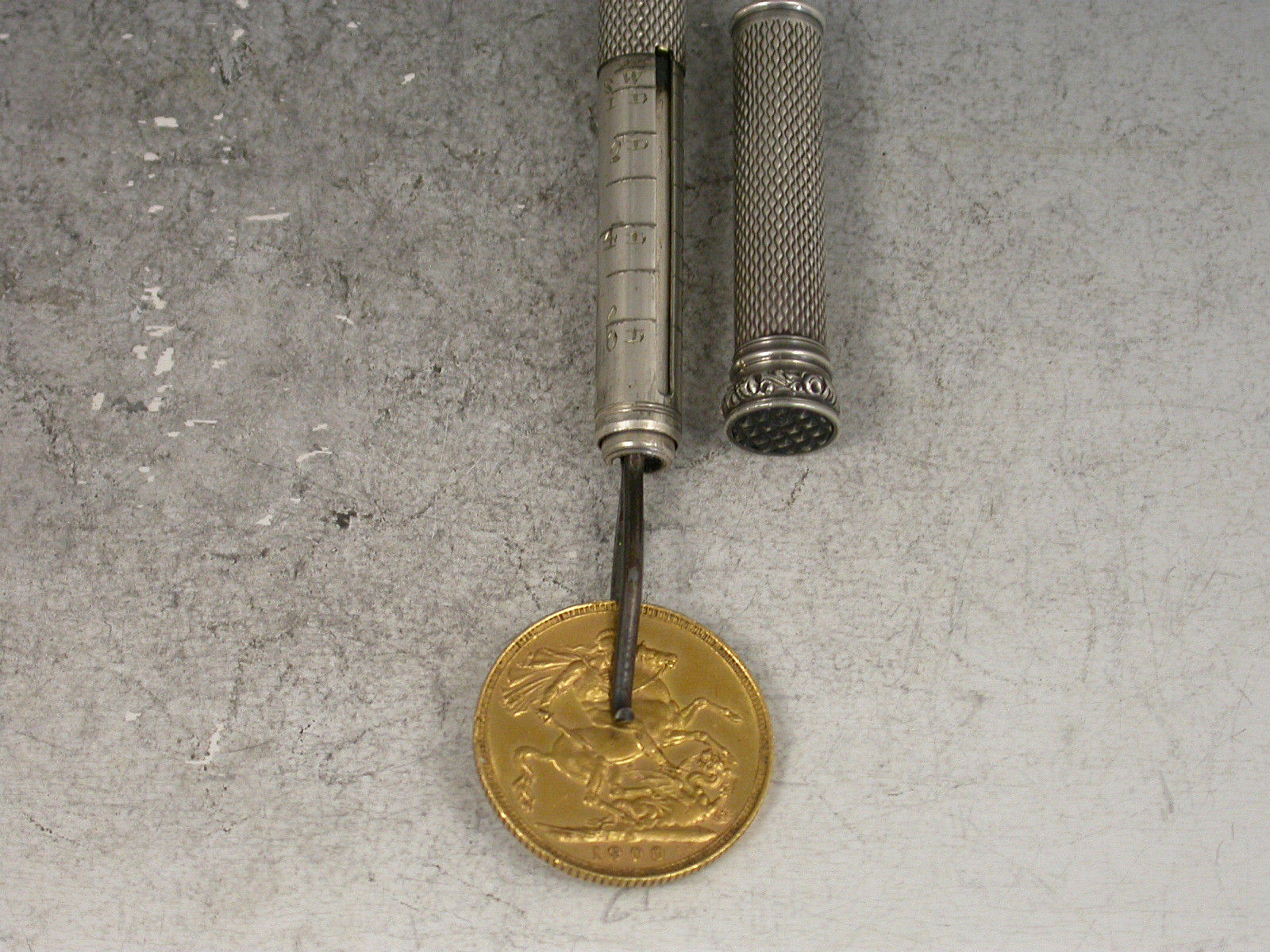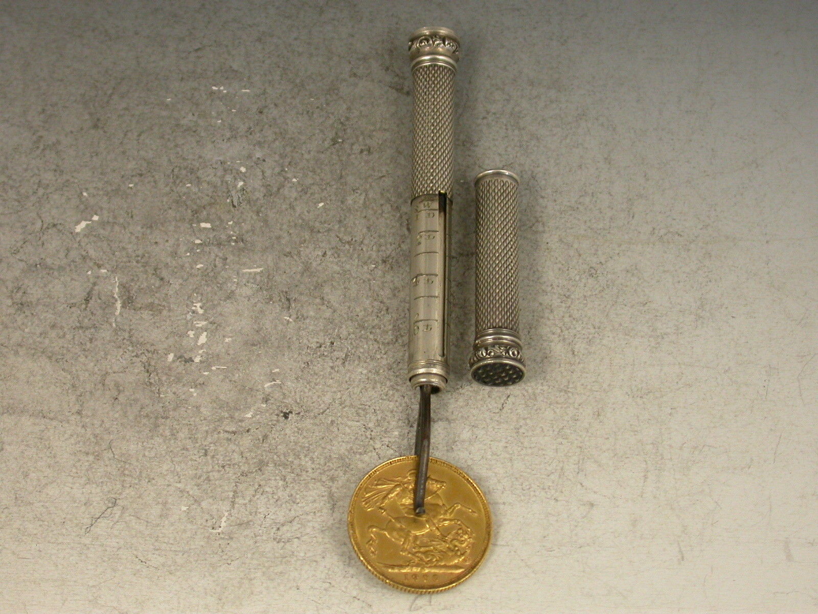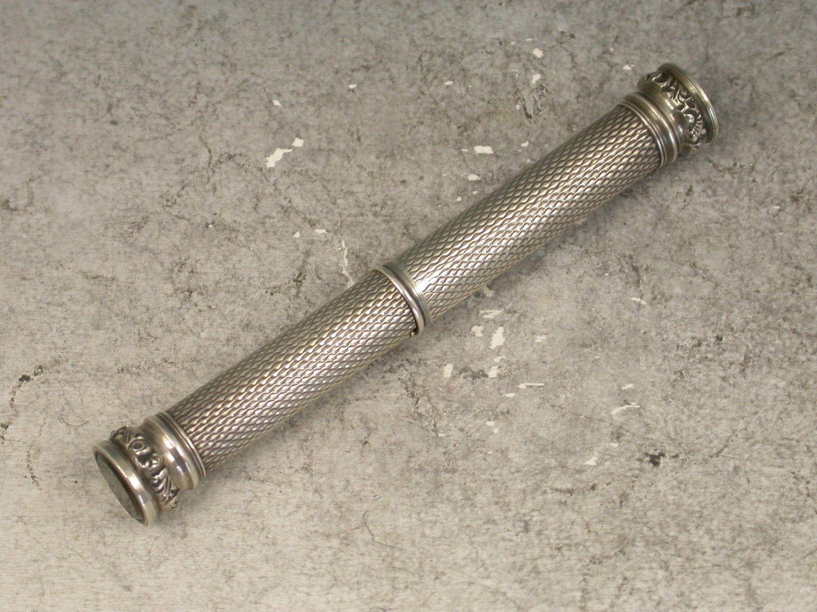 A rare Victorian German silver Pocket Telescope Letter Balance of tubular form, pulling apart at the centre, the body with engine turned decoration, a chequered wafer seal to one end and a bloodstone seal to the other. The scale calibrated in 1/2 ounces up to 3 ounces and 1D to 6D.