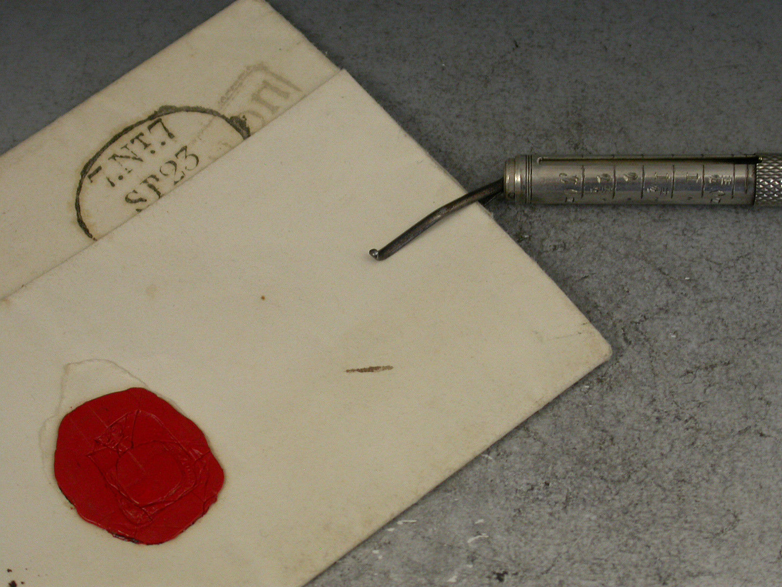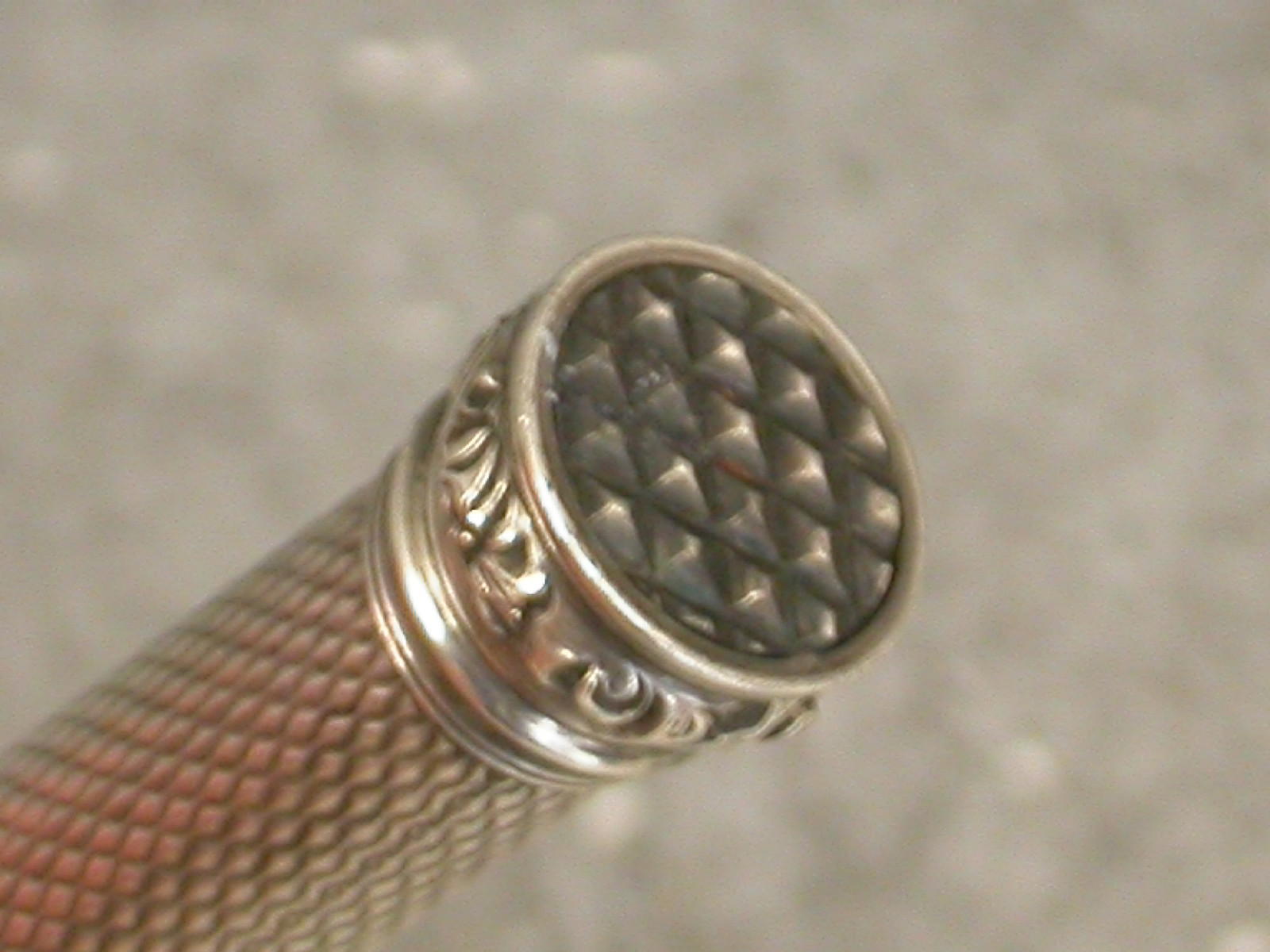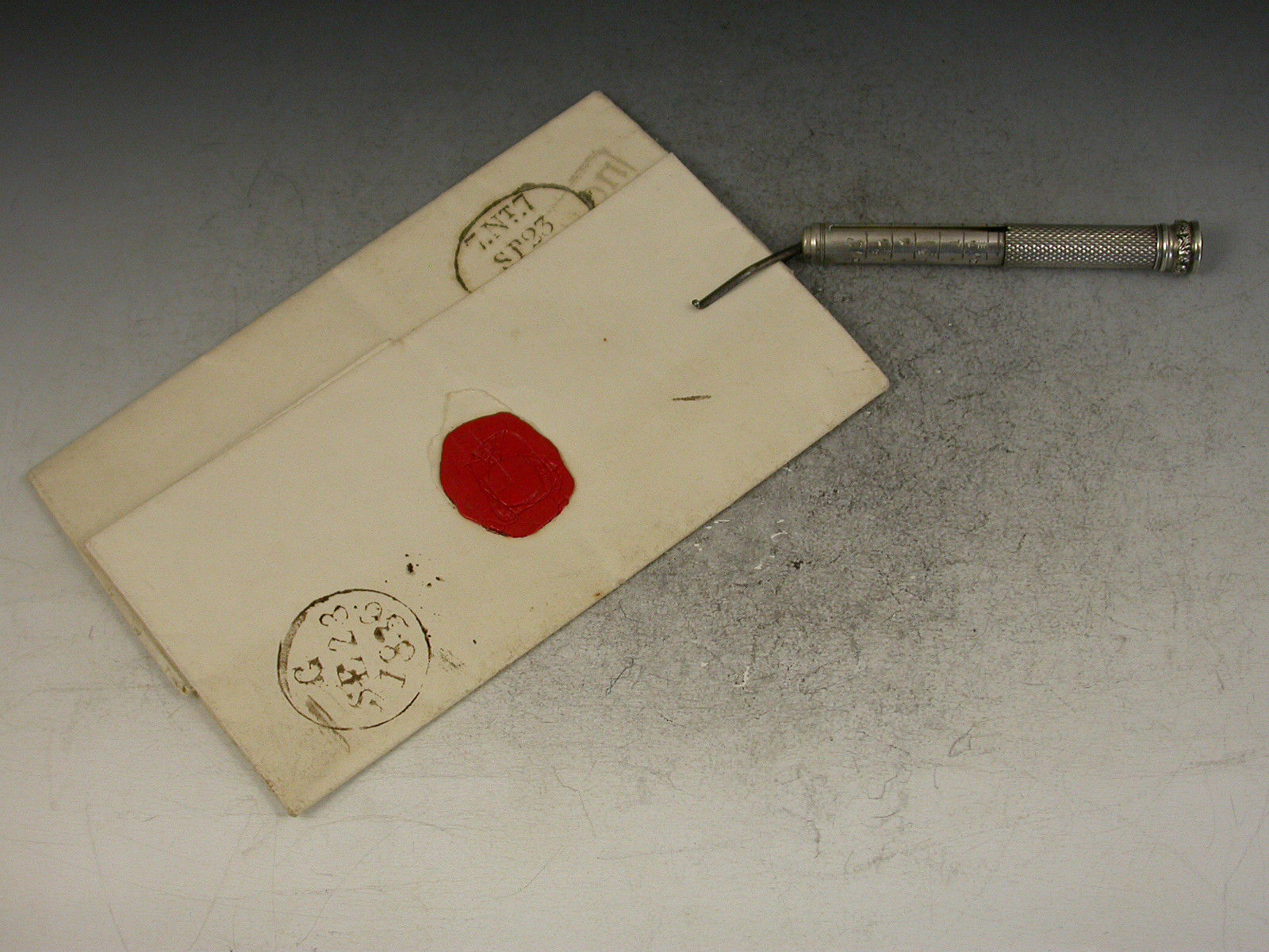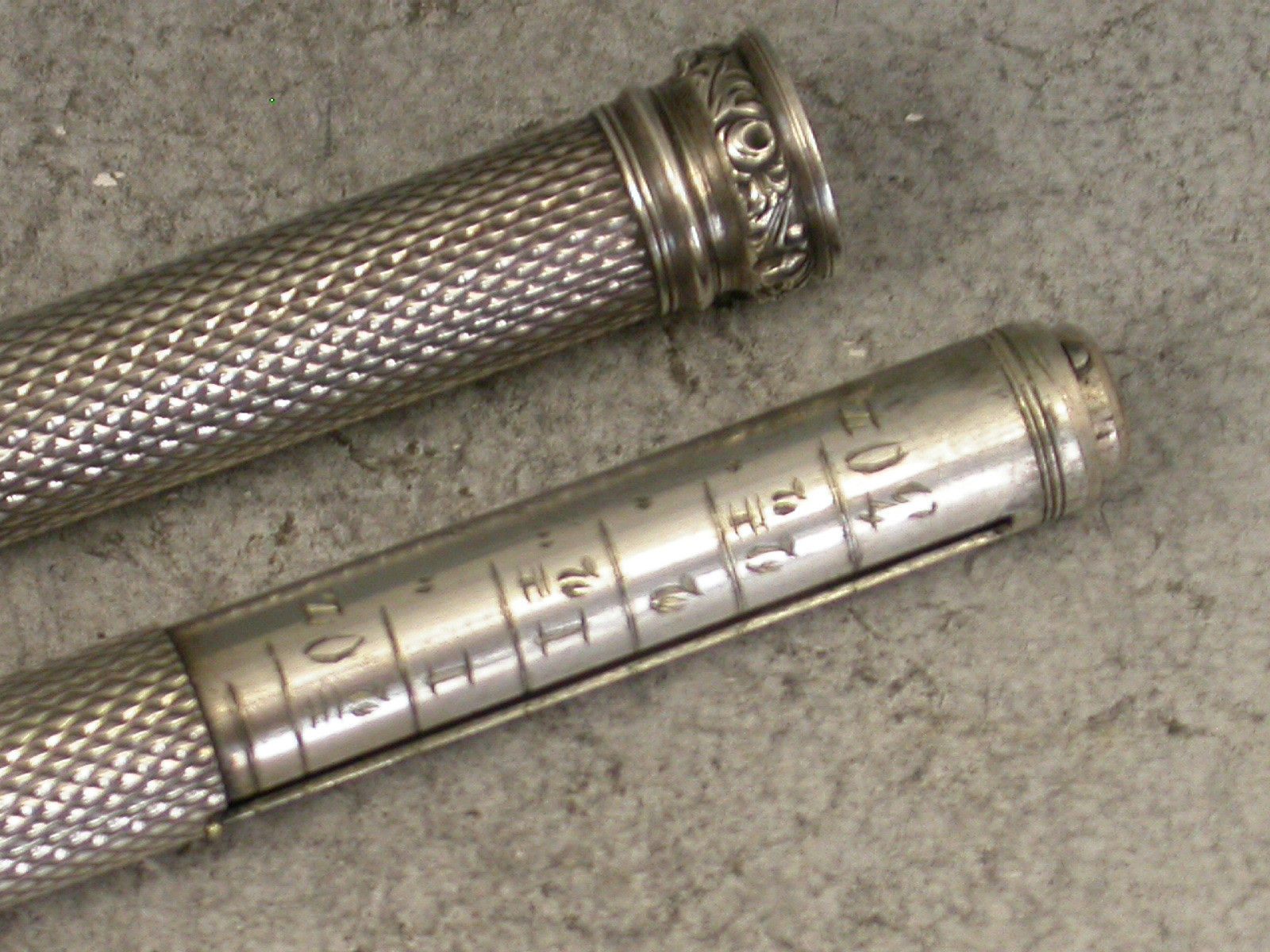 A rare Victorian German silver Pocket Telescope Letter Balance of tubular form, pulling apart at the centre, the body with engine turned decoration, a chequered wafer seal to one end and a bloodstone seal to the other. The scale calibrated in 1/2 ounces up to 3 ounces and 1D to 6D.