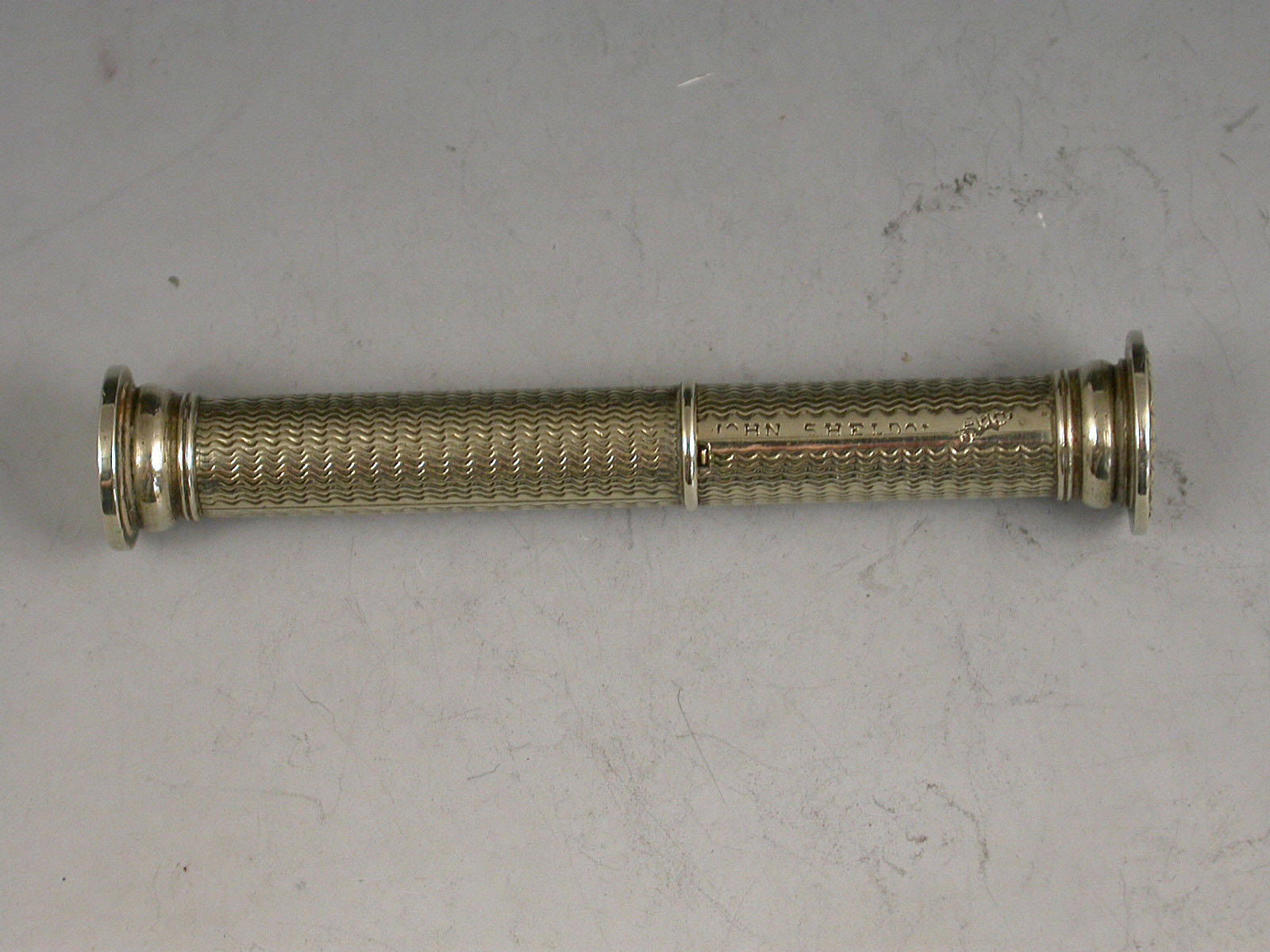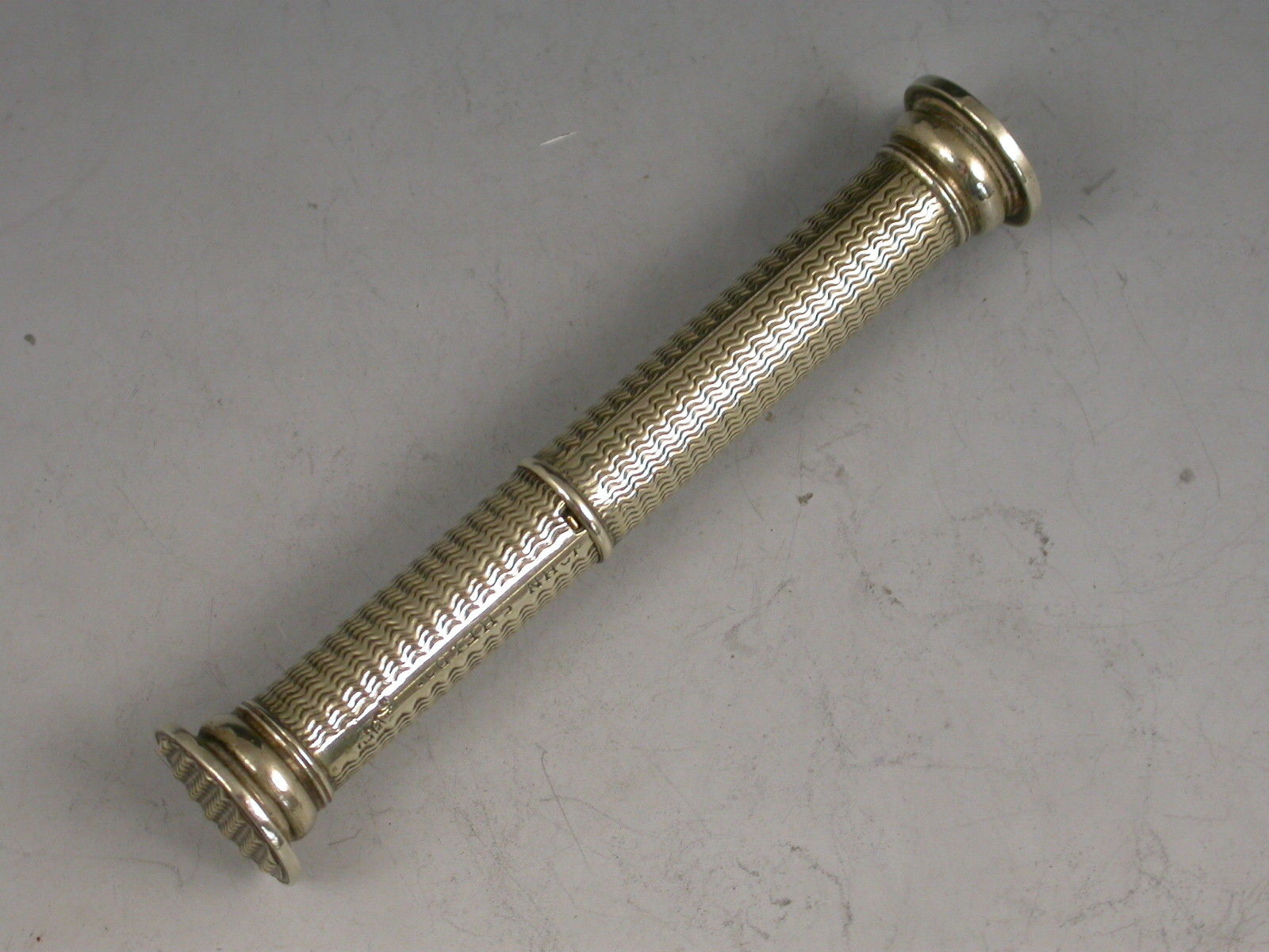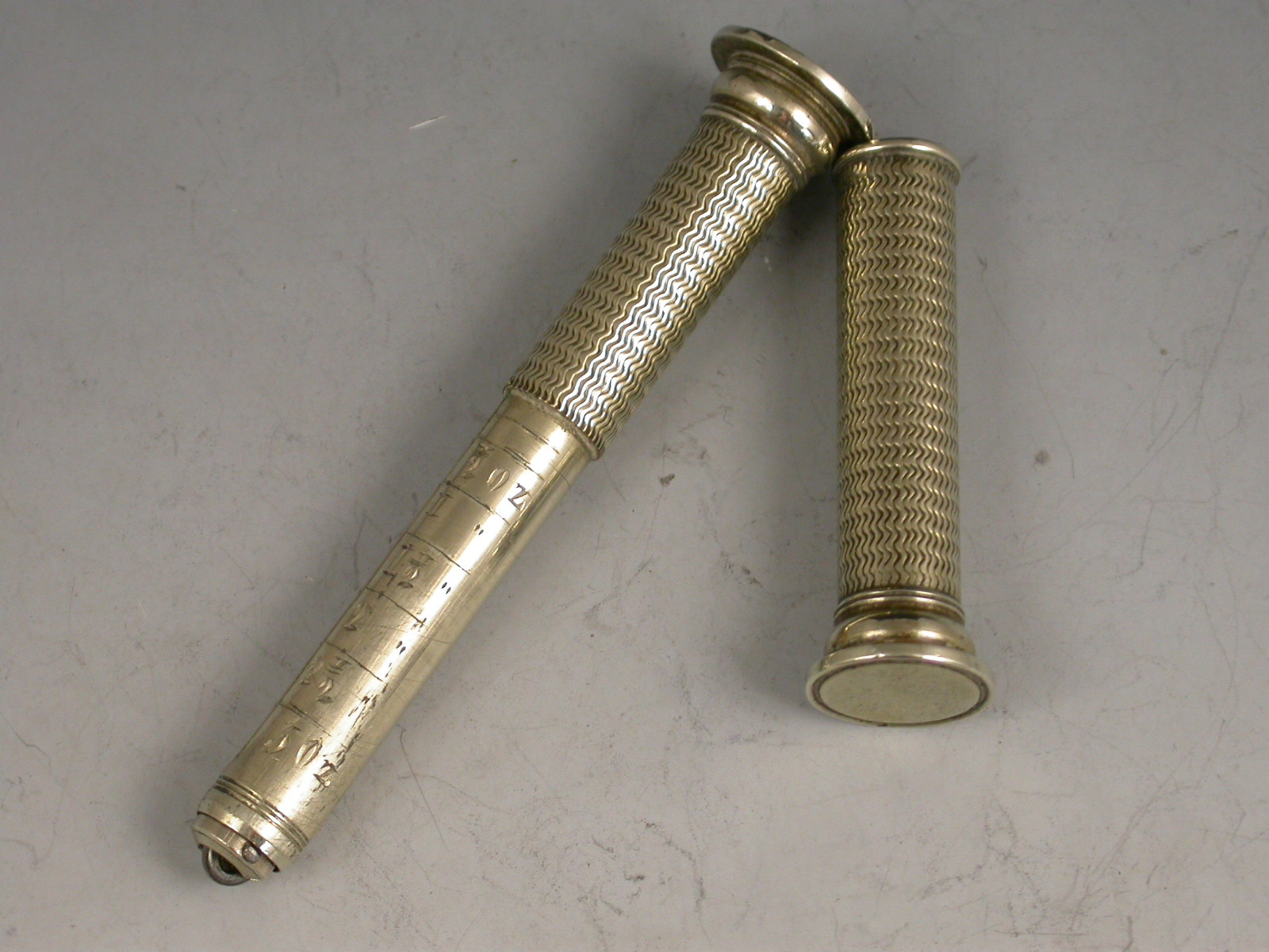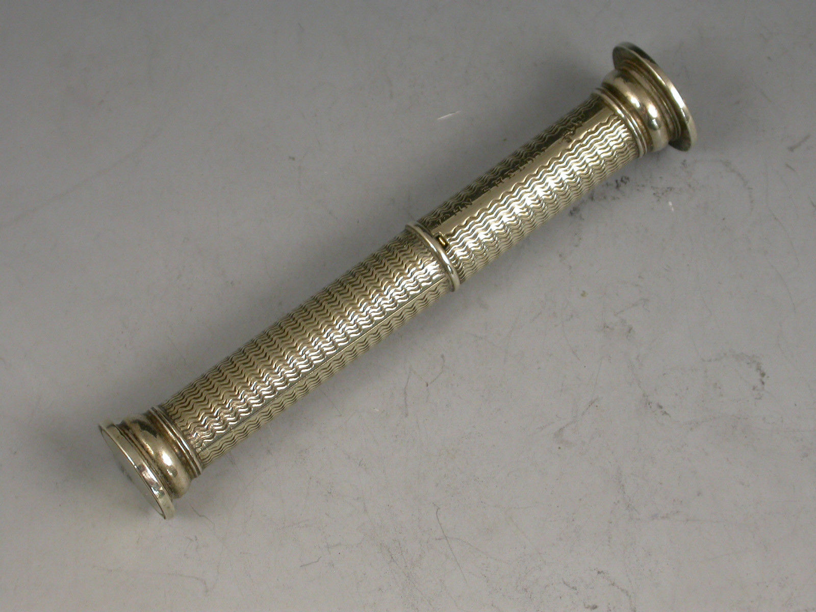 A rare Victorian German silver Pocket Telescope Letter Balance of tubular form, pulling apart at the centre, the body with engine turned decoration, a chequered wafer seal to one end and a plain seal to the other. The scale calibrated in 1/2 ounzes, up to 3 ounzes and 1d to 6d.