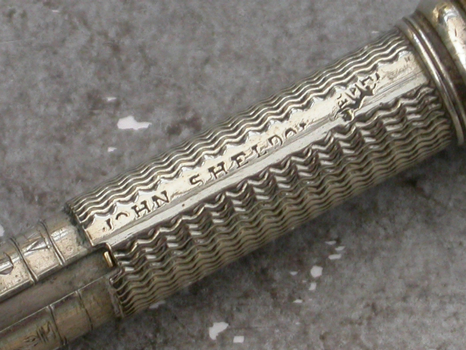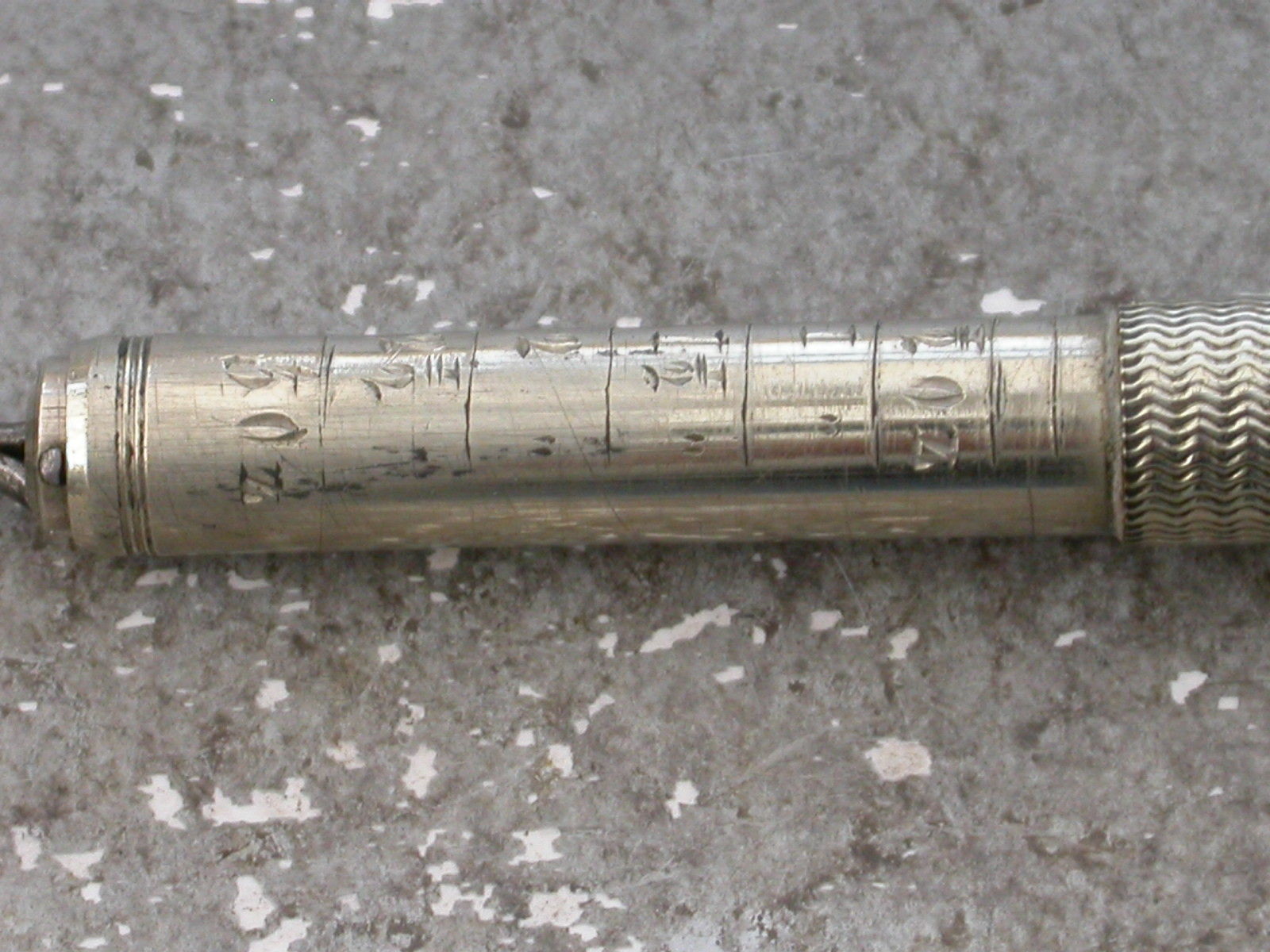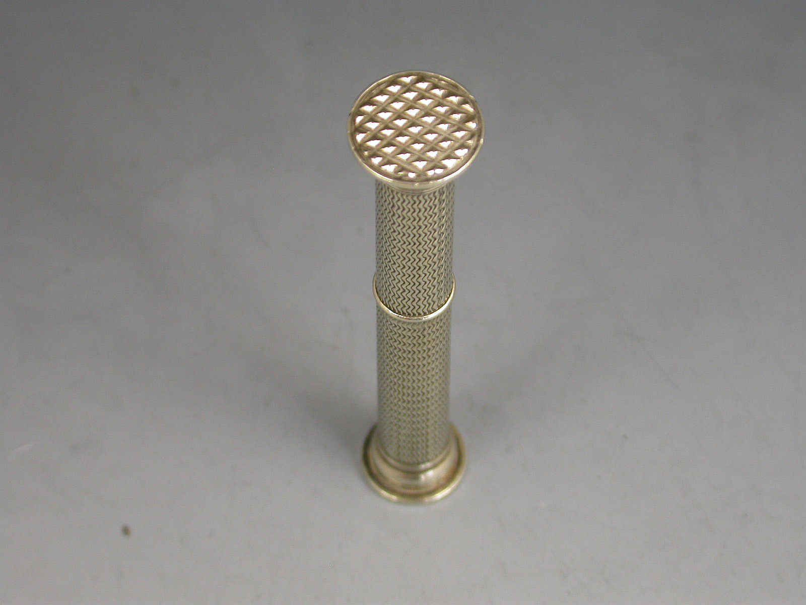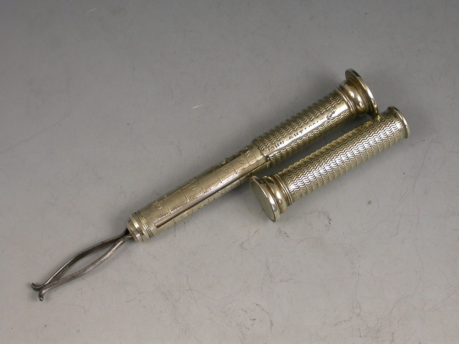 A rare Victorian German silver Pocket Telescope Letter Balance of tubular form, pulling apart at the centre, the body with engine turned decoration, a chequered wafer seal to one end and a plain seal to the other. The scale calibrated in 1/2 ounzes, up to 3 ounzes and 1d to 6d.