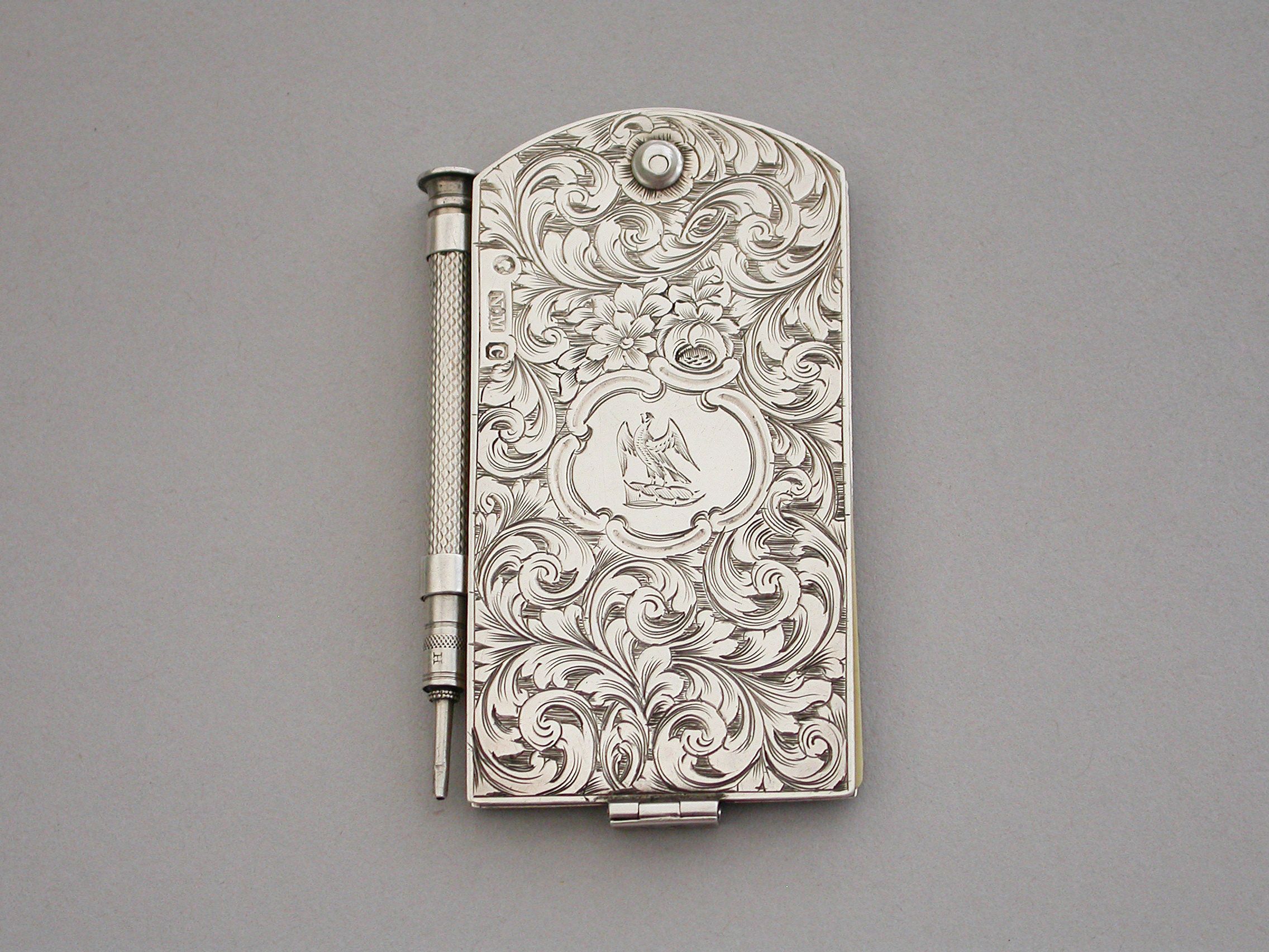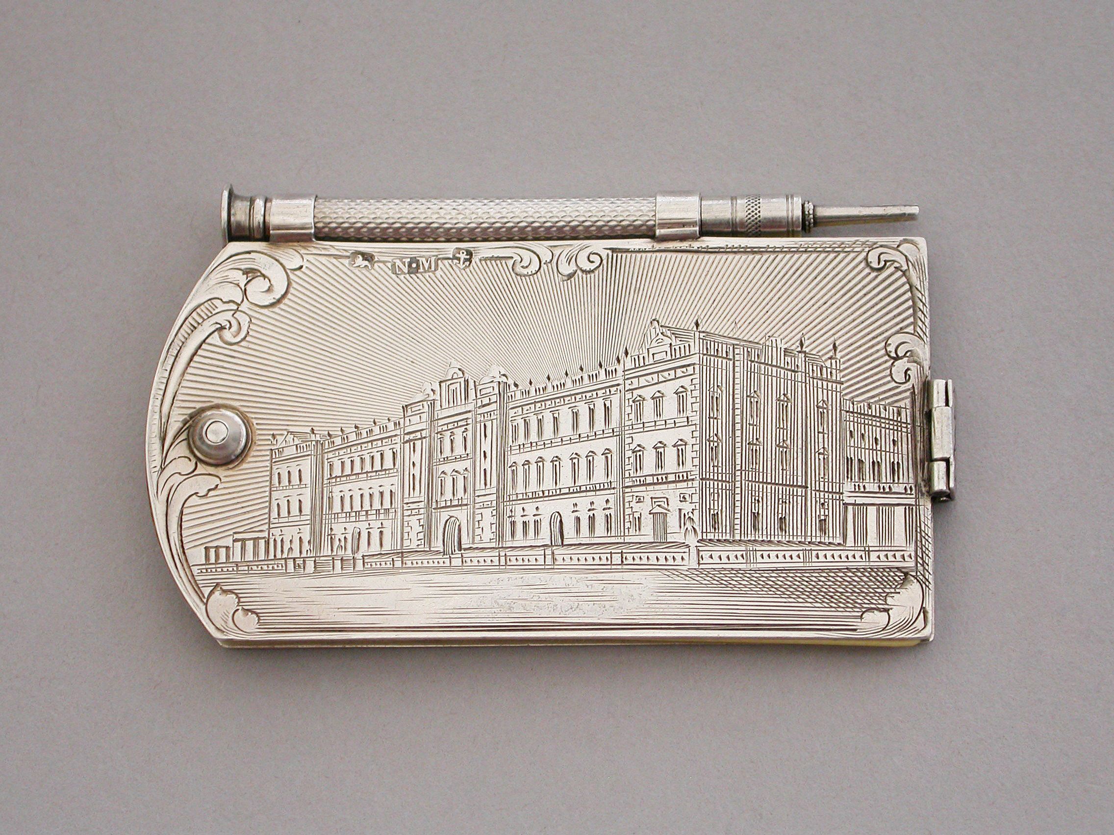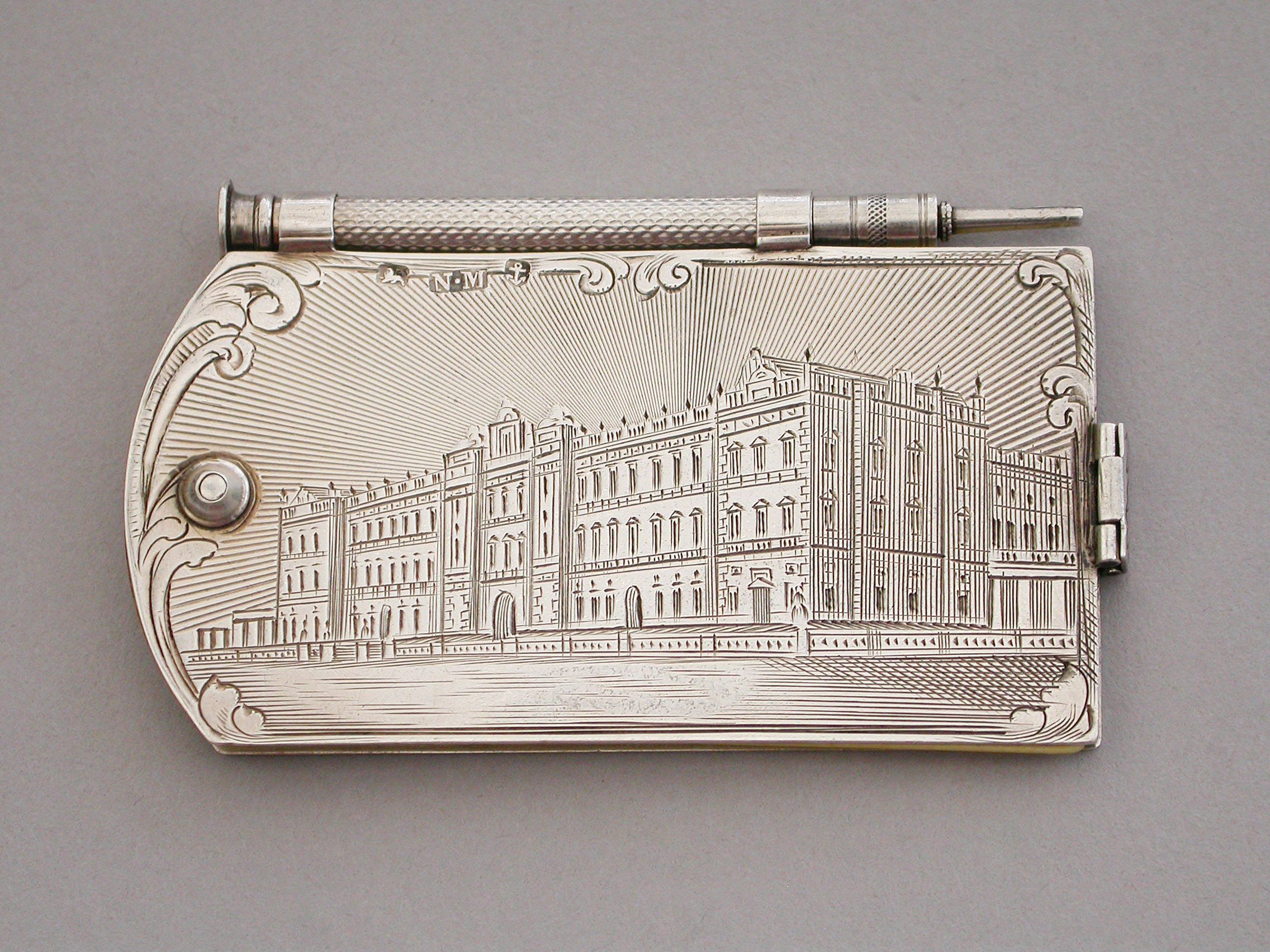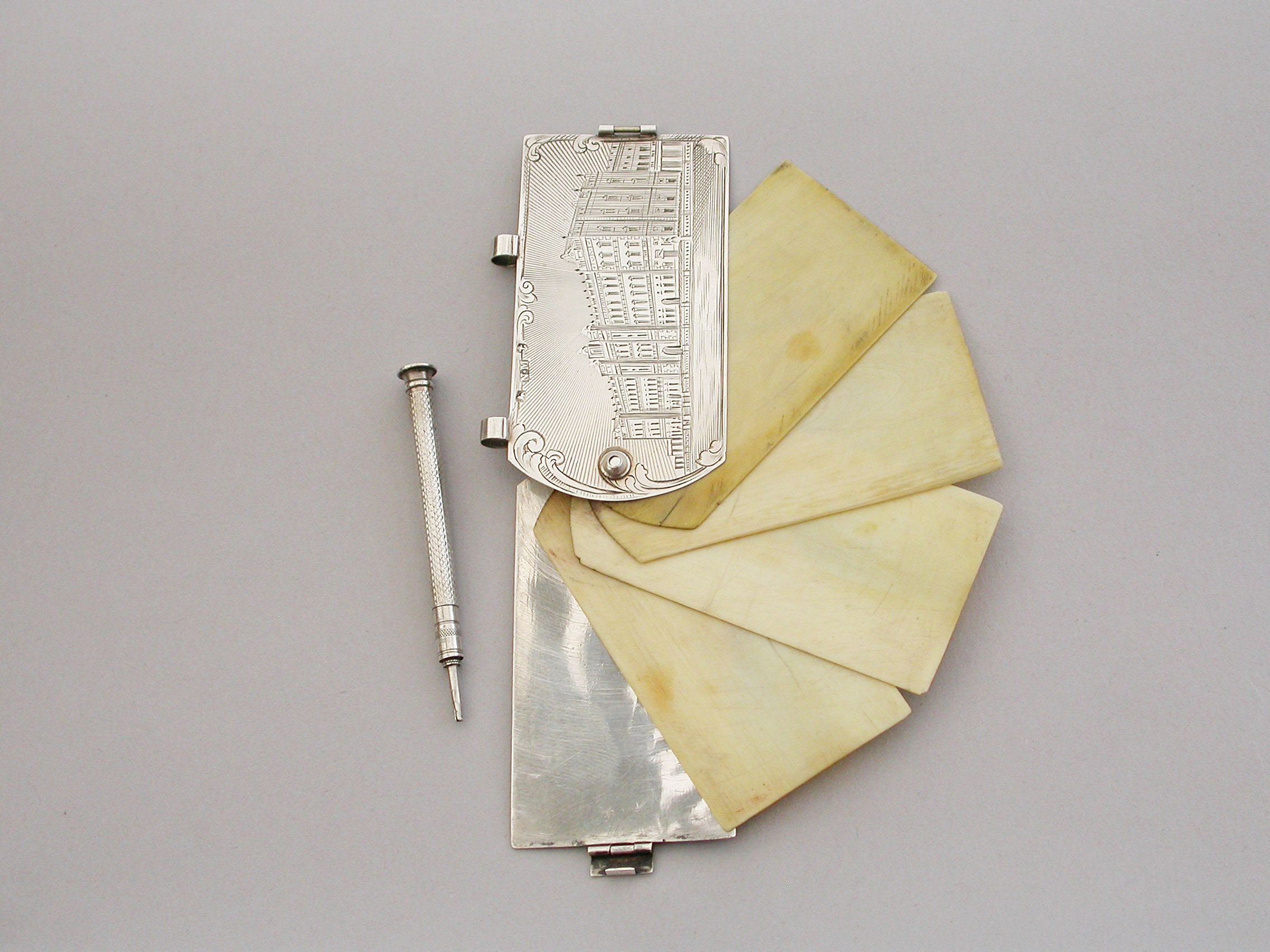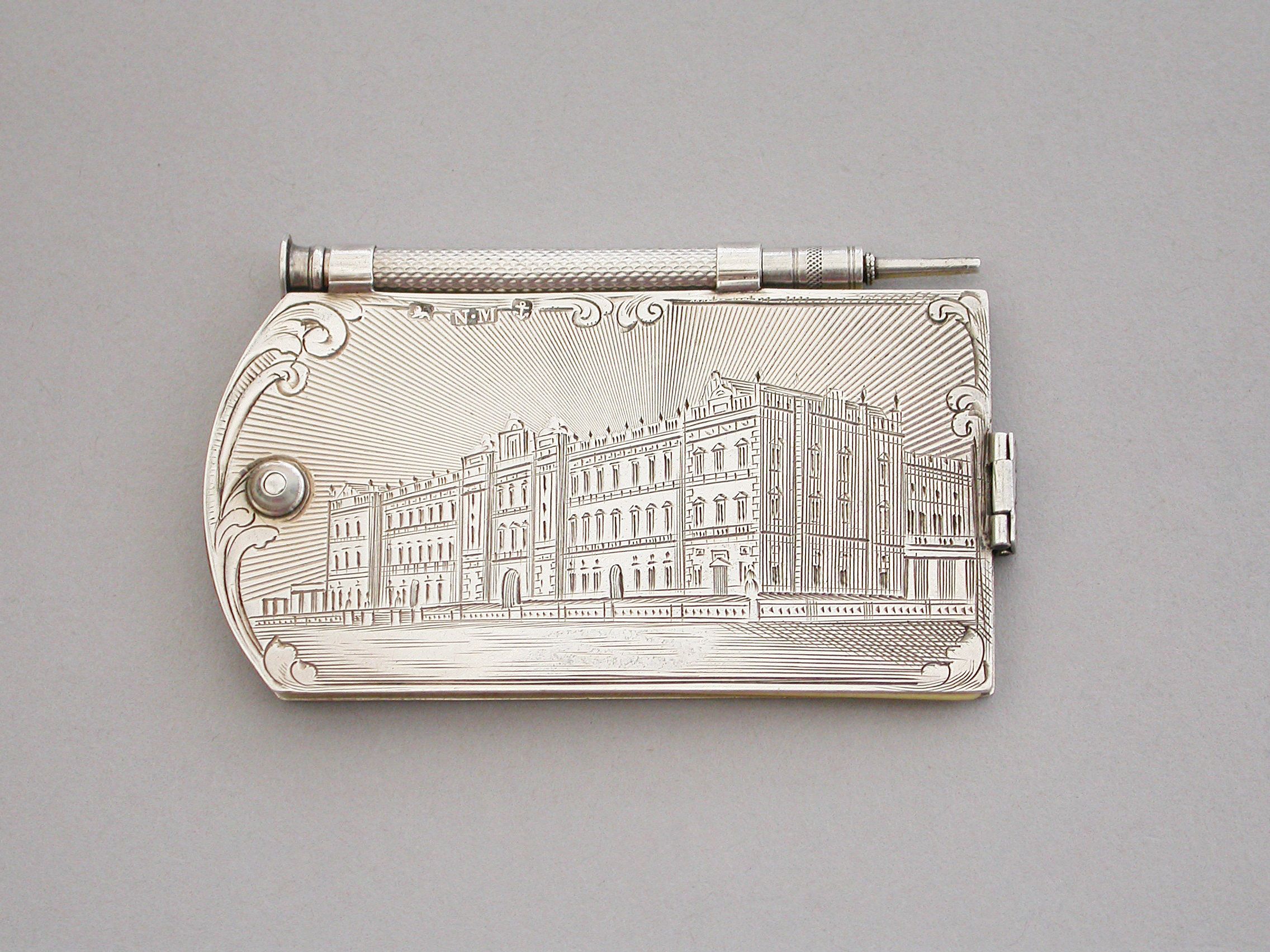 A fine and rare Victorian silver Castle-Top Aide Memoire of rounded rectangular form with hinged clasp closure, an integral silver propelling pencil held within two retaining loops and securing one side, the base with foliate scroll engraved decoration surrounding a shaped cartouche engraved with an armorial crest, the face engraved with a view of Buckingham Palace in London, the whole swiveling open on a central pin and containing four bone leaves.