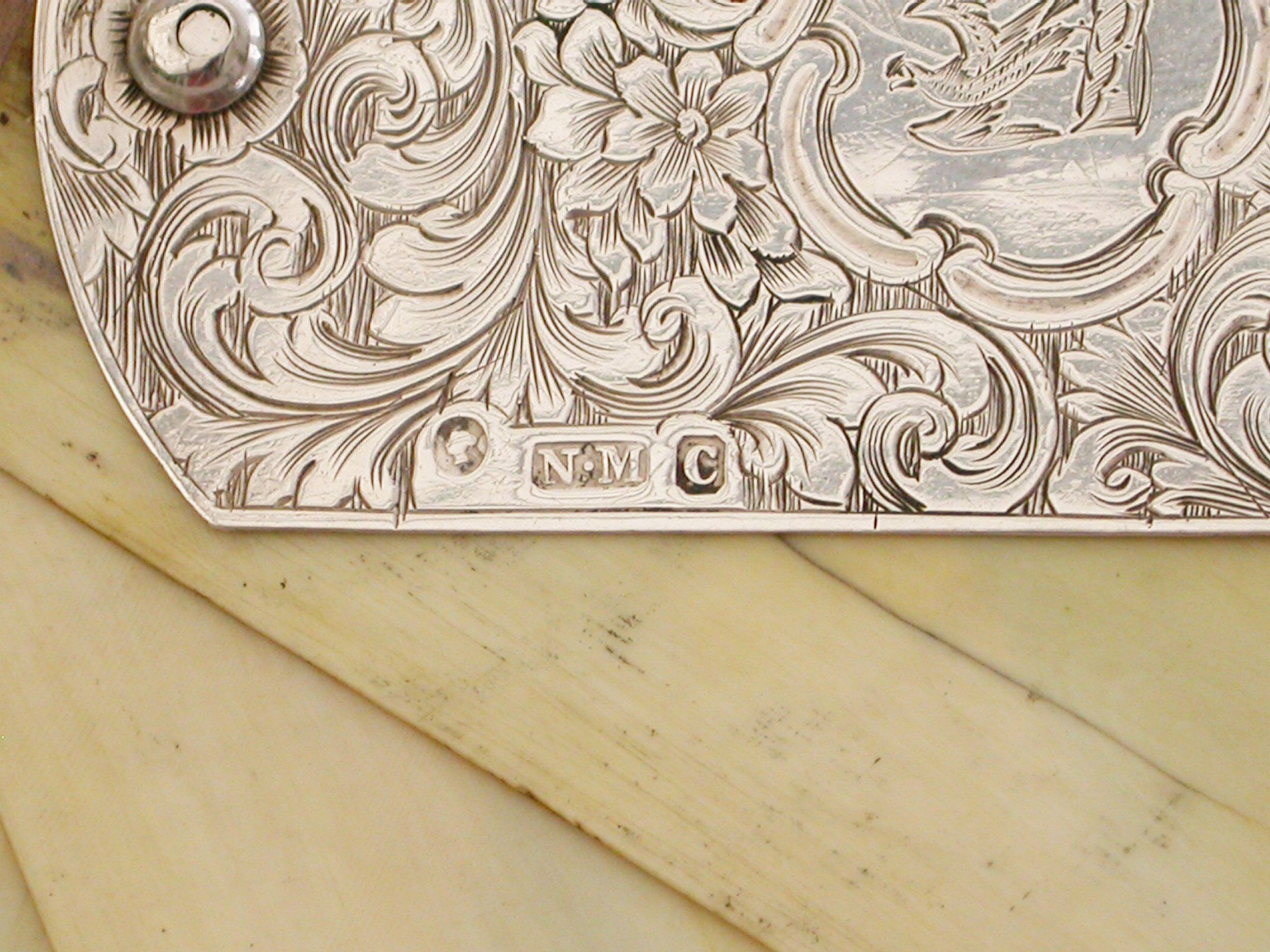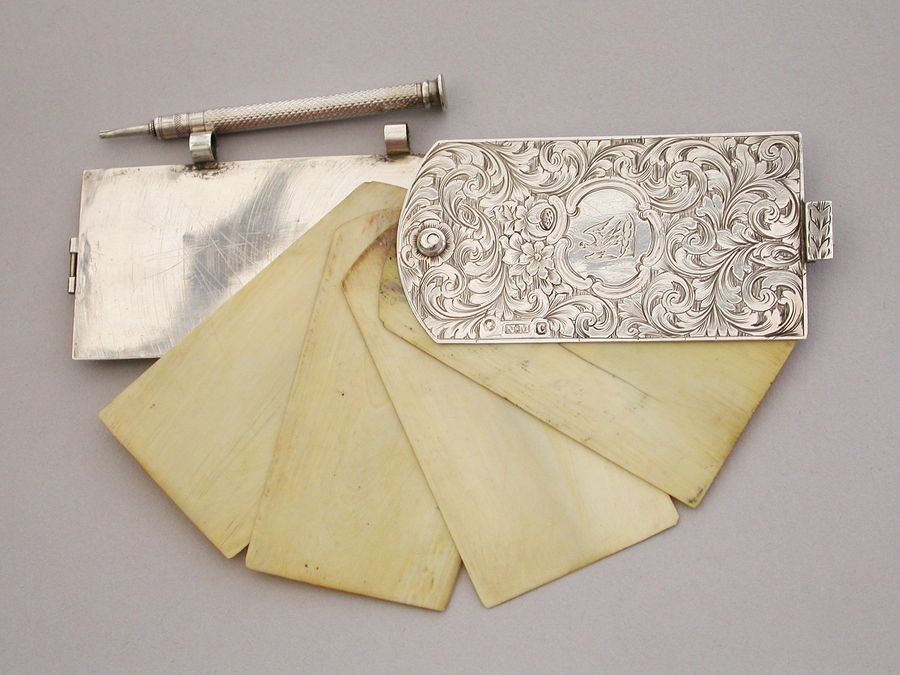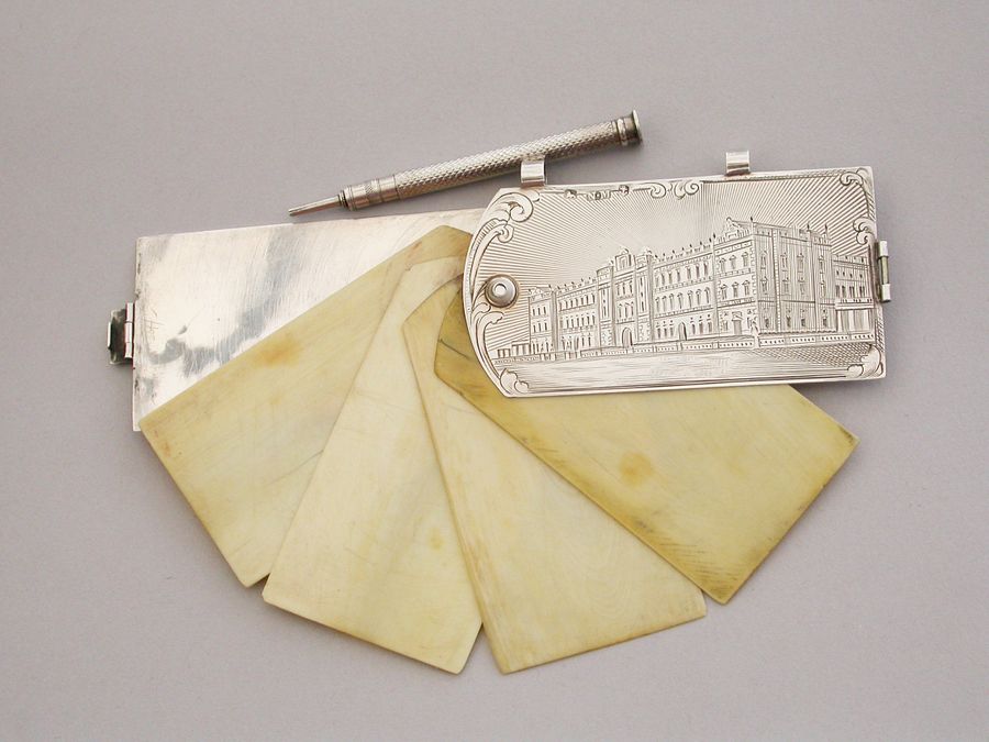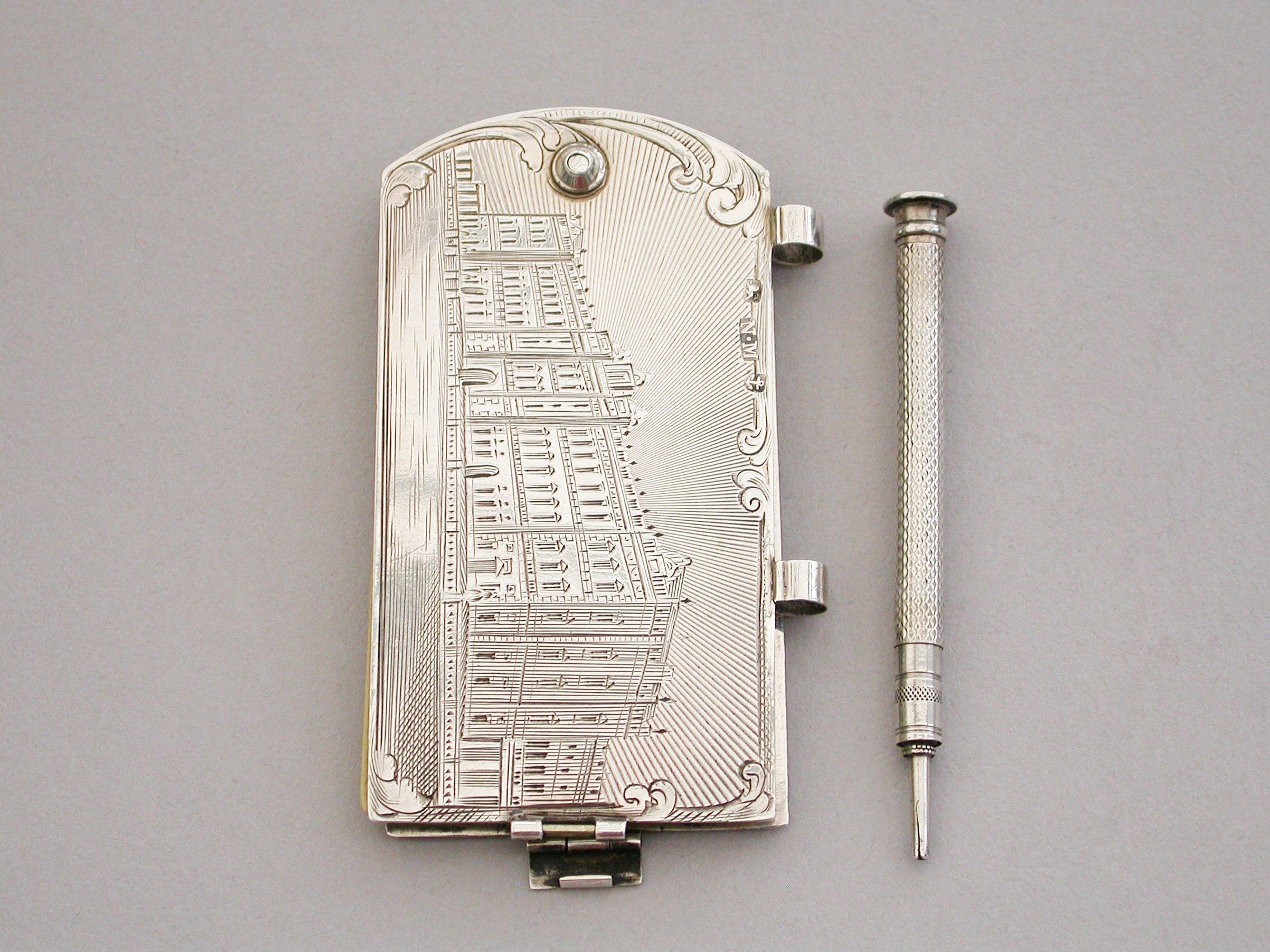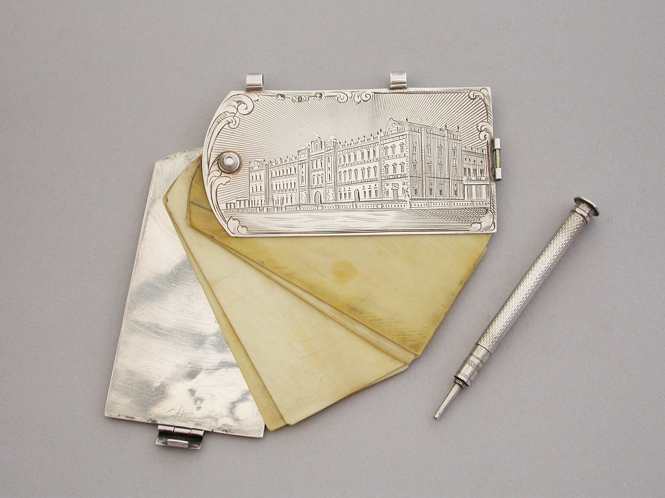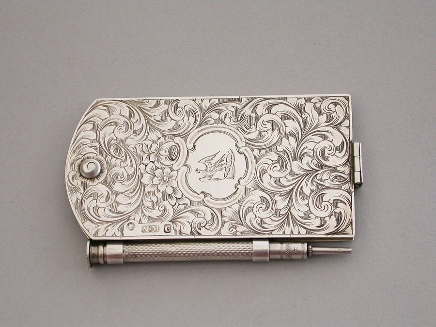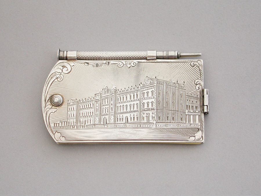 A fine and rare Victorian silver Castle-Top Aide Memoire of rounded rectangular form with hinged clasp closure, an integral silver propelling pencil held within two retaining loops and securing one side, the base with foliate scroll engraved decoration surrounding a shaped cartouche engraved with an armorial crest, the face engraved with a view of Buckingham Palace in London, the whole swiveling open on a central pin and containing four bone leaves.