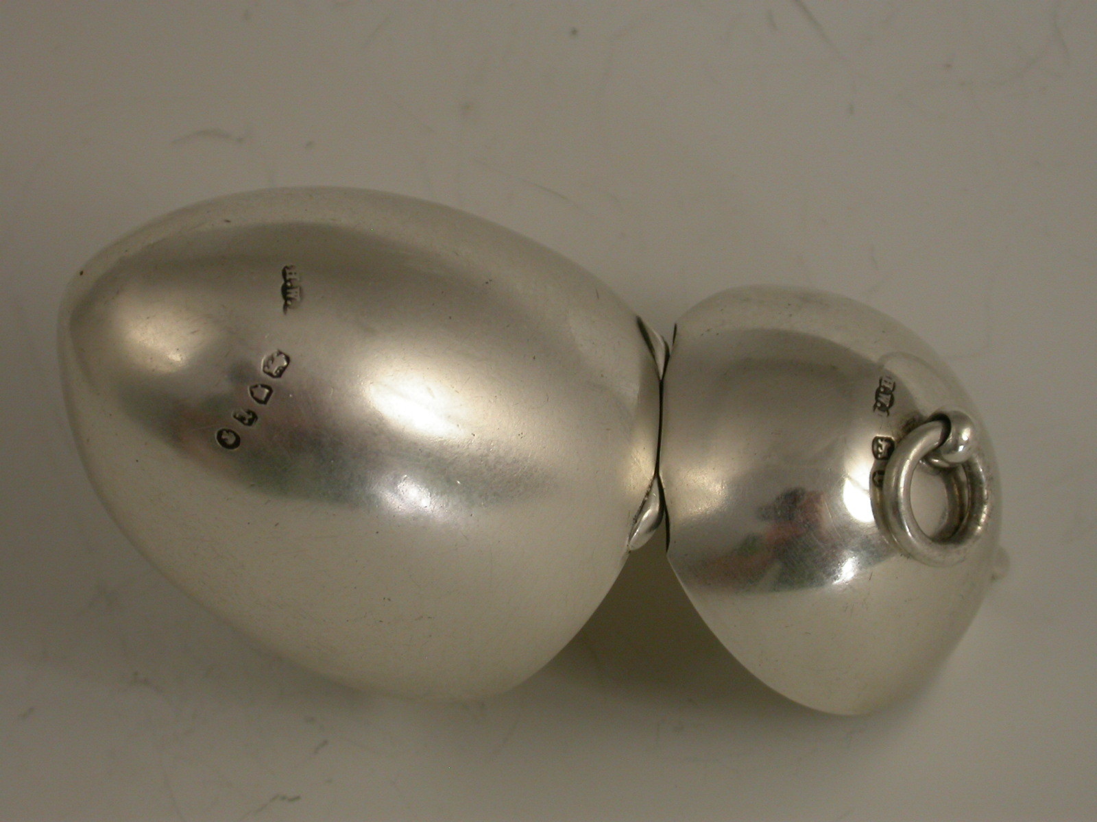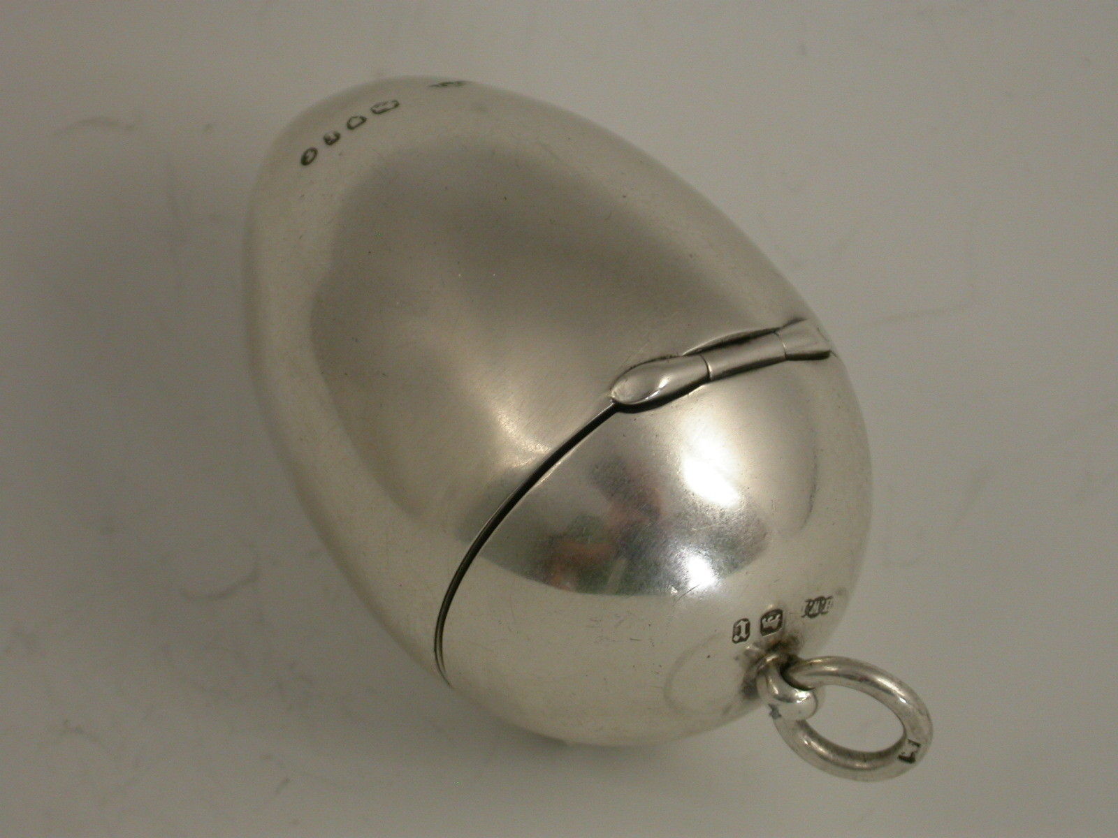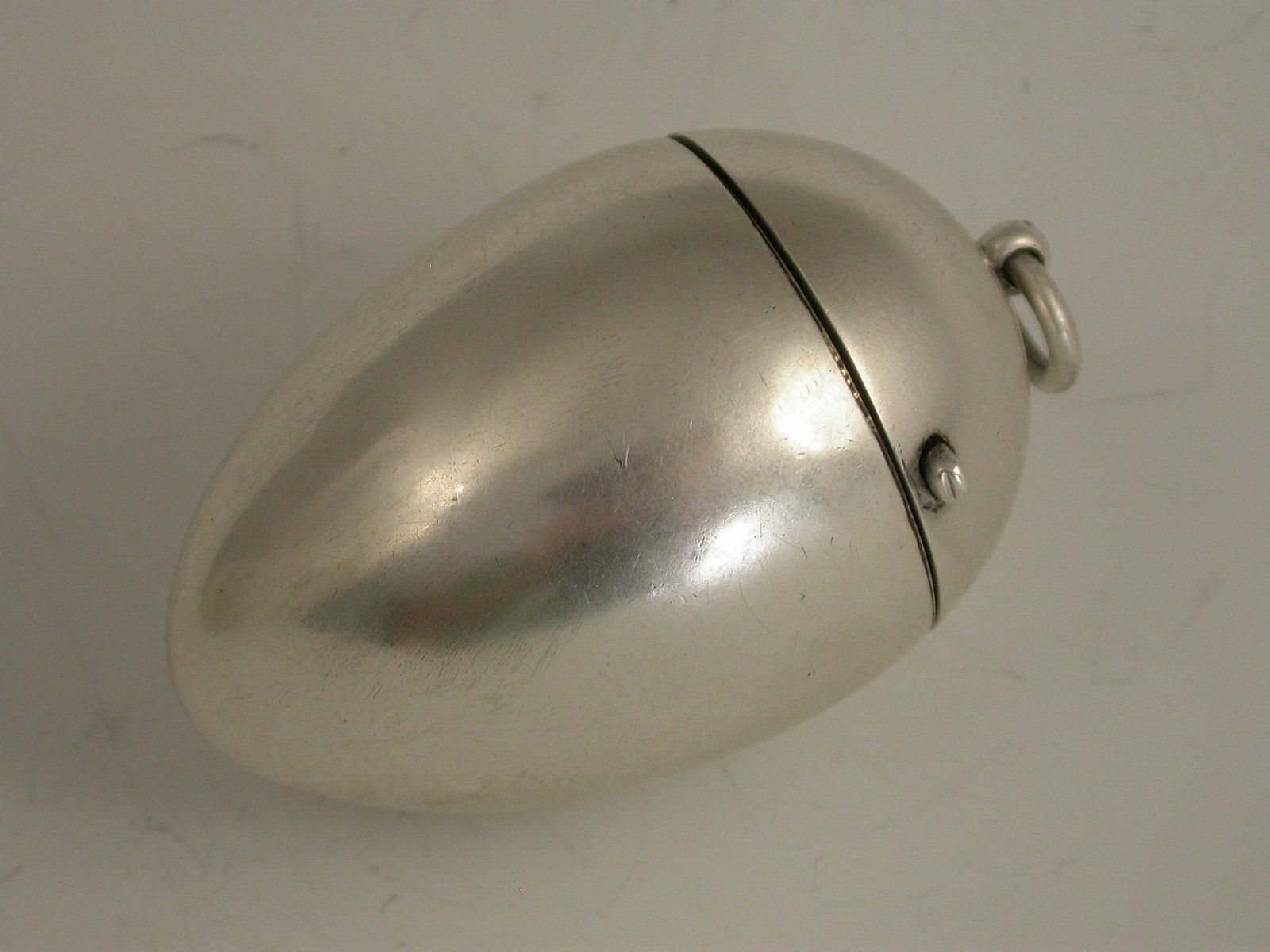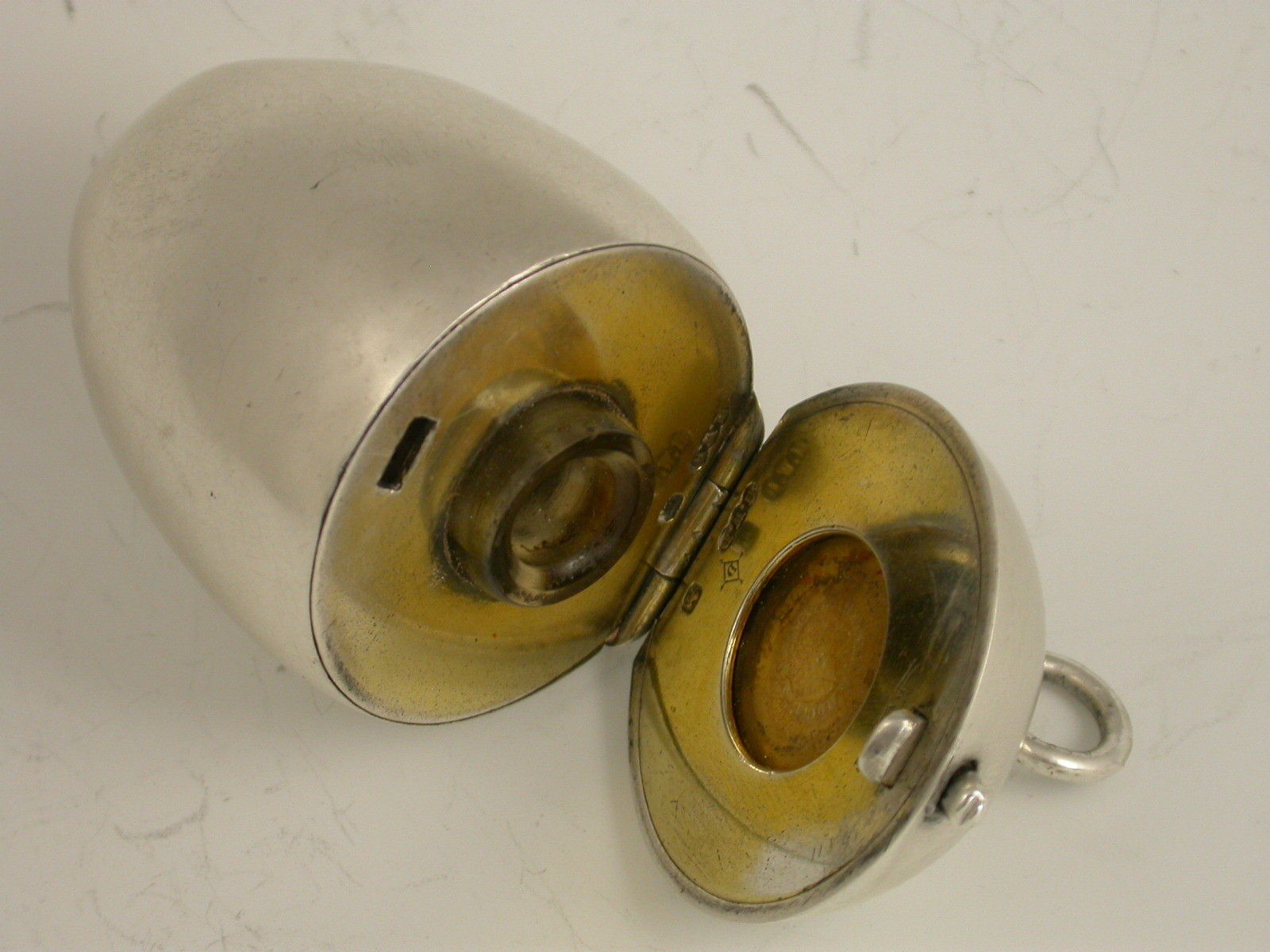A rare and fine quality Victorian silver Scent Bottle made in the form of an egg, with sprung hinged lid and attached suspension ring, the silver gilt interior with a sprung glass plate to the lid, the base housing the interior glass scent bottle.