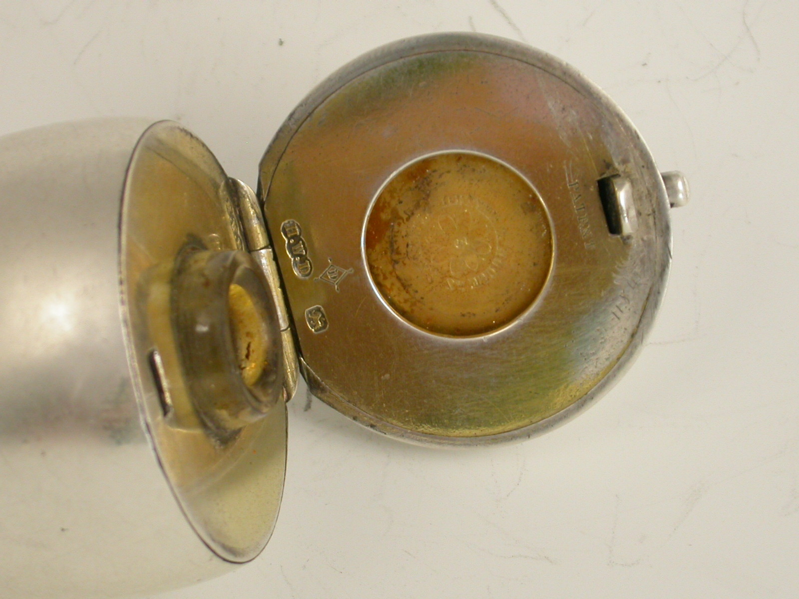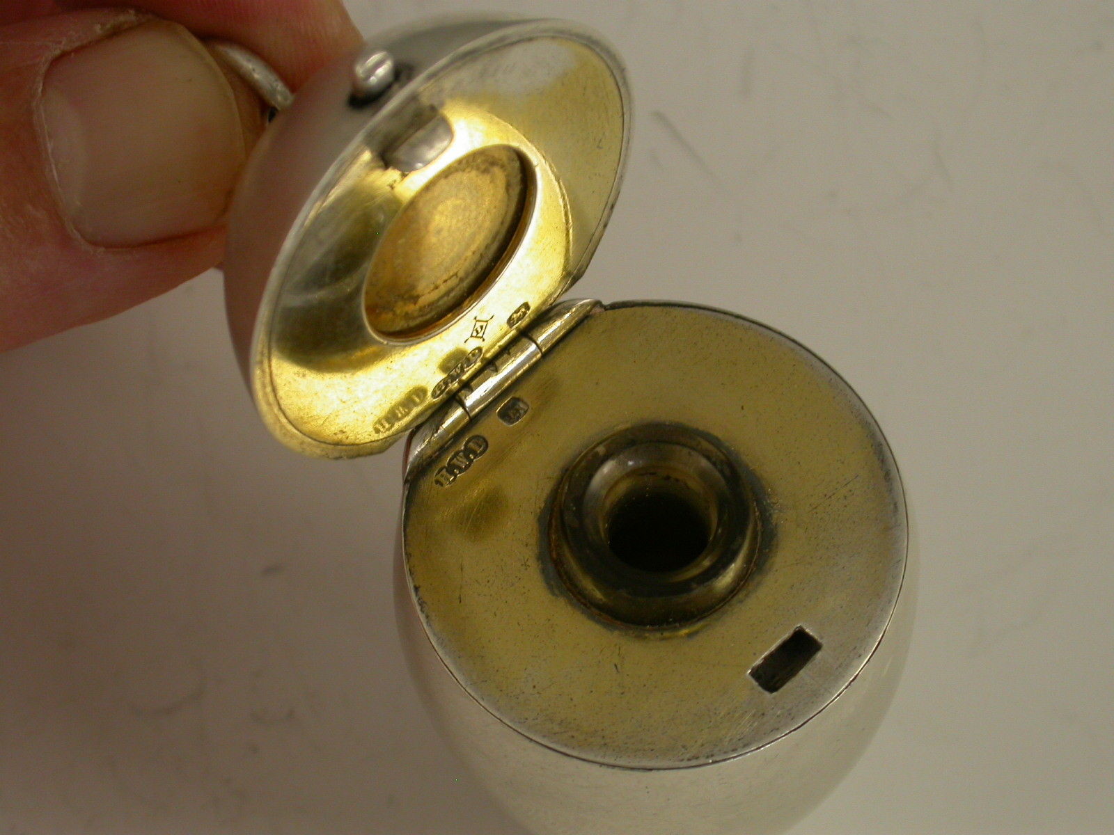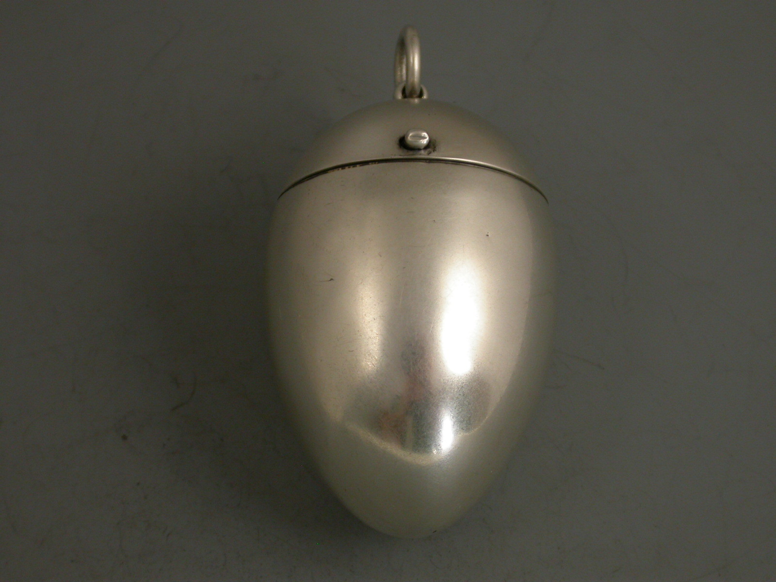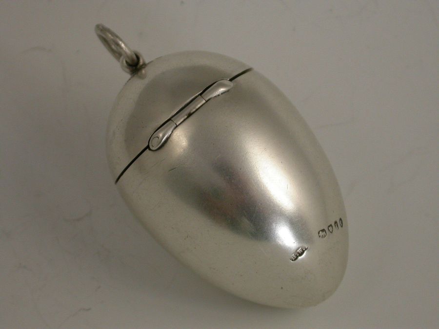 A rare and fine quality Victorian silver Scent Bottle made in the form of an egg, with sprung hinged lid and attached suspension ring, the silver gilt interior with a sprung glass plate to the lid, the base housing the interior glass scent bottle.