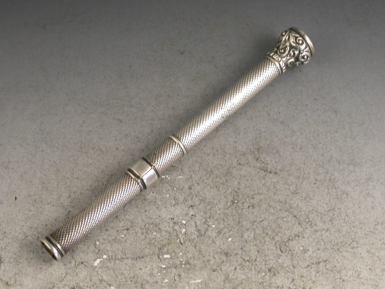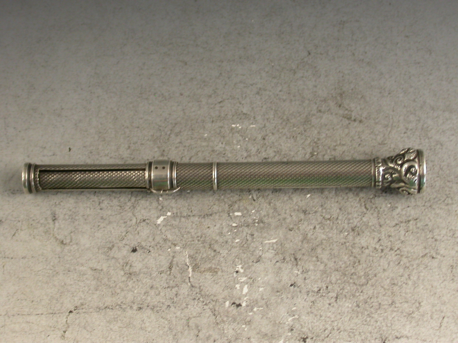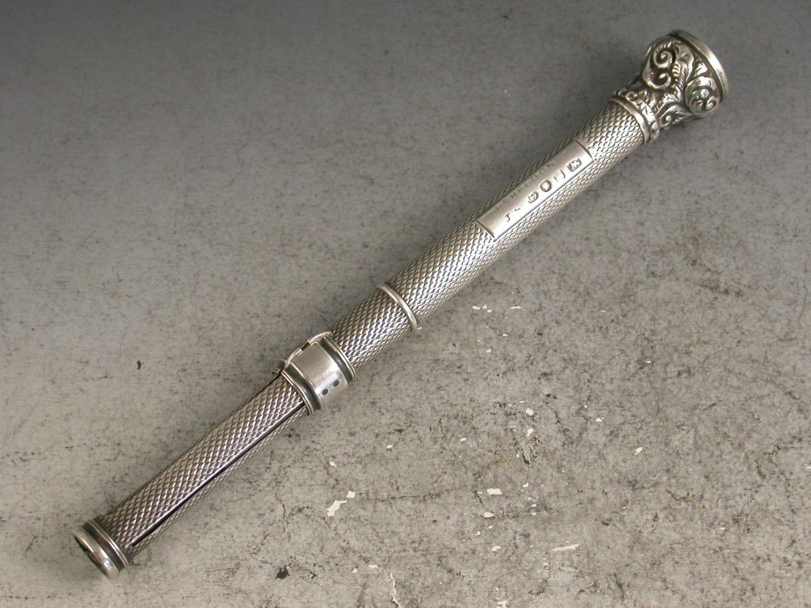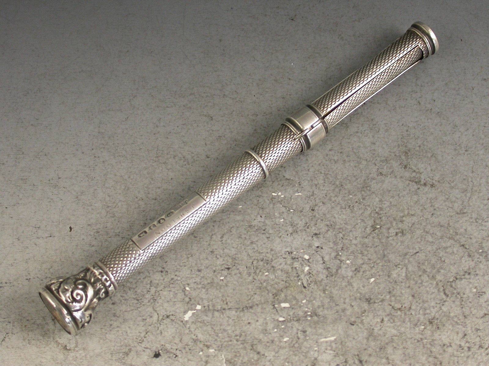An extremely rare Victorian silver Patent ""Unique Pocket Companion"" with engine turned decoration to the body. The pocket companion comprises at one end, a slide out steel pen holder, a pencil and a pen knife. At the opposite end the terminal is inset with a citrine coloured seal stone and unscrews to reveal a lead reservoir. The case also unscrews at the centre to reveal the letter and coin balance which is graduated 1/4T to 11/2T and 1/4 ounce to 1 ounce. The ""T"" stands for Tola to measure Rupees and along with the Knife Blade rather than the more usual coin gauge, indicates that this version of the Unique Pocket Companion was made by Sheldon for use in the East Indies (other versions were also produced for use in America, France & Belgium with different scales)