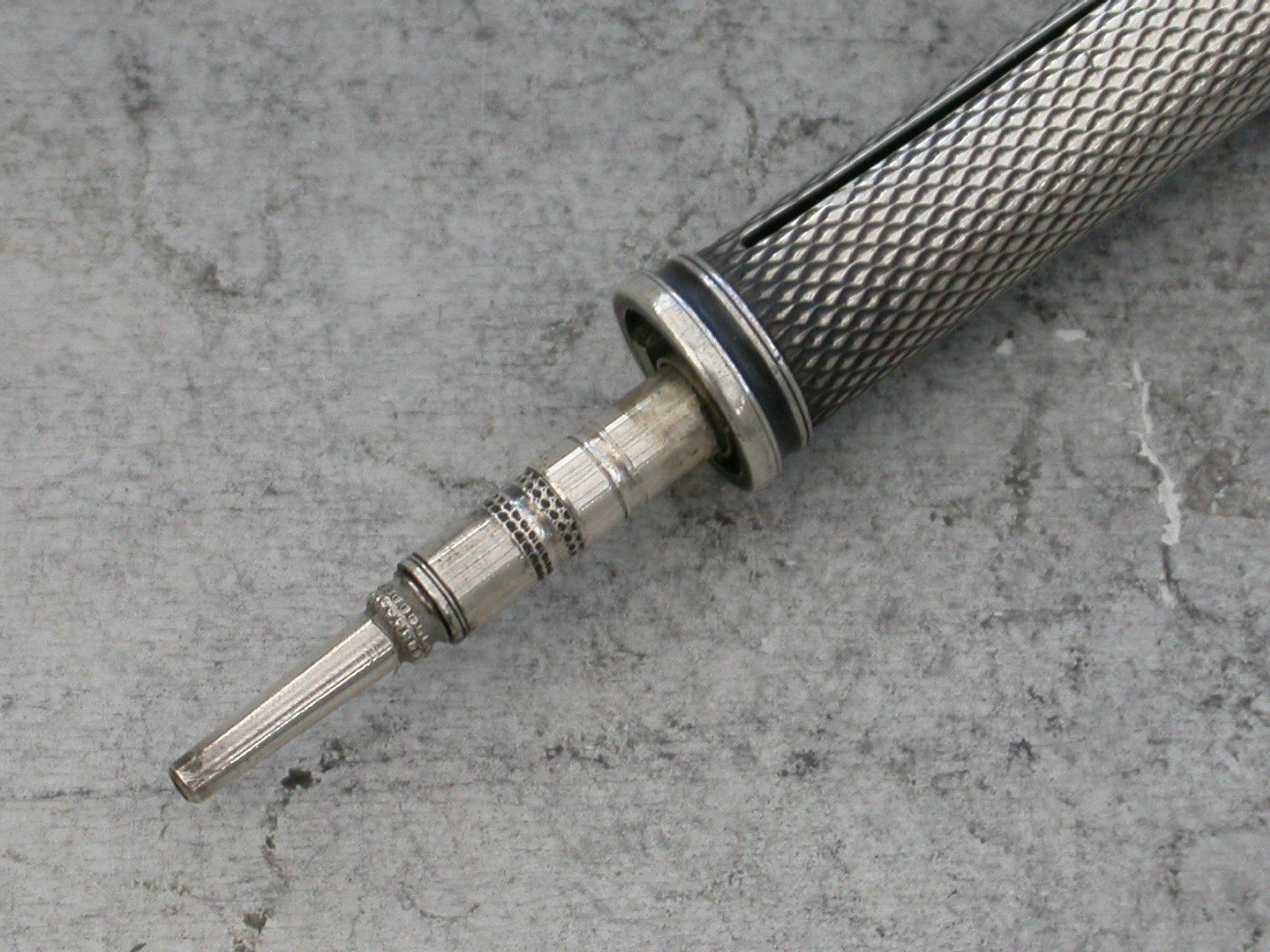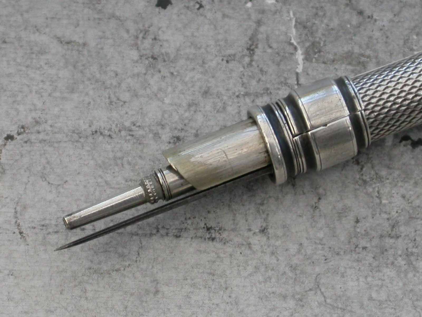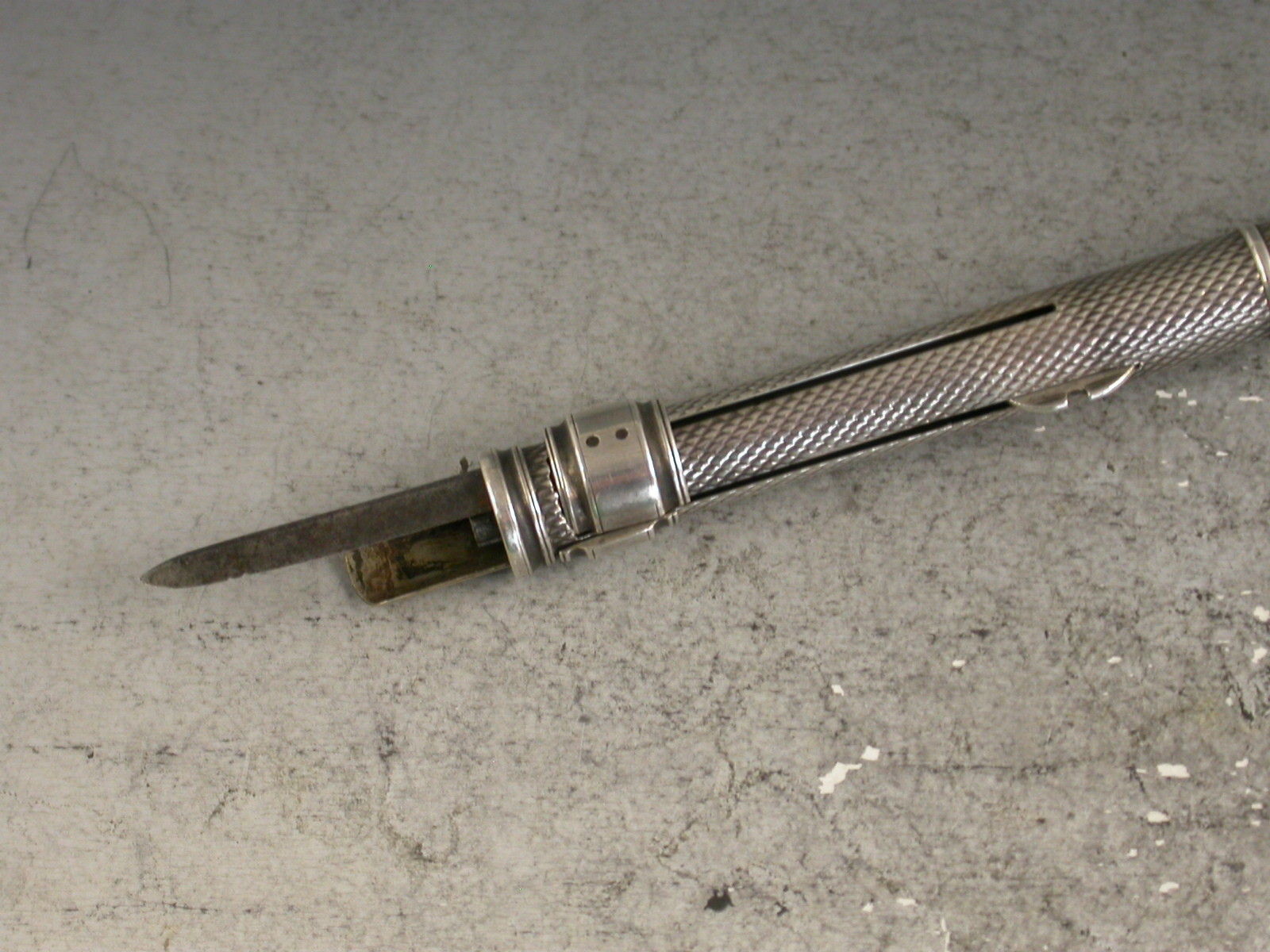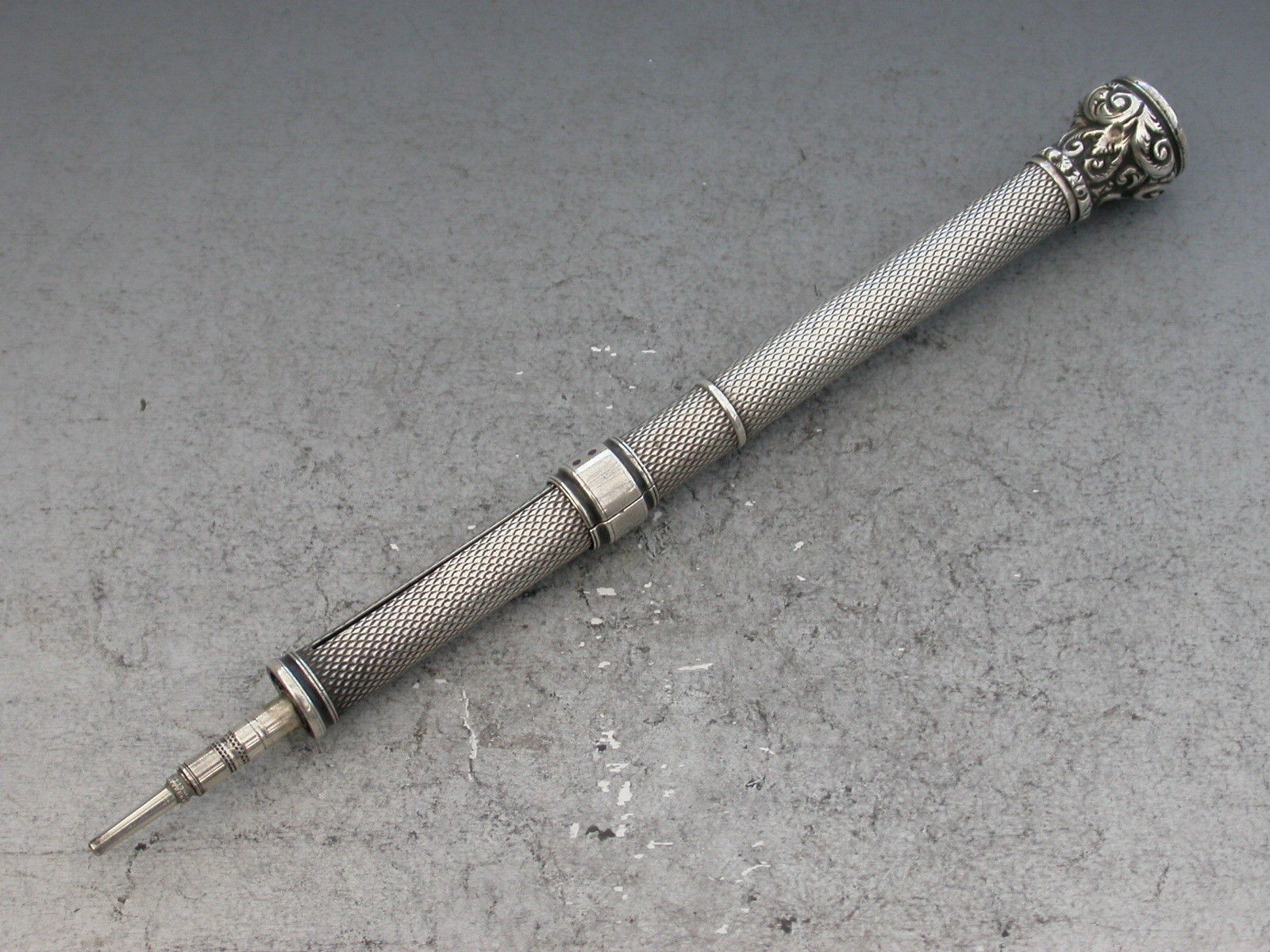 An extremely rare Victorian silver Patent ""Unique Pocket Companion"" with engine turned decoration to the body. The pocket companion comprises at one end, a slide out steel pen holder, a pencil and a pen knife. At the opposite end the terminal is inset with a citrine coloured seal stone and unscrews to reveal a lead reservoir. The case also unscrews at the centre to reveal the letter and coin balance which is graduated 1/4T to 11/2T and 1/4 ounce to 1 ounce. The ""T"" stands for Tola to measure Rupees and along with the Knife Blade rather than the more usual coin gauge, indicates that this version of the Unique Pocket Companion was made by Sheldon for use in the East Indies (other versions were also produced for use in America, France & Belgium with different scales)