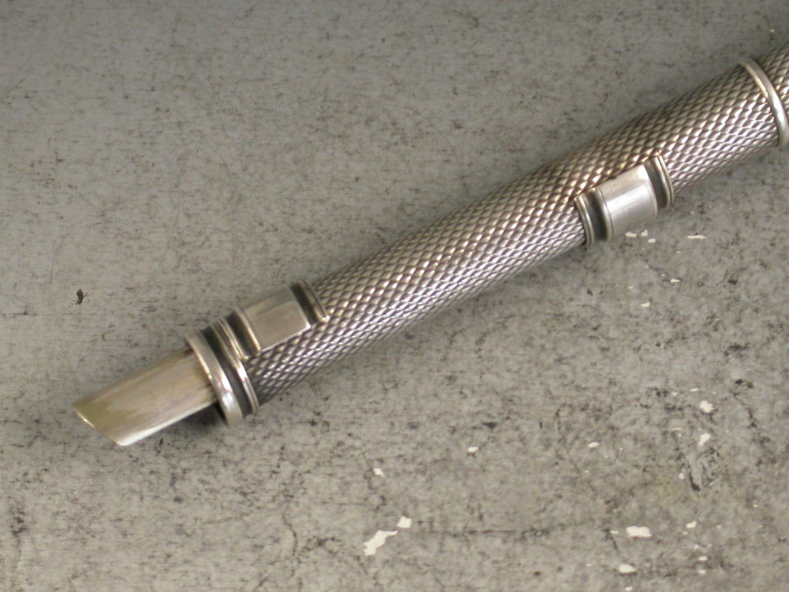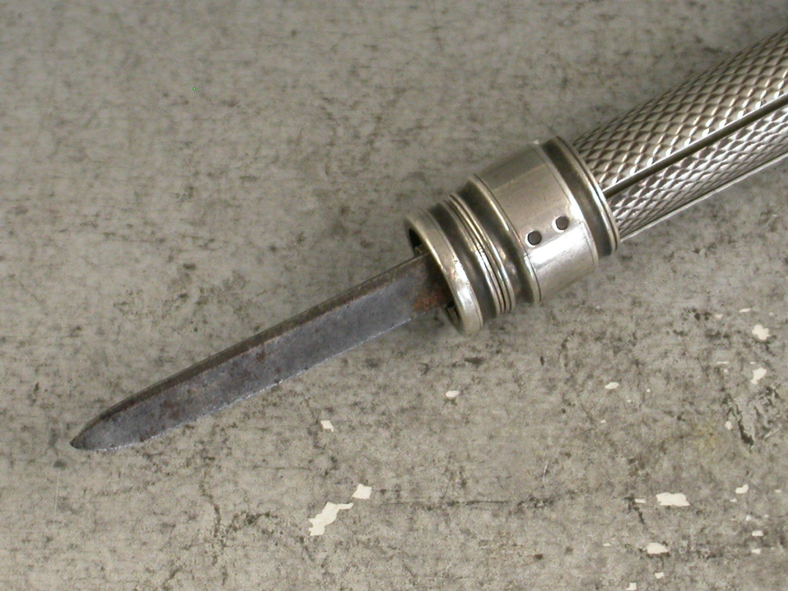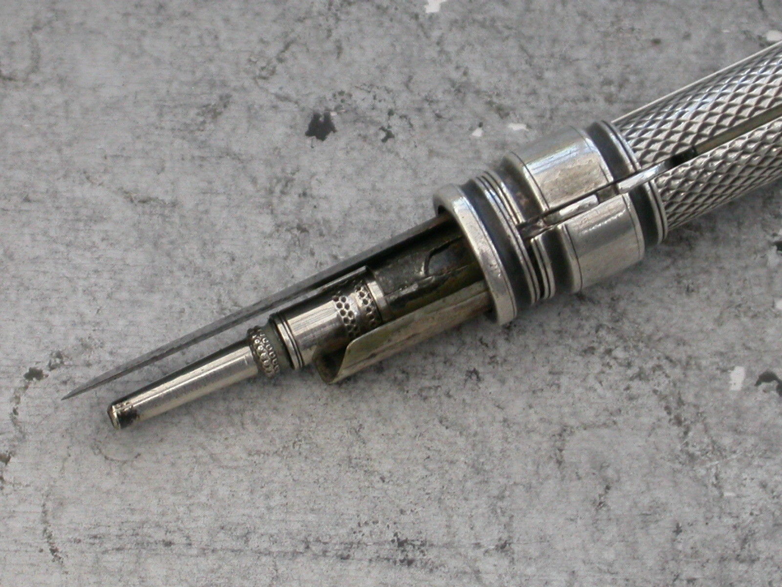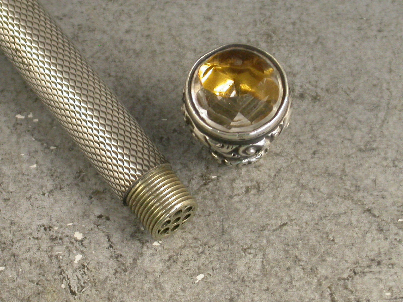 An extremely rare Victorian silver Patent ""Unique Pocket Companion"" with engine turned decoration to the body. The pocket companion comprises at one end, a slide out steel pen holder, a pencil and a pen knife. At the opposite end the terminal is inset with a citrine coloured seal stone and unscrews to reveal a lead reservoir. The case also unscrews at the centre to reveal the letter and coin balance which is graduated 1/4T to 11/2T and 1/4 ounce to 1 ounce. The ""T"" stands for Tola to measure Rupees and along with the Knife Blade rather than the more usual coin gauge, indicates that this version of the Unique Pocket Companion was made by Sheldon for use in the East Indies (other versions were also produced for use in America, France & Belgium with different scales)