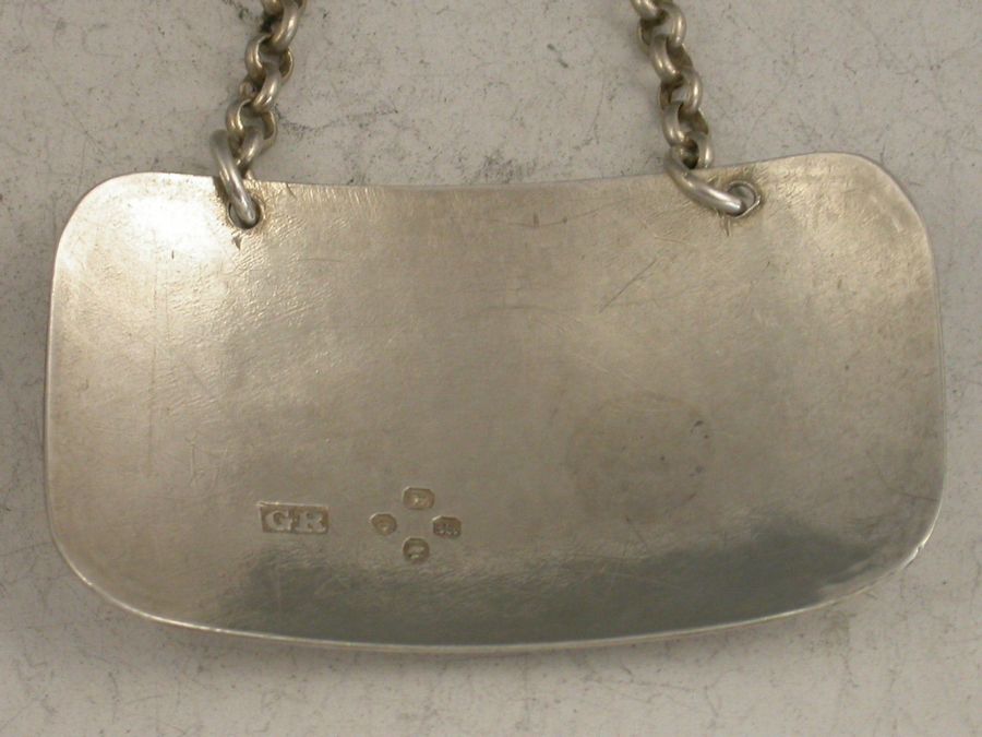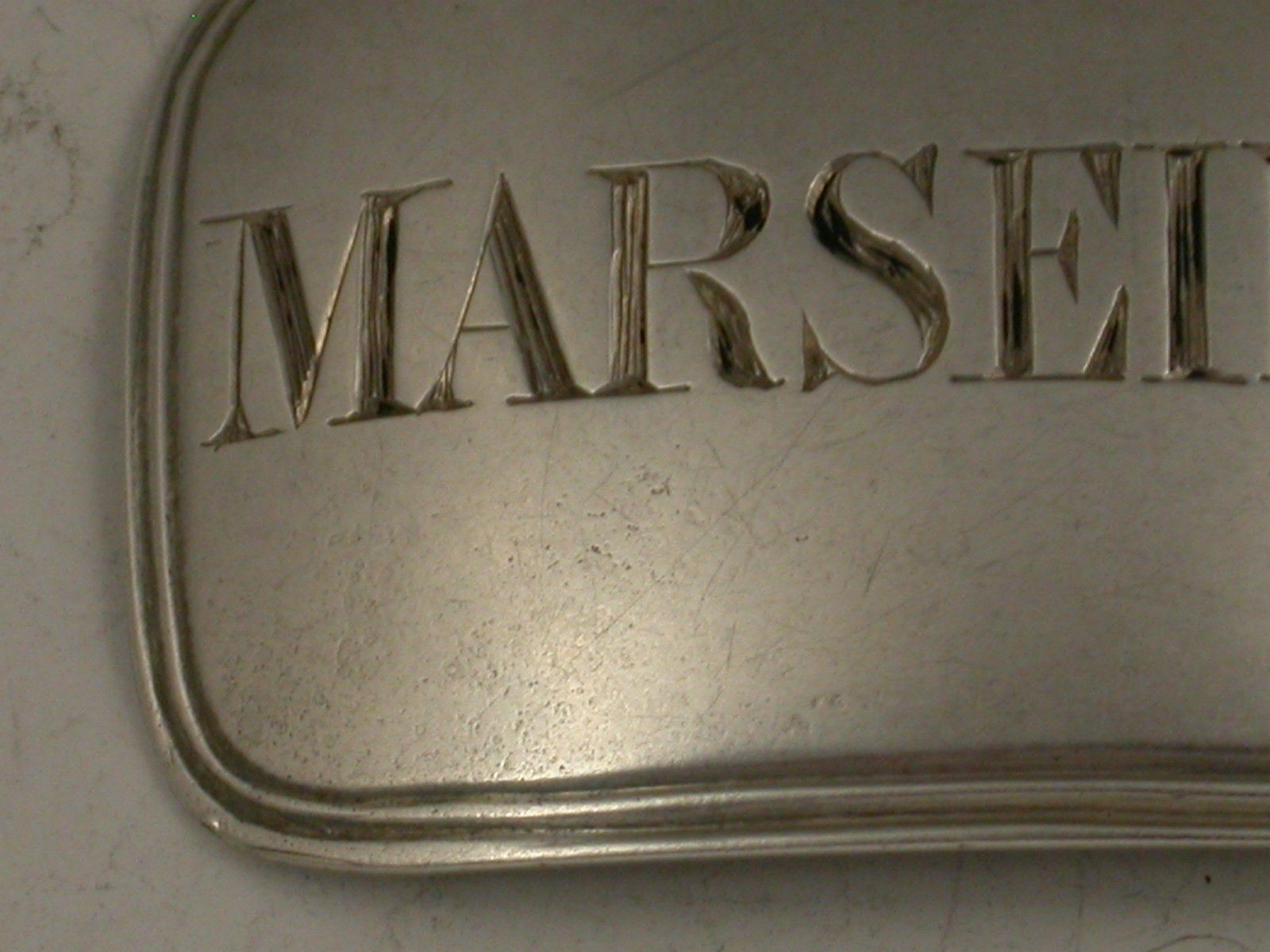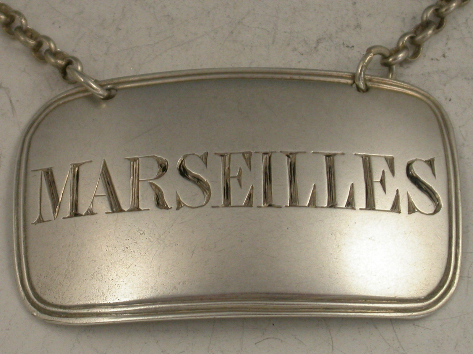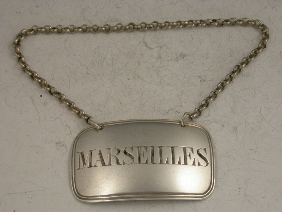 A rare Victorian silver Wine Label of broad rounded rectangular form with double thread border, incised for Marseilles. (Probably a misspelling of Marsala).