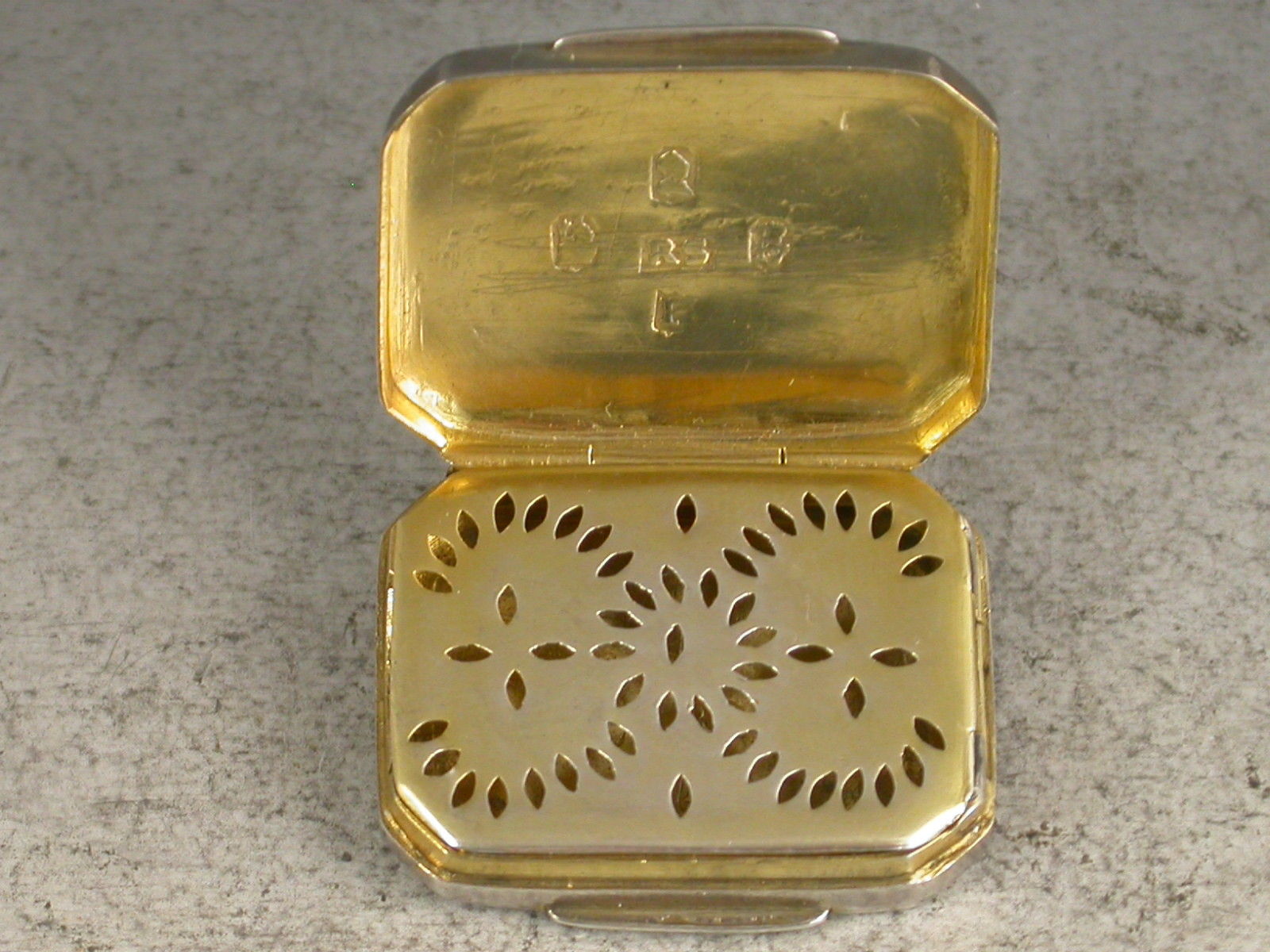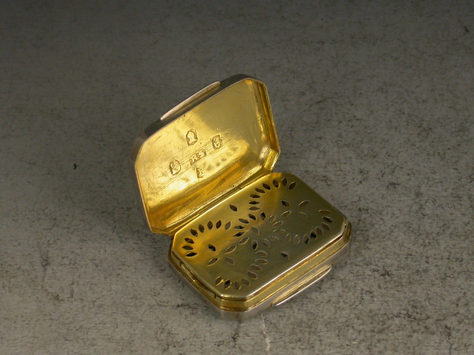 An extremely rare William IV Irish silver Vinaigrette of very plain flat rectangular form with canted corners, the silver gilt interior with a simply pierced hinged grill.