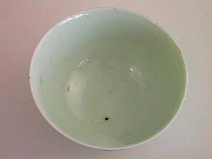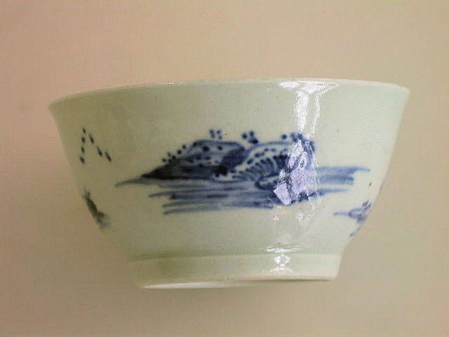 A good Richard Chaffers miniature Liverpool Teabowl, finely painted in underglaze blue with an island scene, trees issuing from rocks and telegraph poles on the side of a hill and a flock of flying birds.