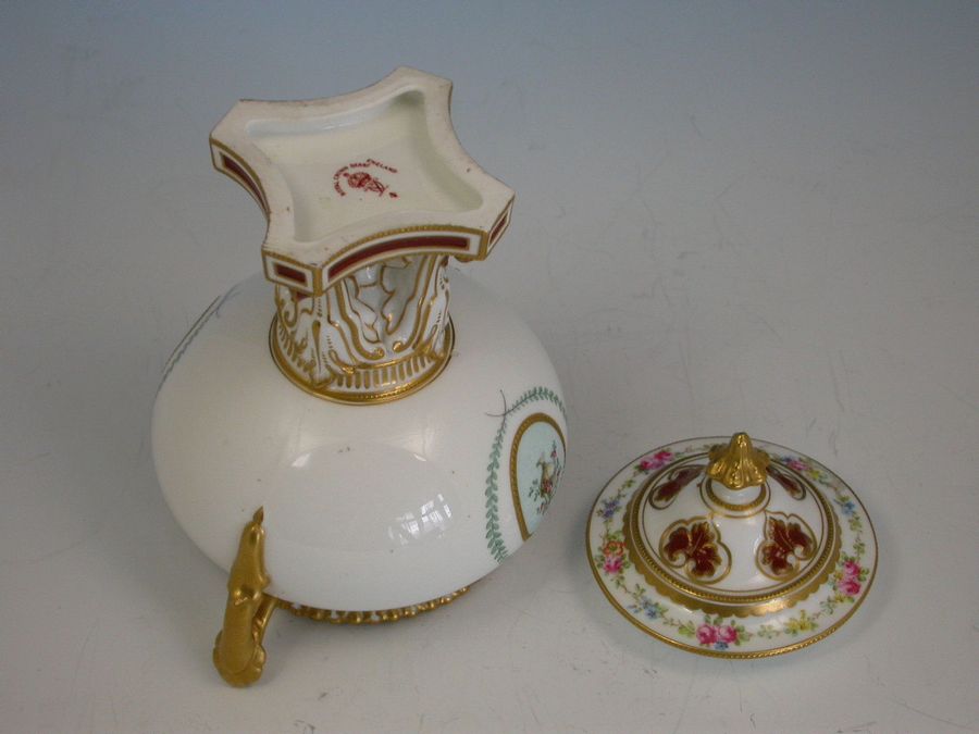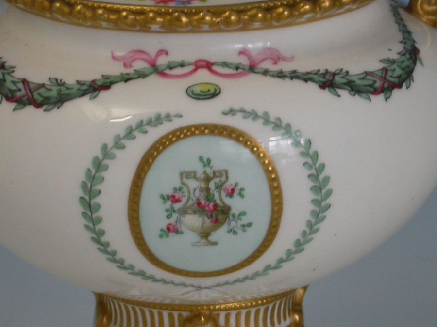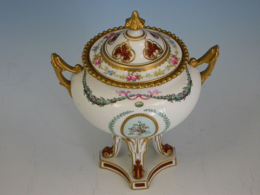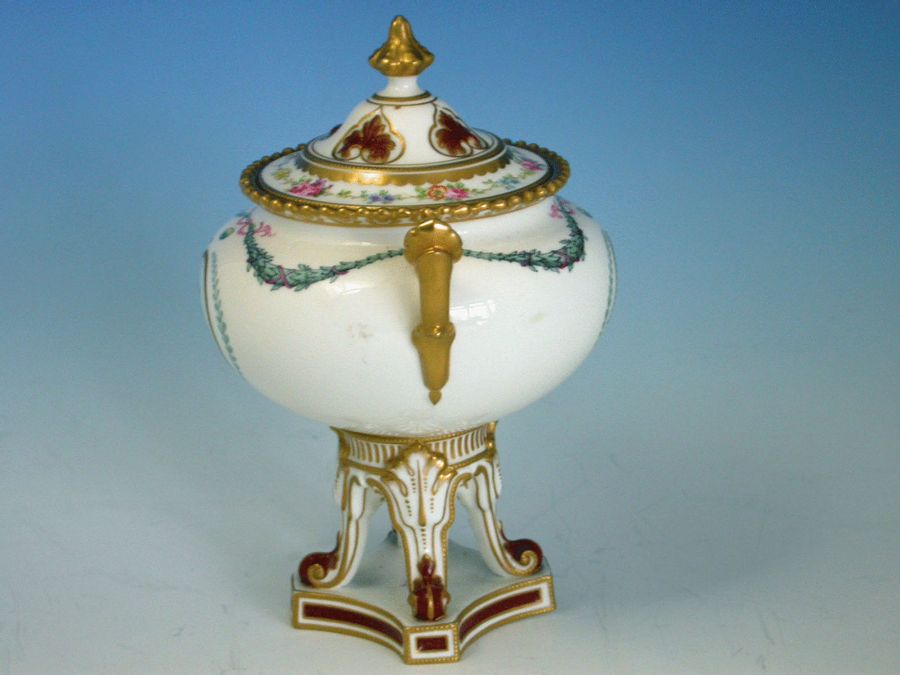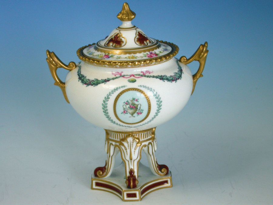 A fine Royal Crown Derby urn shaped Vase and Cover, the bulbous body with applied gilt scroll handles, painted with turquoise vignettes enriched with floral urns, gilt gadrooned rims, on a gilt enriched quadruple scrolled base, gilt jeweled platform.