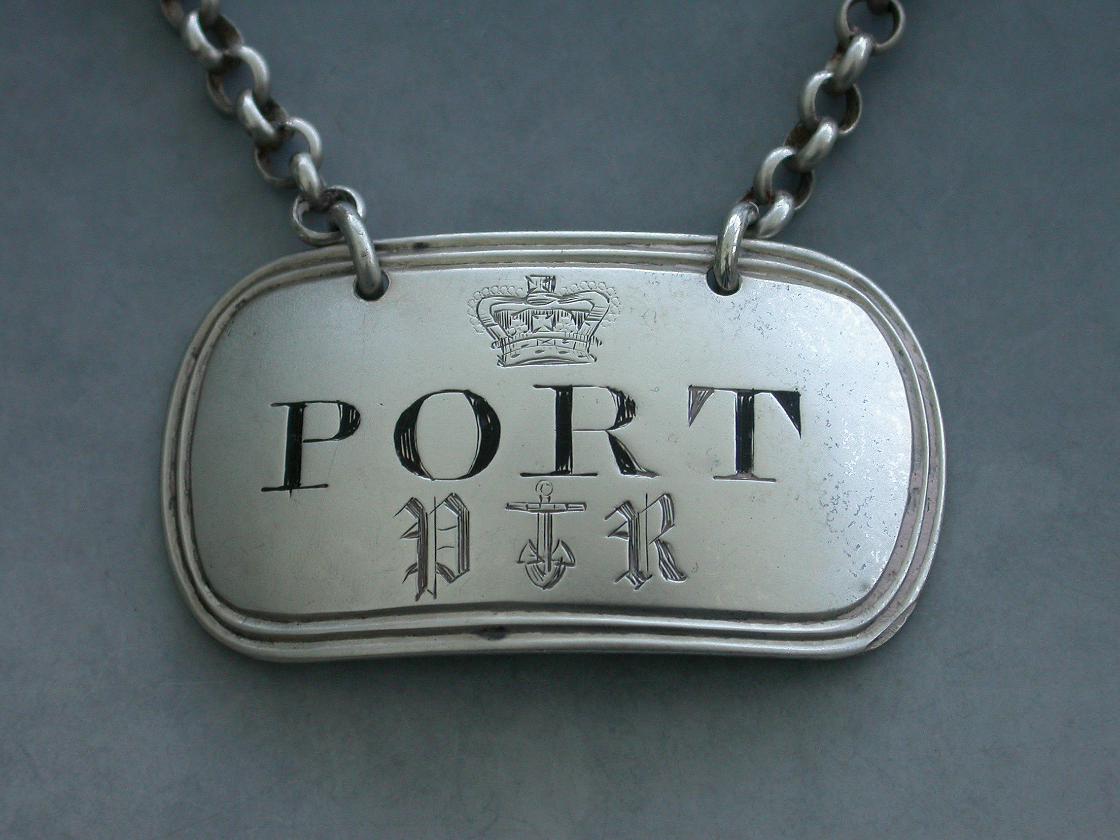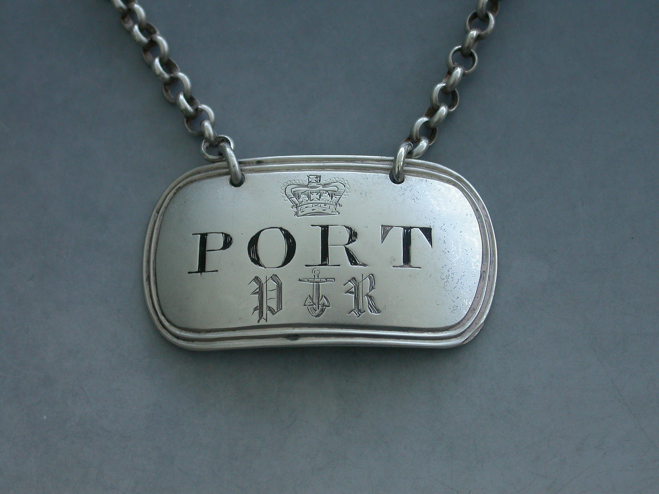 An extremely rare George III silver Wine Label of broad rounded rectangular form with double reeded border, incised for Port and engraved with the Royal Crown of George III above and an anchor between the initials P & R below the name. Presumed to be for the Royal Yacht ""Prince Regent"".