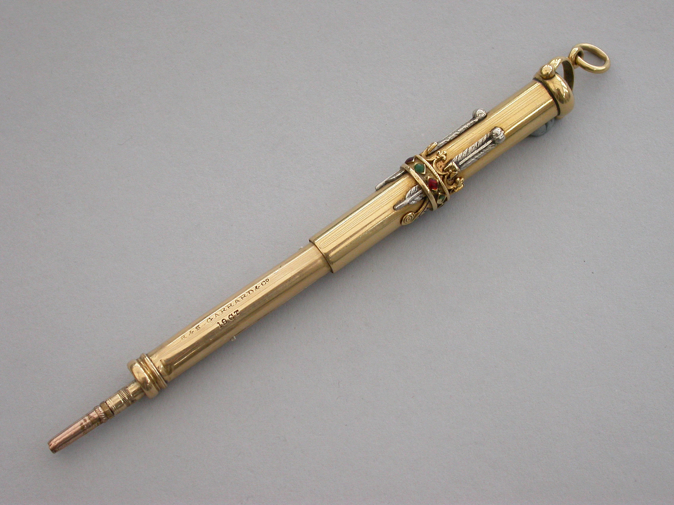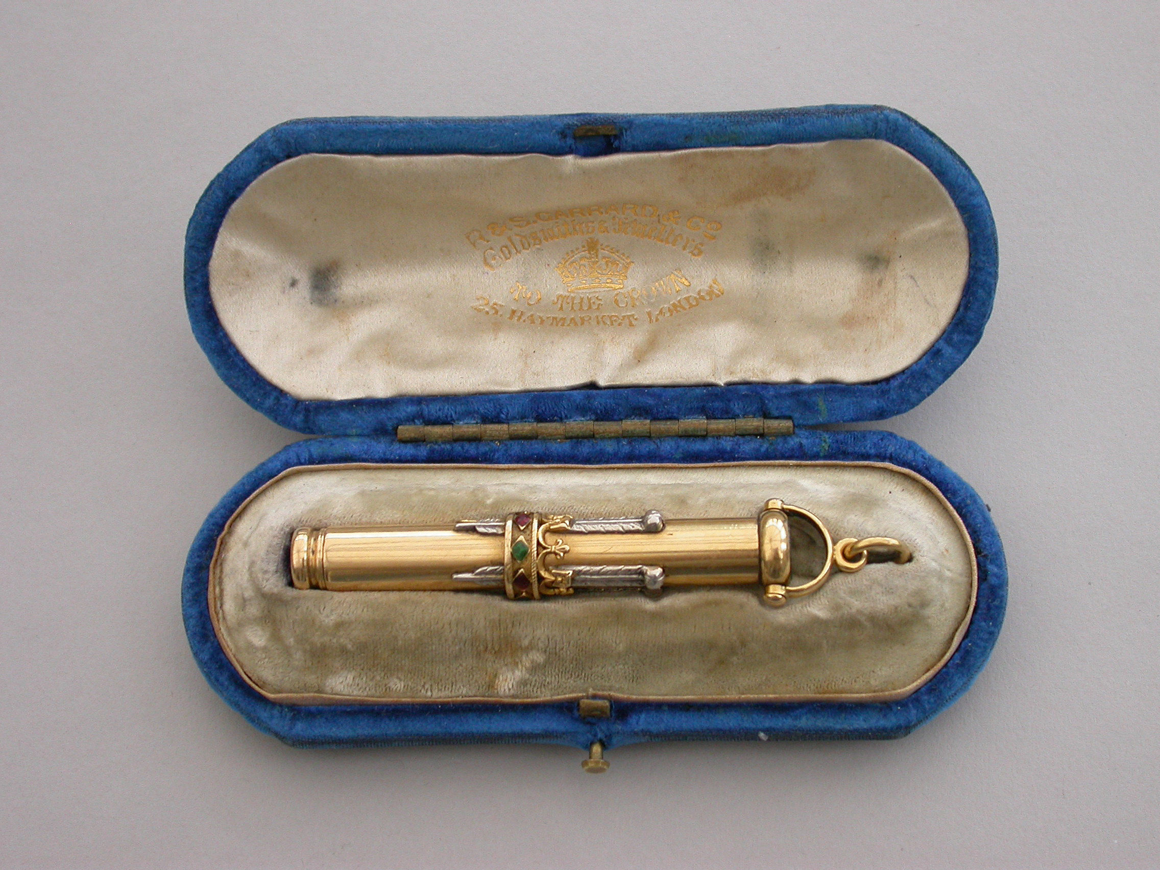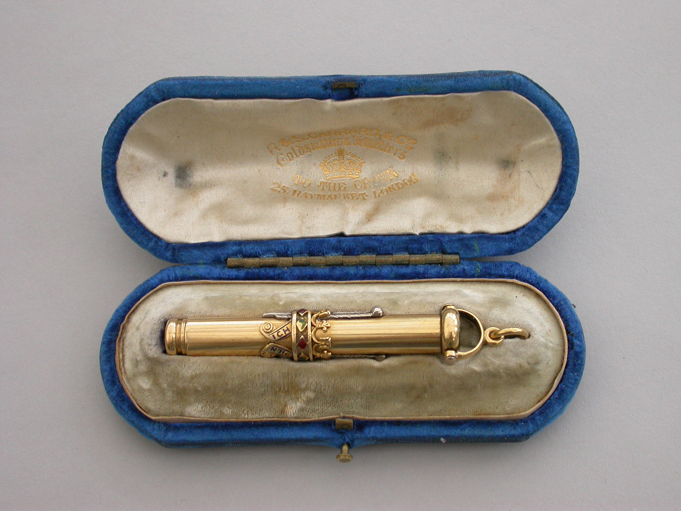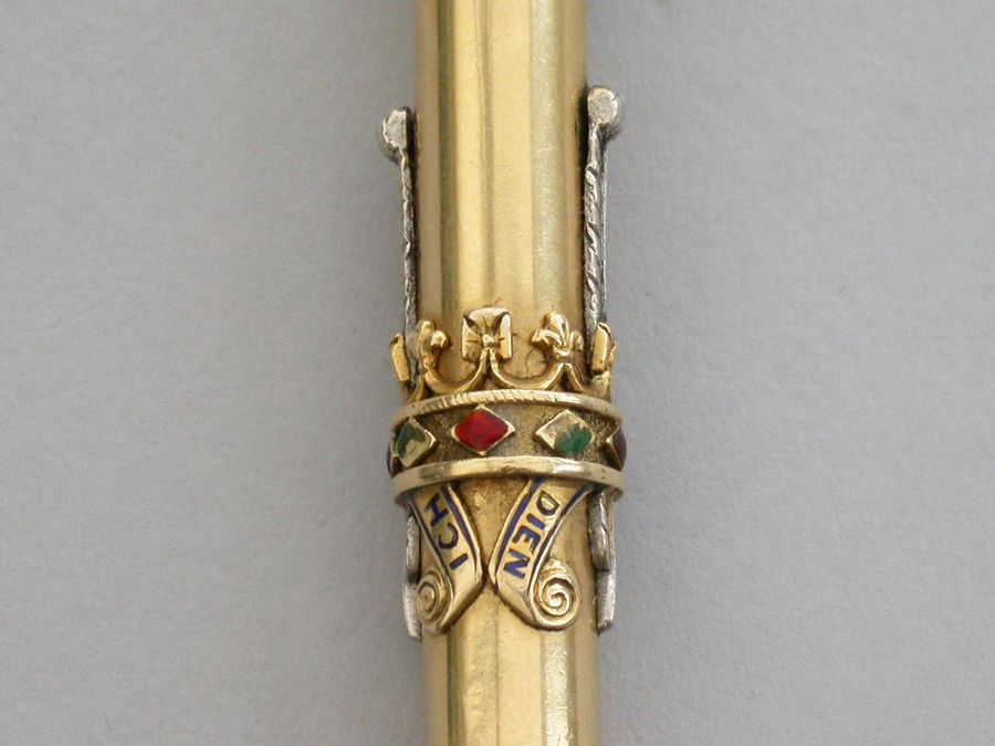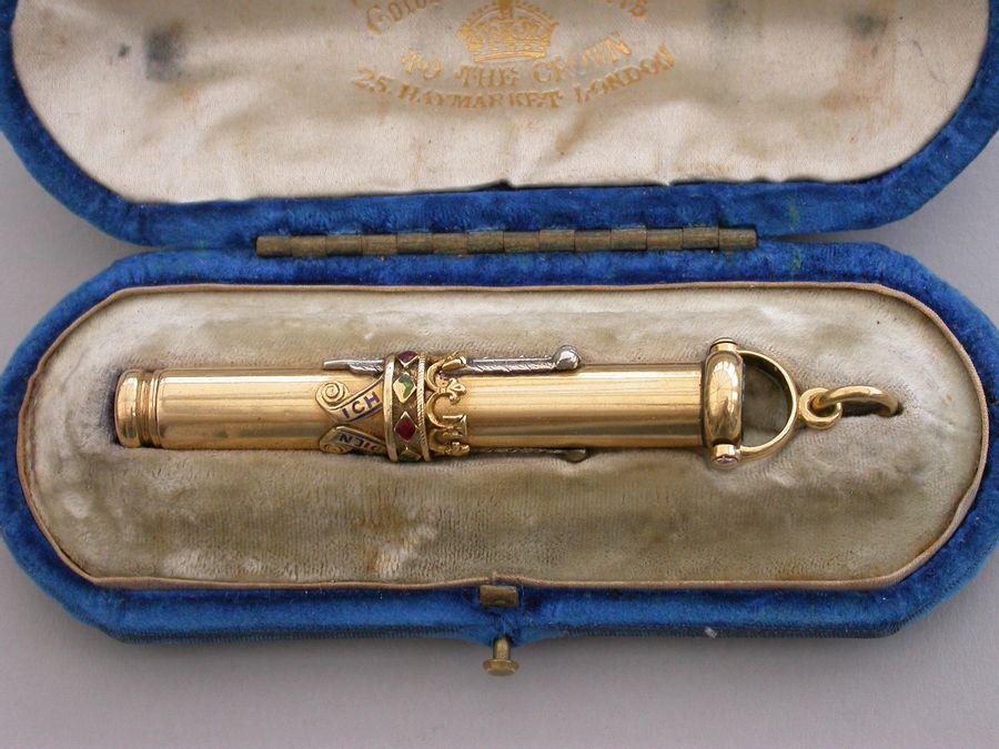 A fine Royal Presentation 18 carat gold and enamel combination pen and pencil,the gold body with applied encircling crown decorated with red and green enamel stones, with silver Prince of Wales feathers and blue enamel motto - Ich Dien. A bloodstone seal terminal and stirrup shaped ring attachment. Slide out pen and pencil. Complete with original maker's silk and velvet fitted case gilt stamped - R & S Garrard & Co. Goldsmiths & Jewellers TO THE CROWN, 25 Haymarket, London.