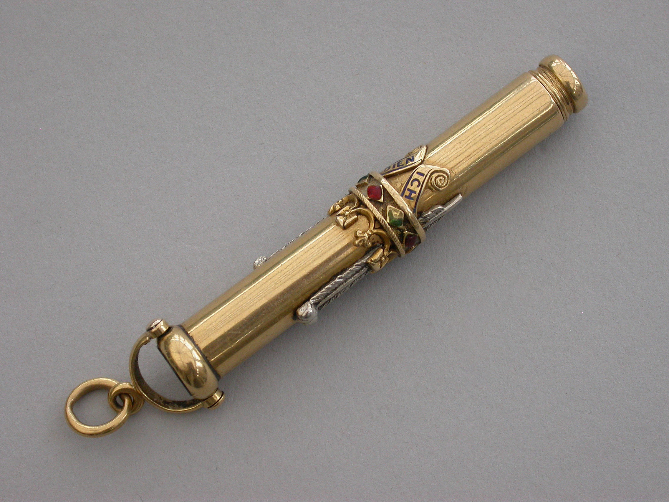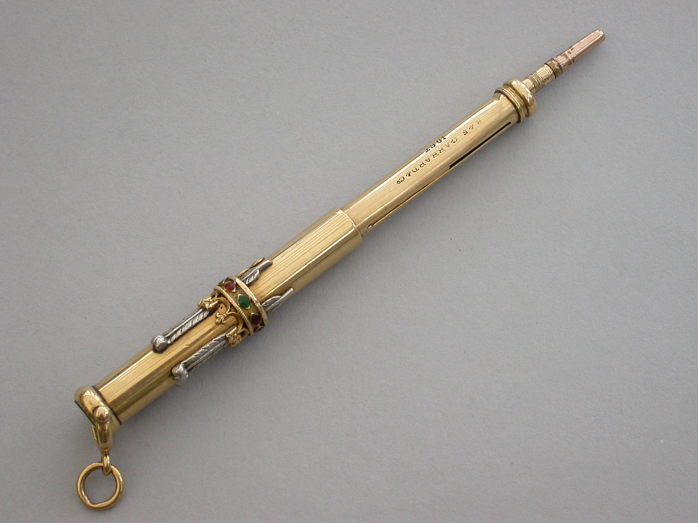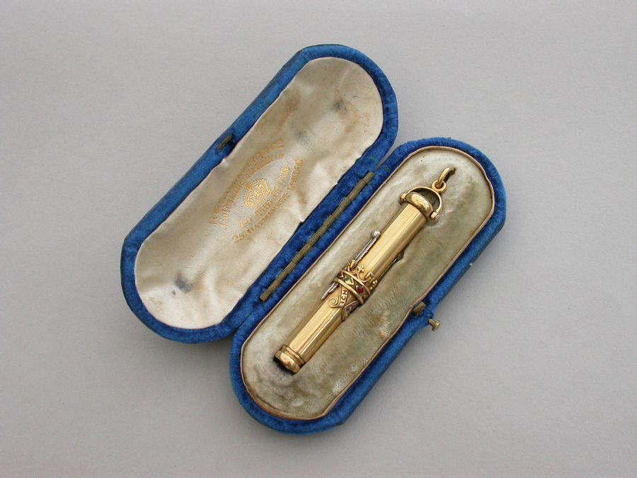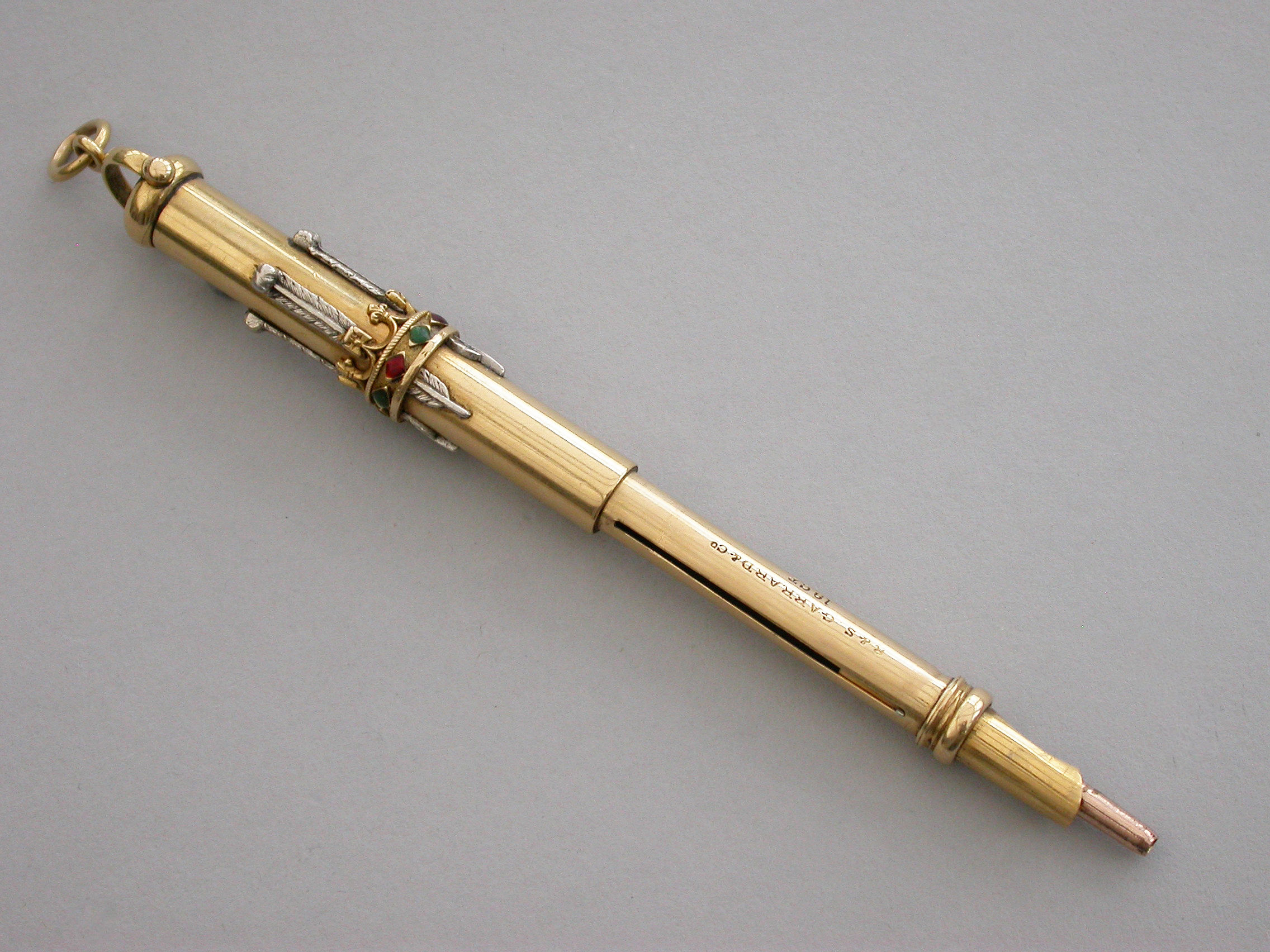A fine Royal Presentation 18 carat gold and enamel combination pen and pencil,the gold body with applied encircling crown decorated with red and green enamel stones, with silver Prince of Wales feathers and blue enamel motto - Ich Dien. A bloodstone seal terminal and stirrup shaped ring attachment. Slide out pen and pencil. Complete with original maker's silk and velvet fitted case gilt stamped - R & S Garrard & Co. Goldsmiths & Jewellers TO THE CROWN, 25 Haymarket, London.