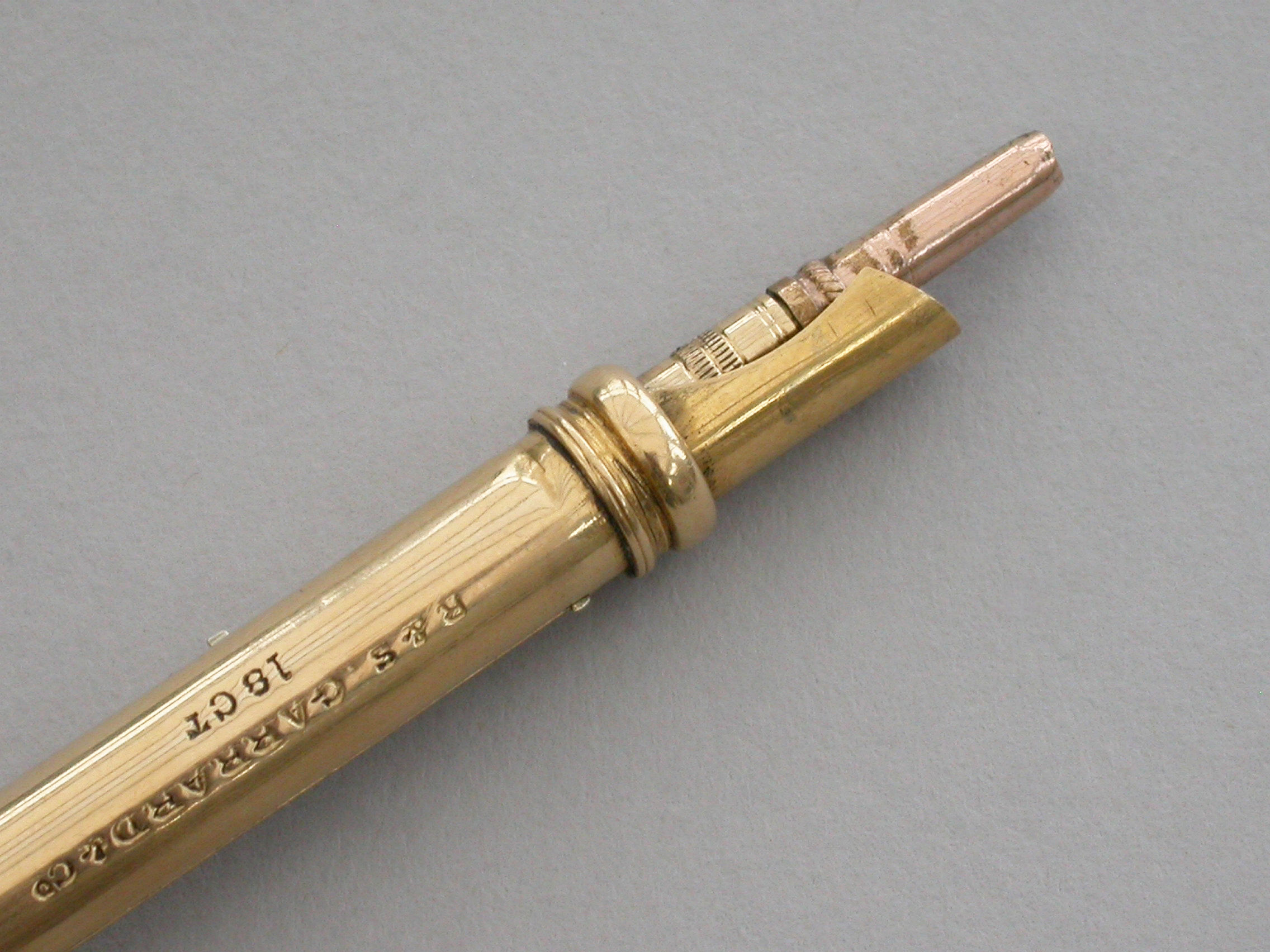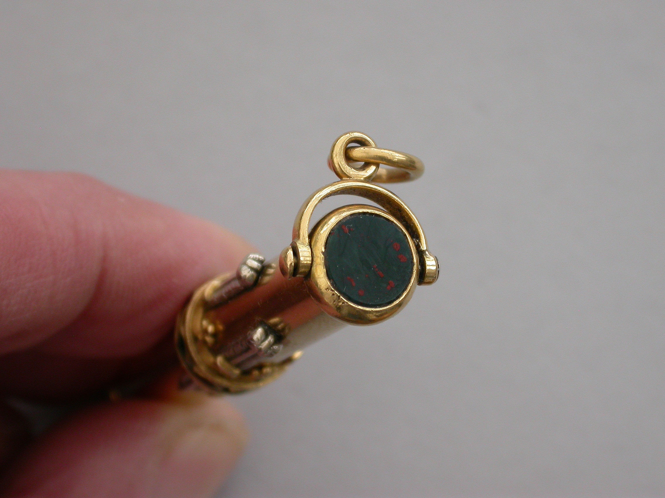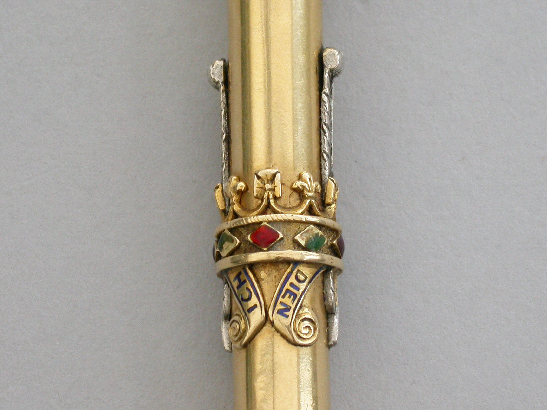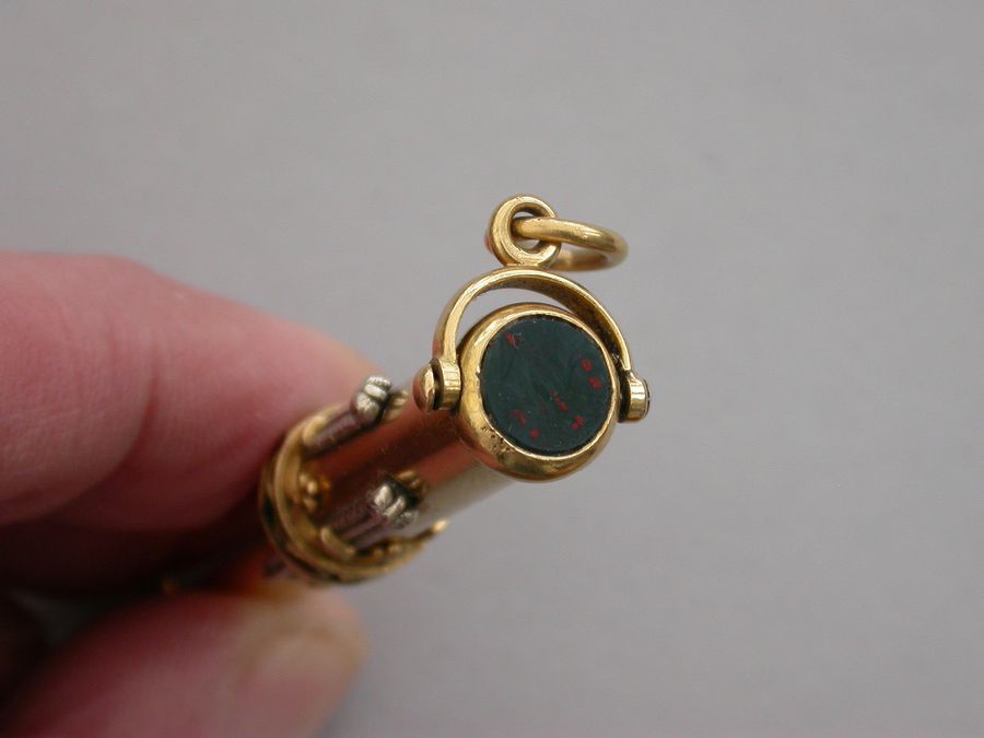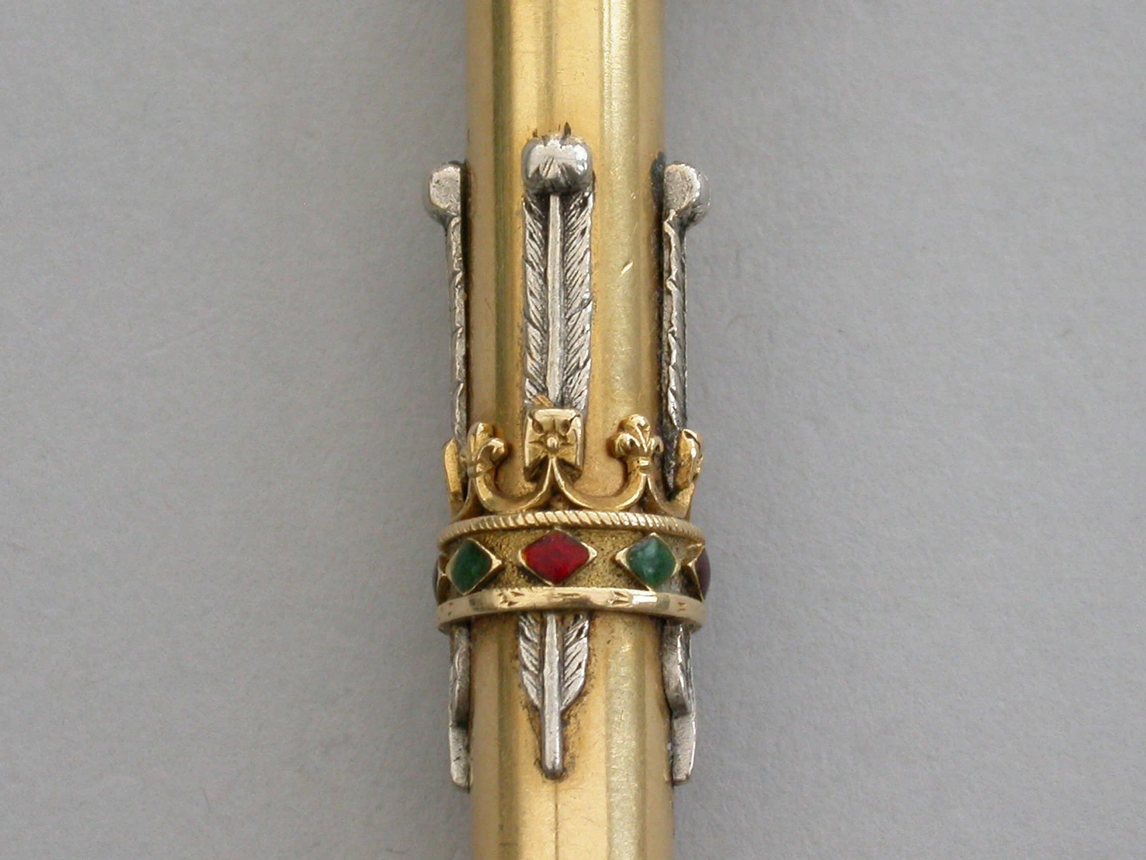 A fine Royal Presentation 18 carat gold and enamel combination pen and pencil,the gold body with applied encircling crown decorated with red and green enamel stones, with silver Prince of Wales feathers and blue enamel motto - Ich Dien. A bloodstone seal terminal and stirrup shaped ring attachment. Slide out pen and pencil. Complete with original maker's silk and velvet fitted case gilt stamped - R & S Garrard & Co. Goldsmiths & Jewellers TO THE CROWN, 25 Haymarket, London.