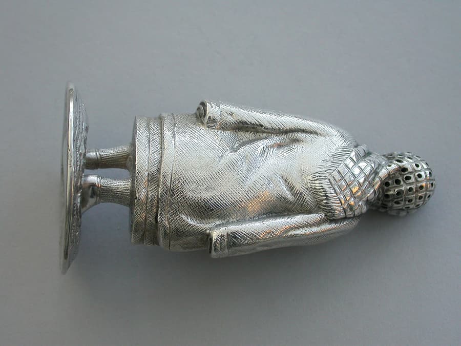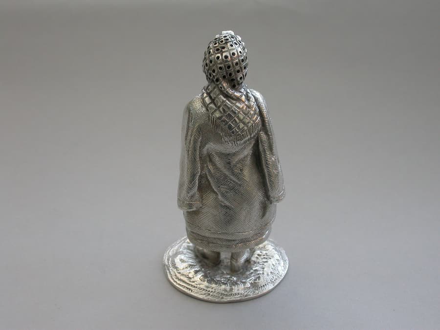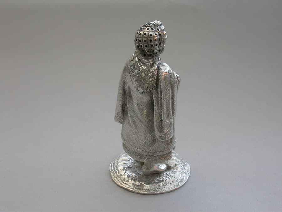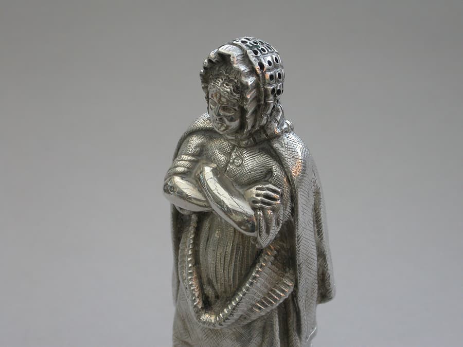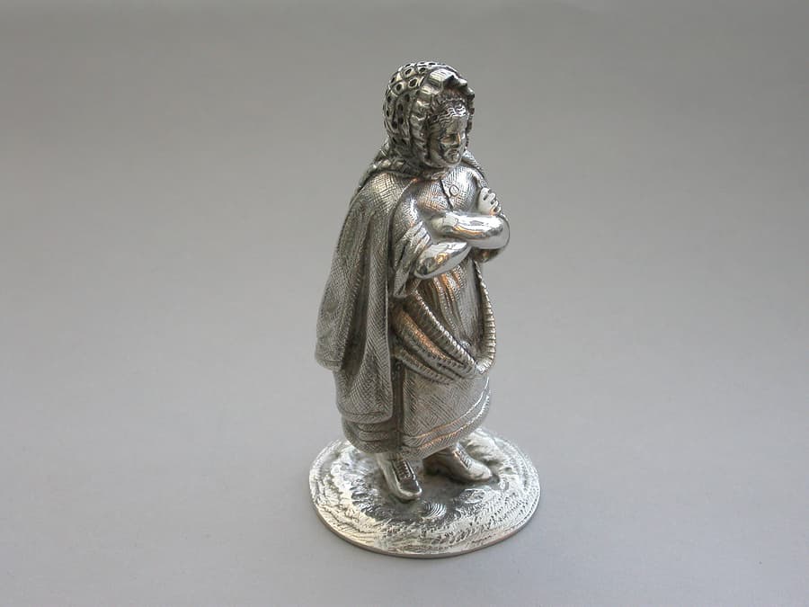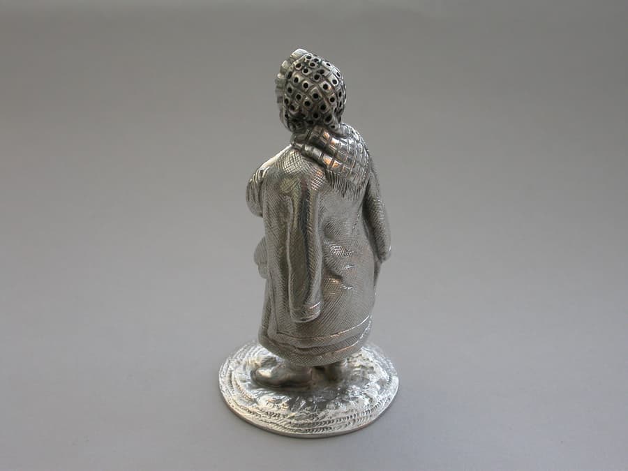 A good quality early 20th century Scottish heavy cast silver Pepper, made in the form of a Newhaven Fishwife, standing with her arms folded. Pierced head and screw-off base.