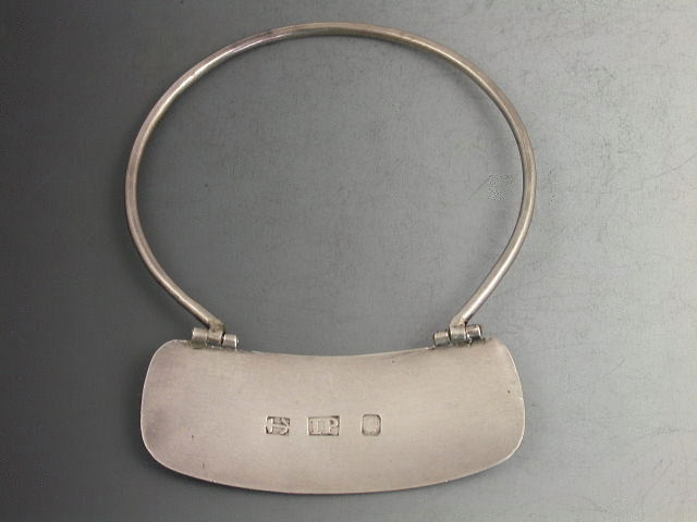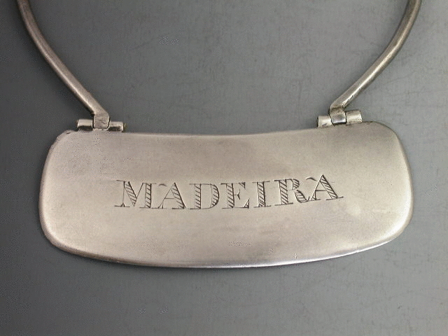 An extremely rare and possibly unique Georgian Scottish Provincial silver Wine Label of neck ring form, the plain rounded rectangular label engraved for Madeira in a cross hatched style and with an apostrophe or seraph after the M and before the last A. Attached to the circular supporting wire by two hinges. See Wine Labels 1730 - 2003, edited by John Salter, fig 247 & page 68.