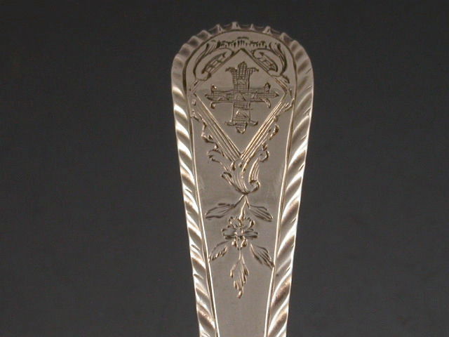 A superb set of twelve 18th century Georgian silver Teaspoons with fluted bowls and bright-cut engraved feather edged Old English pattern handles, the handles also engraved with an heraldic cross moline within a diamond shaped shield surrounded by scrolls and a flower head.