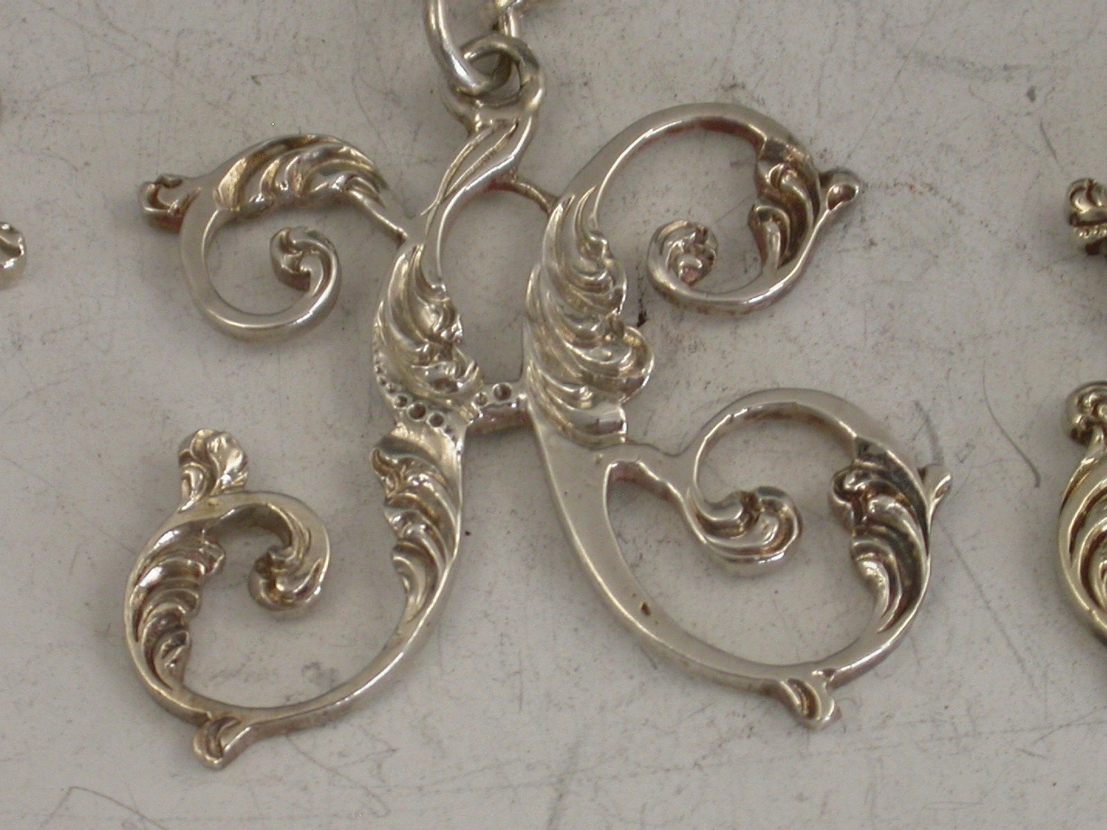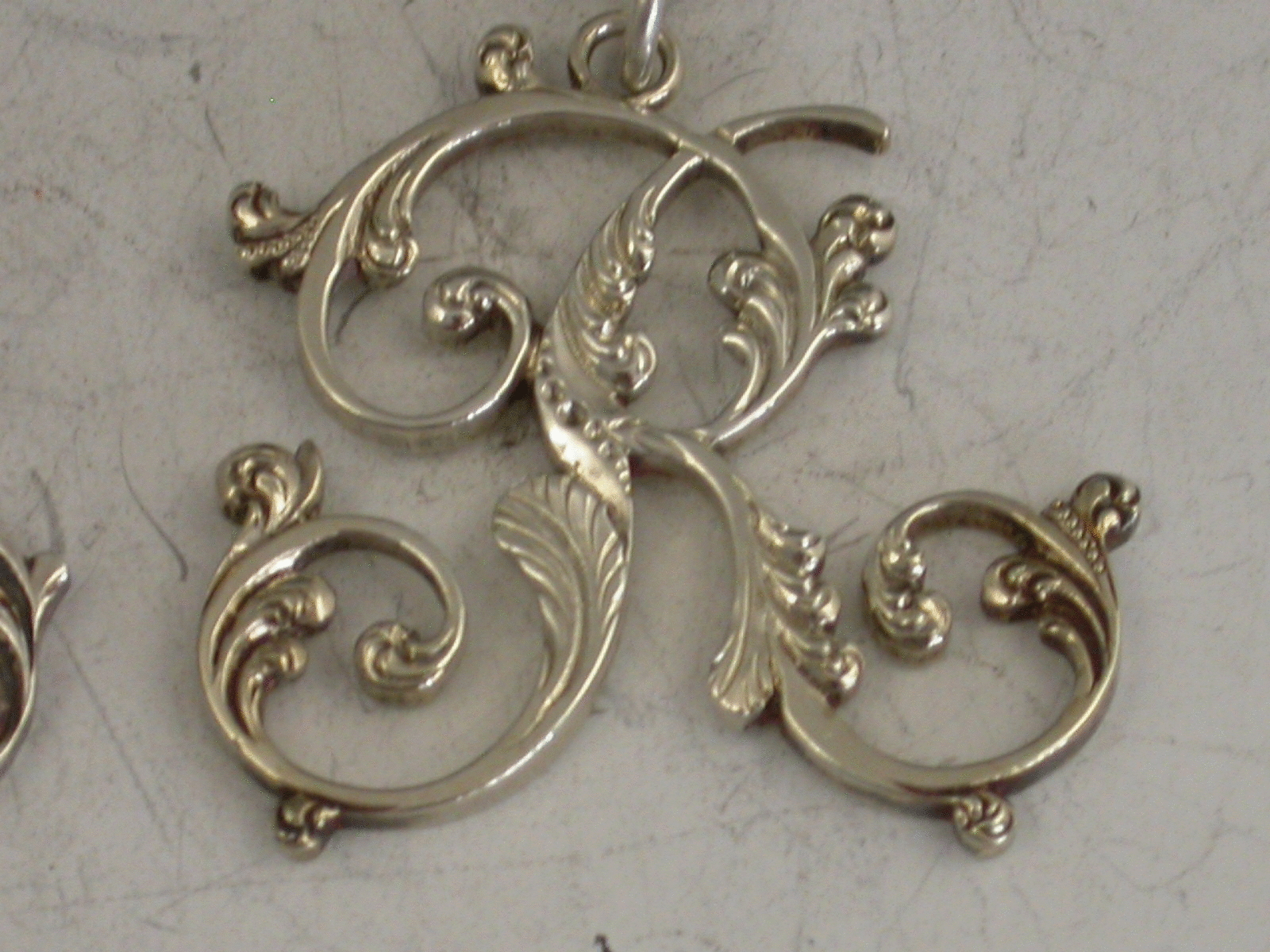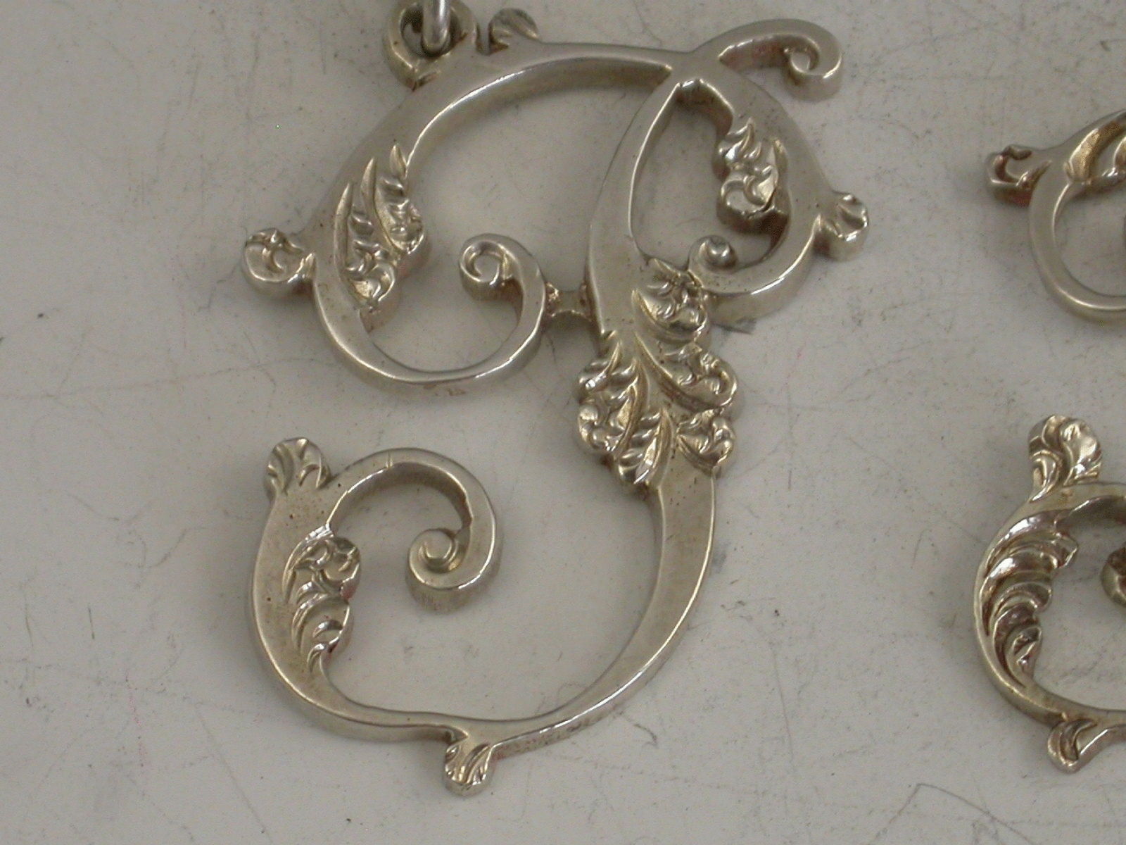 A fine set of three early 19th century cast silver Wine Labels of script initial letter form with foliate embellishments, for the letters P, H & R.
