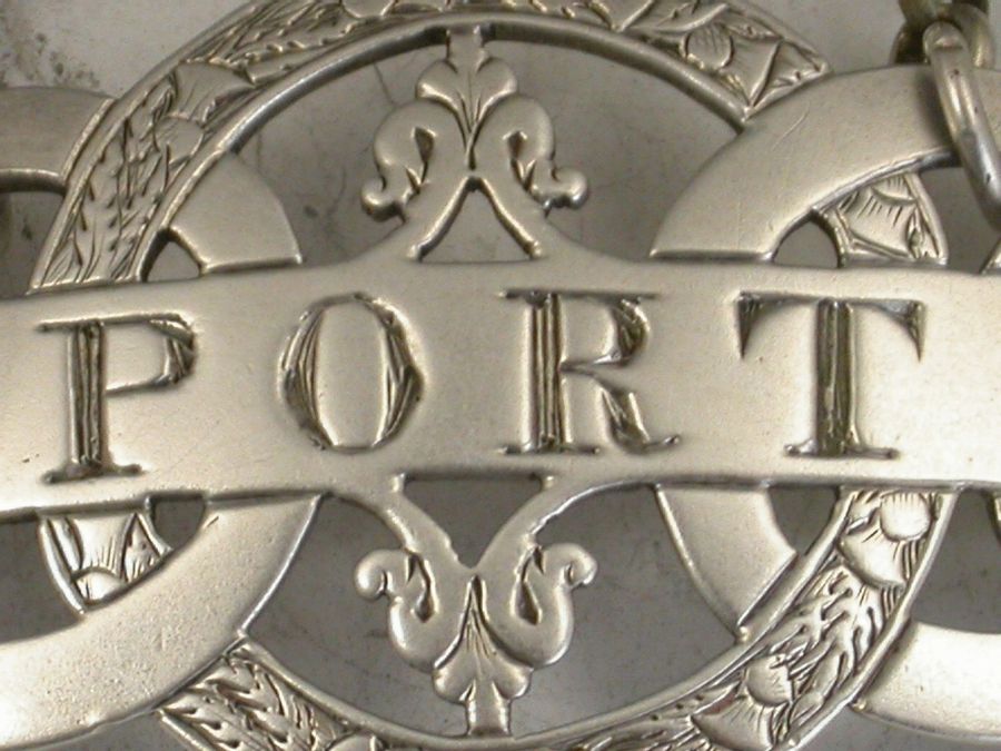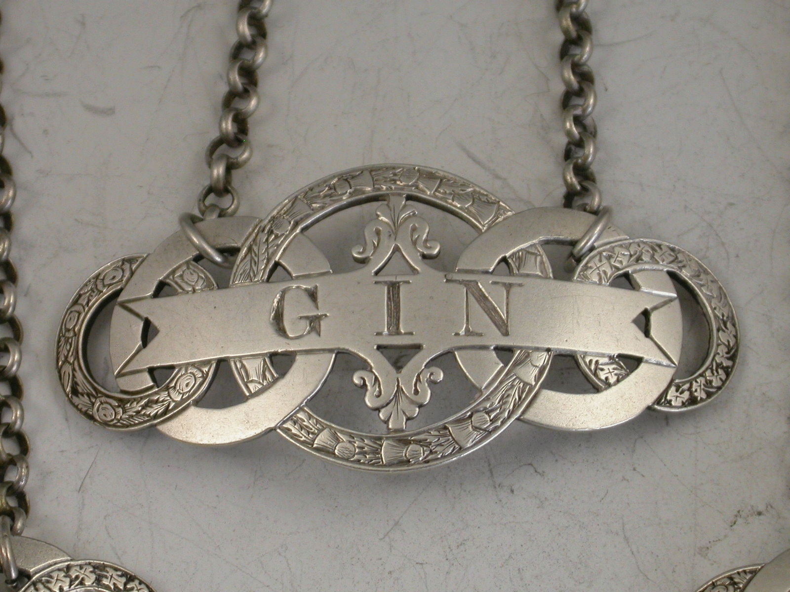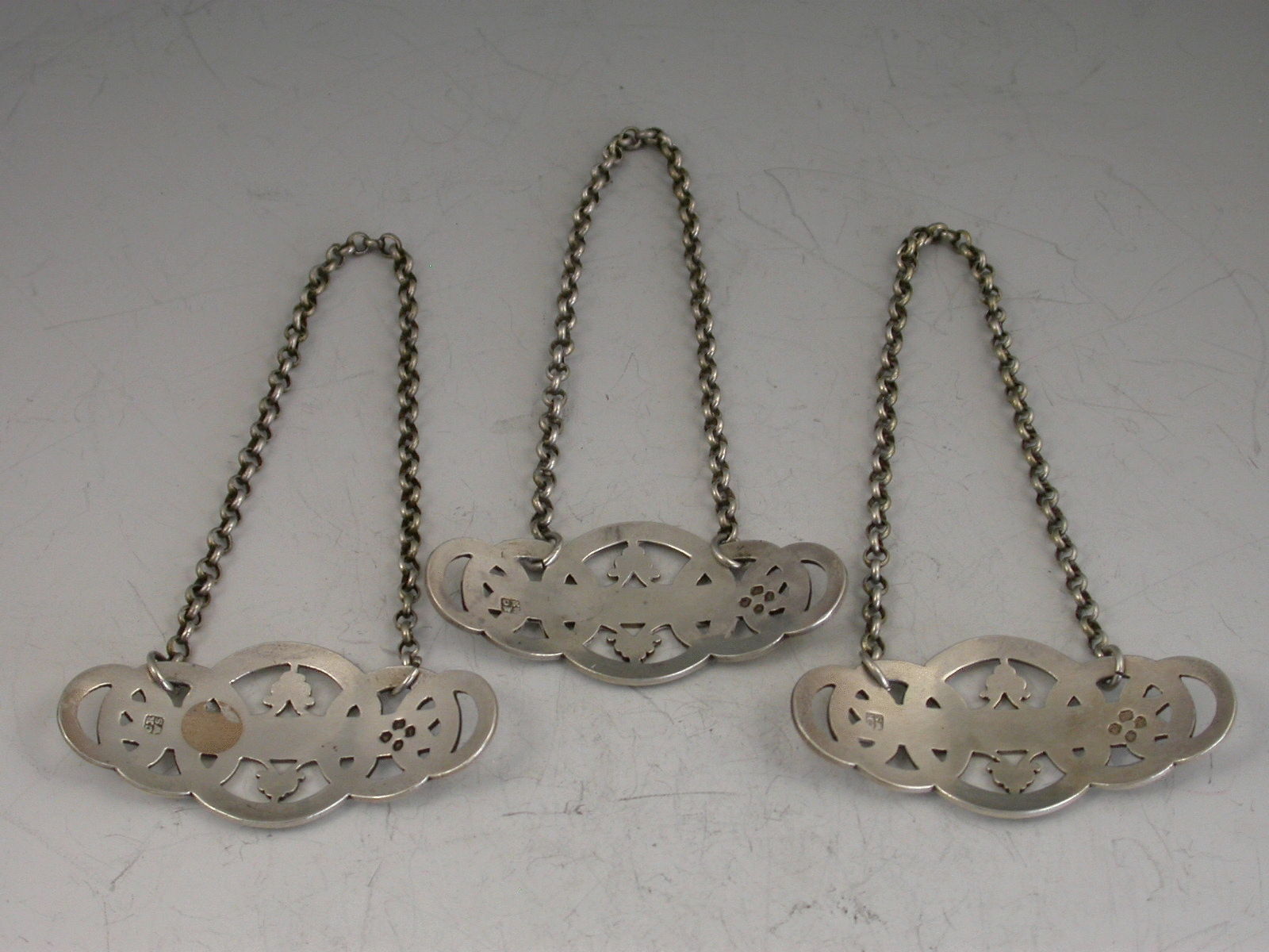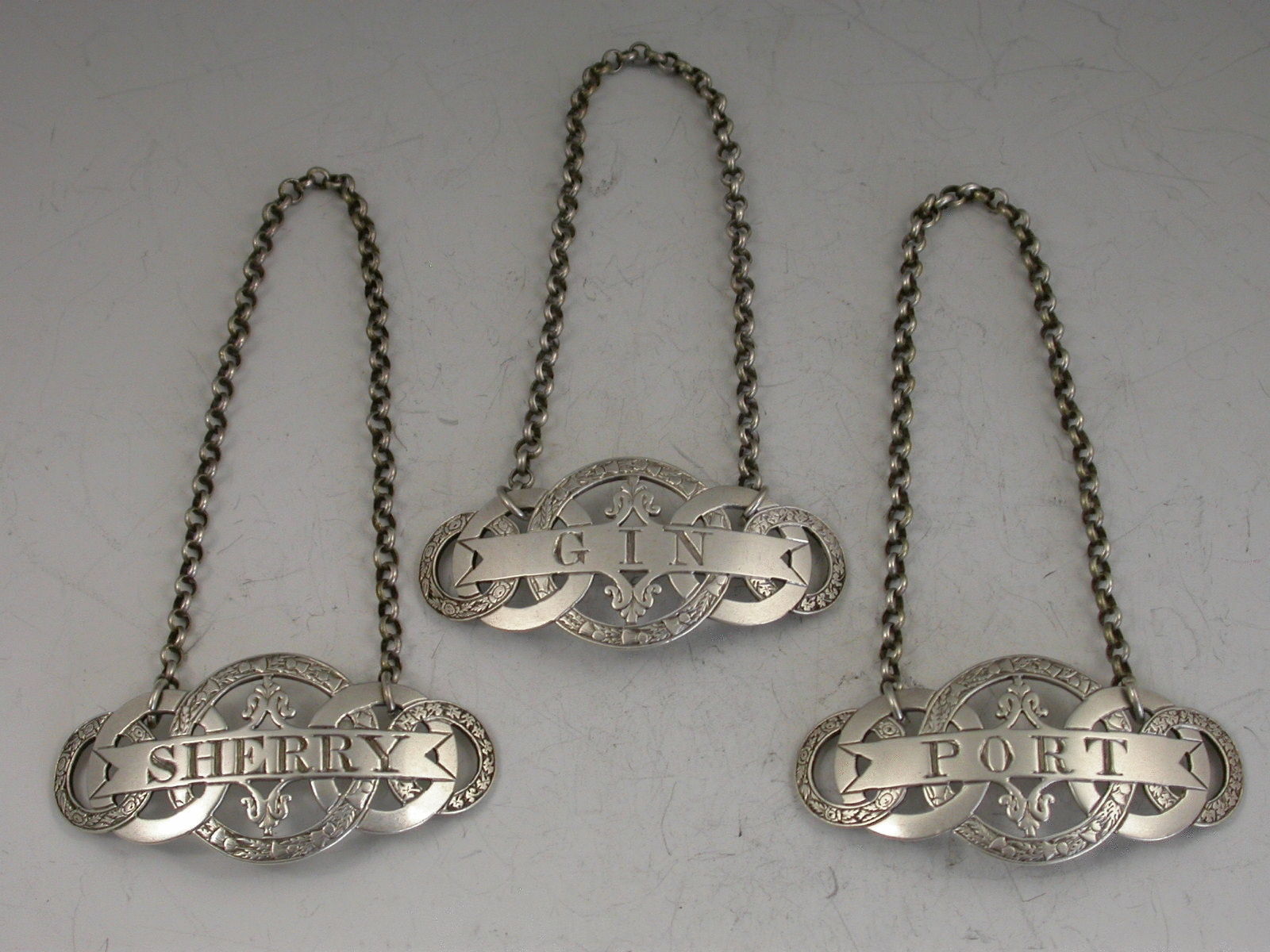 A rare set of three antique Victorian cast silver Wine Labels of pierced architectural form, made up of five interlocking circles, the design known as the ‘Olympic Rings’, incised for Port, Sherry and Gin.