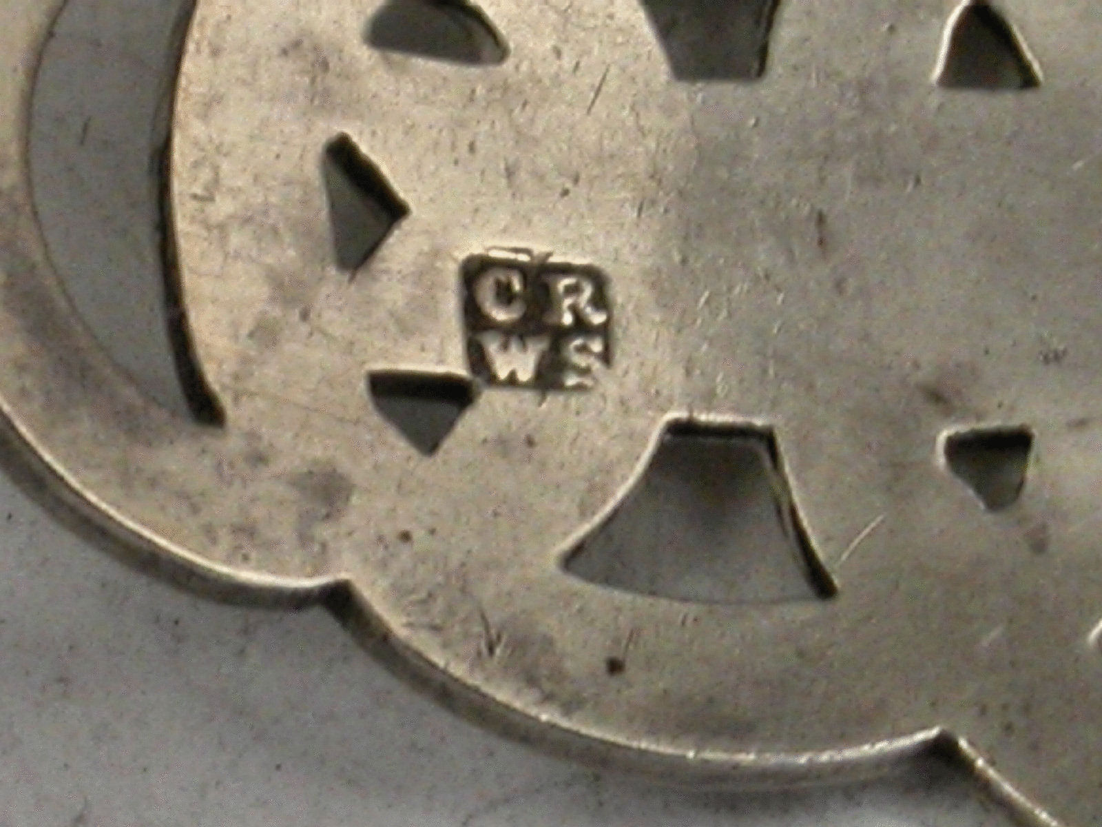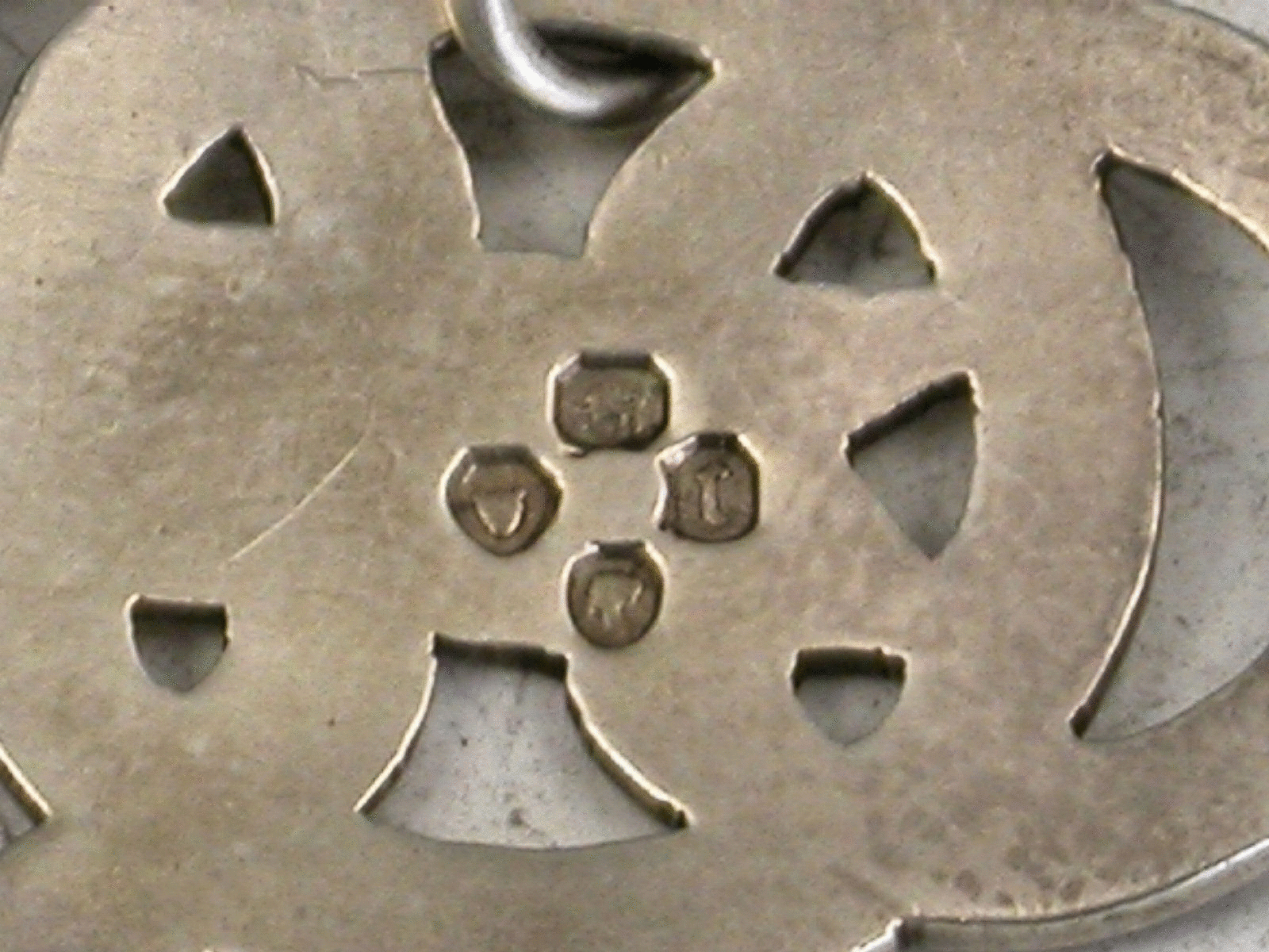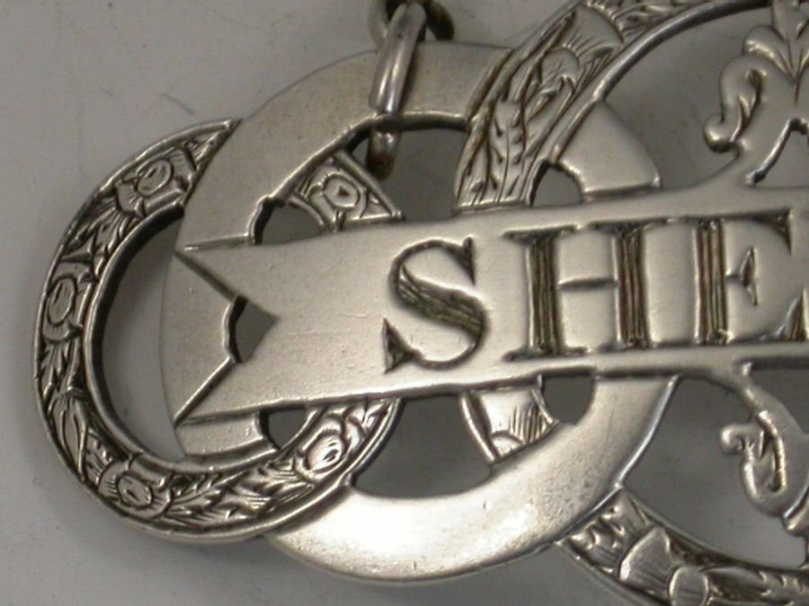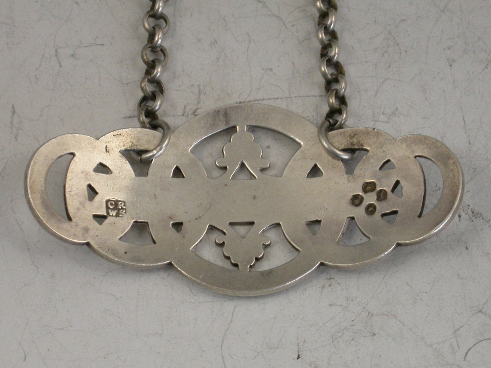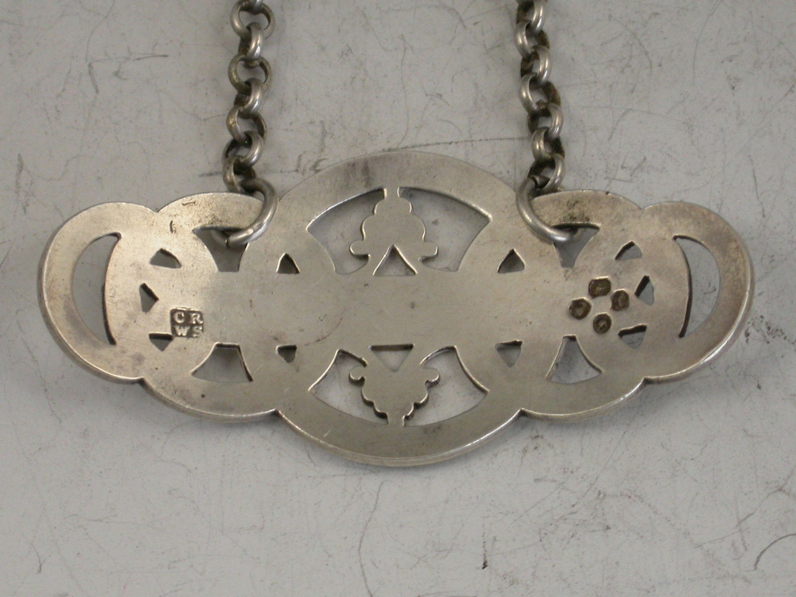 A rare set of three antique Victorian cast silver Wine Labels of pierced architectural form, made up of five interlocking circles, the design known as the ‘Olympic Rings’, incised for Port, Sherry and Gin.