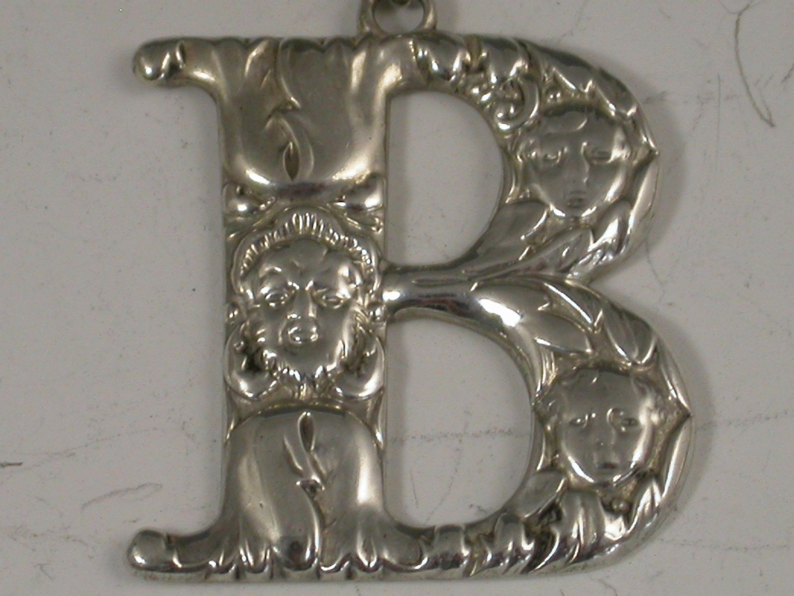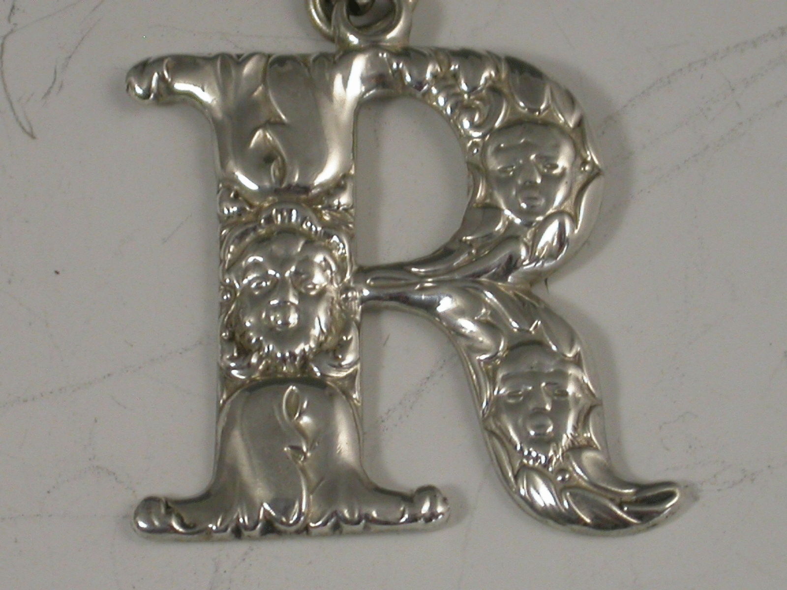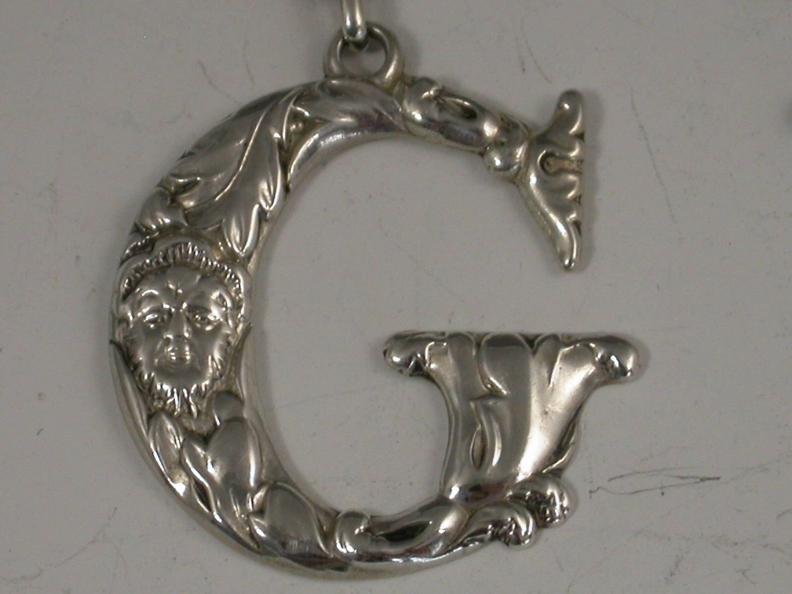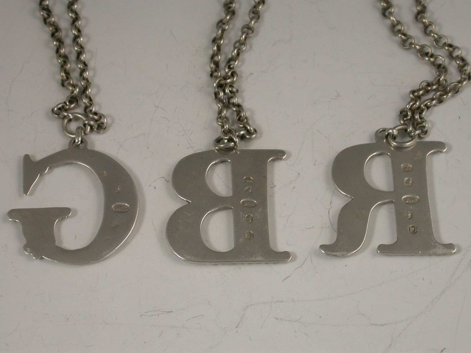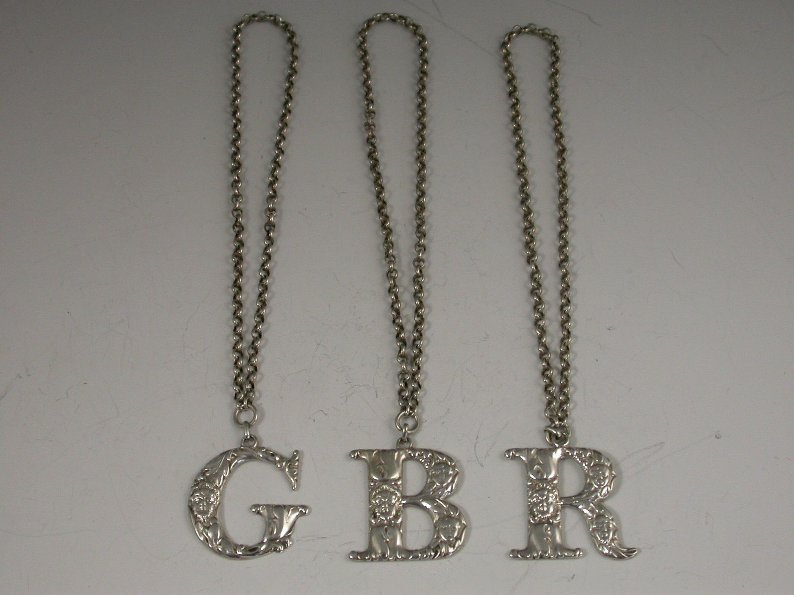 A good set of three George III cast silver Spirit Labels of initial letter form for G (Gin) B (Brandy) and R (Rum), decorated with mask heads amongst acanthus leaves.