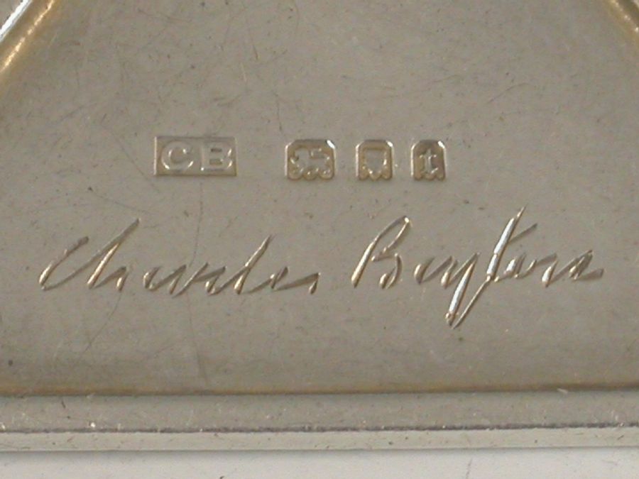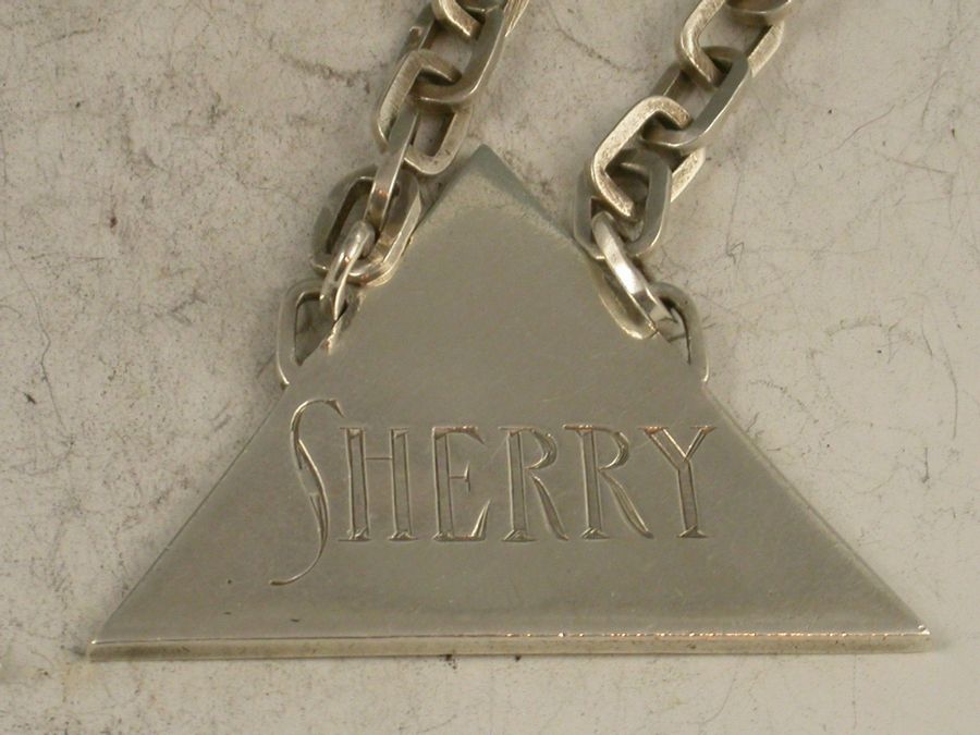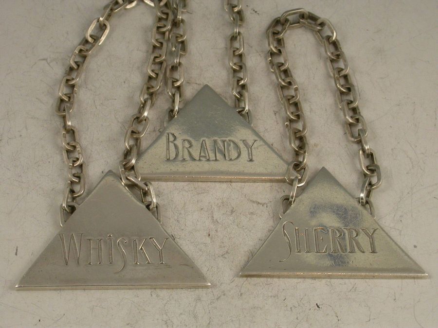 A unusual and very stylish set of three Art Deco silver Wine Labels of plain triangular form with distinctive suspension chains with rectangular links, incised for Whisky, Sherry and Brandy. Signed by Charles Boyton.