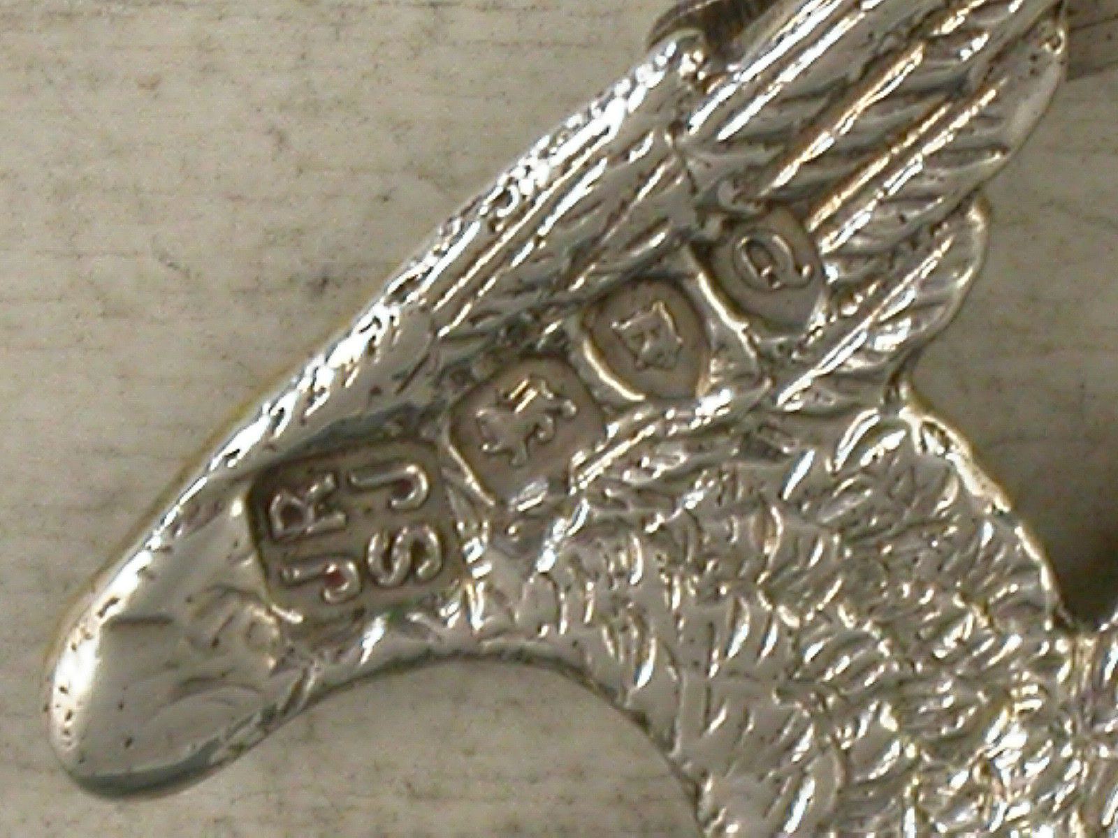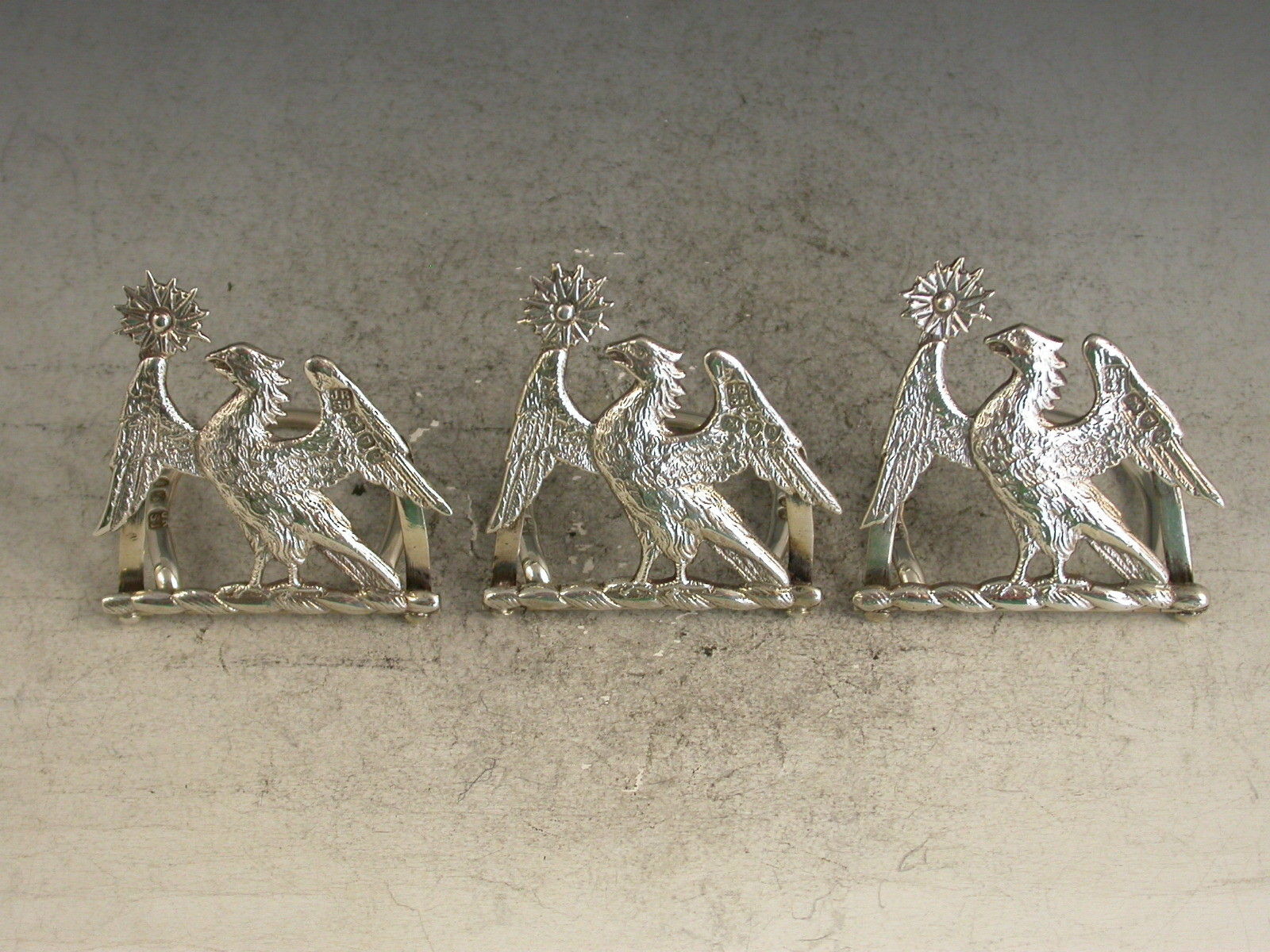 A set of three Victorian cast silver Menu Holders depicting Armorial Crests of eagles rising looking at the sun ppr, possibly for Stevens of Edinburgh.