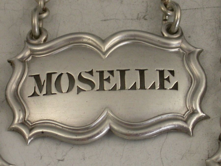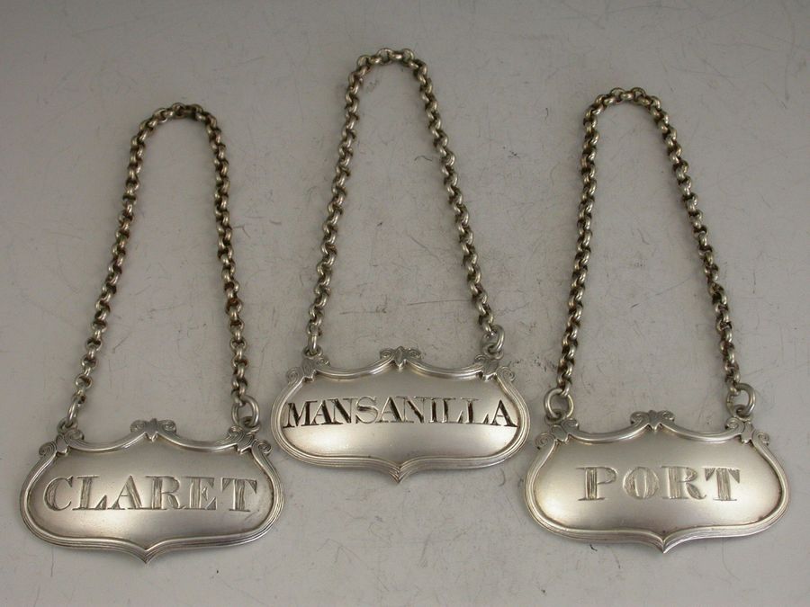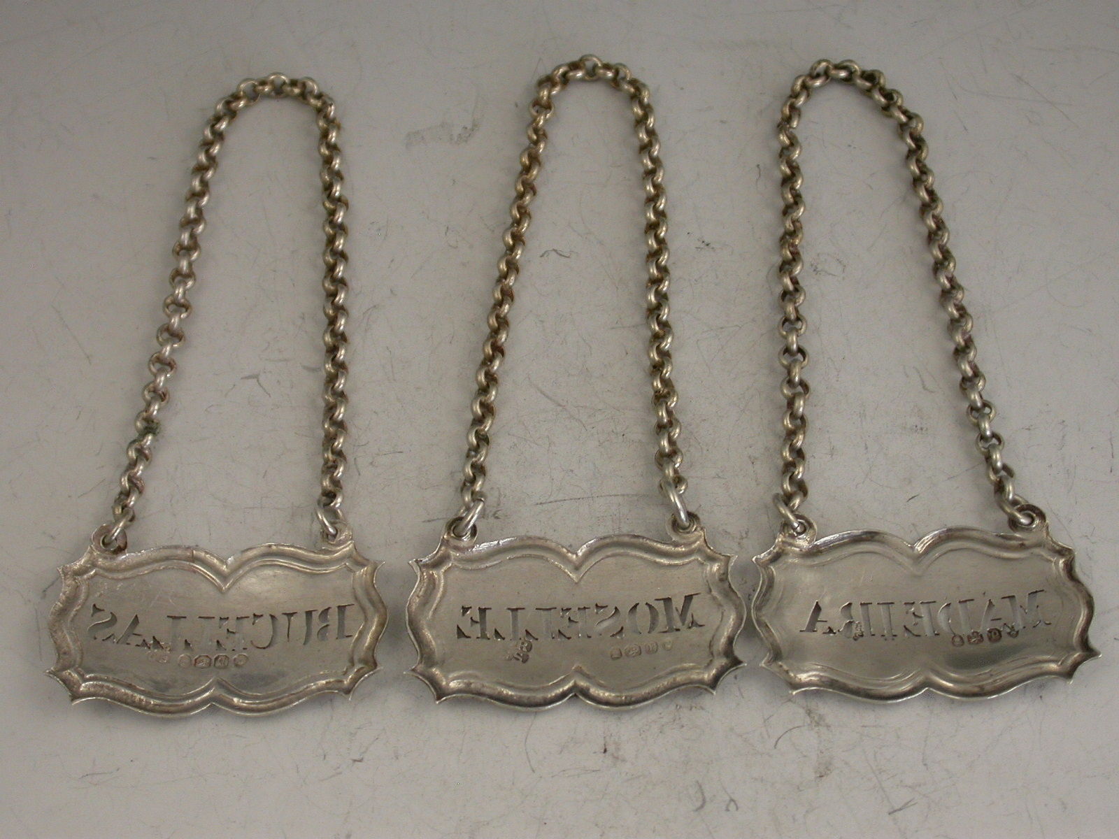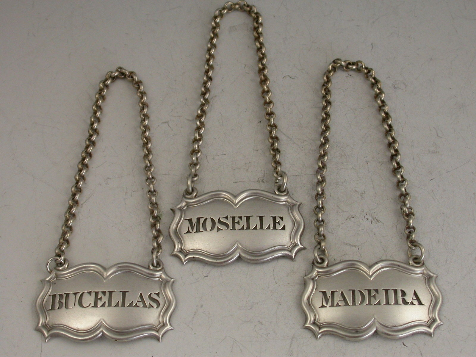 A good quality set of three William IV silver Wine Labels of shaped rectangular or architectural form with moulded borders and raised eyelets, pierced for Bucellas, Moselle and Madeira. Complete with heavy quality suspension chains.