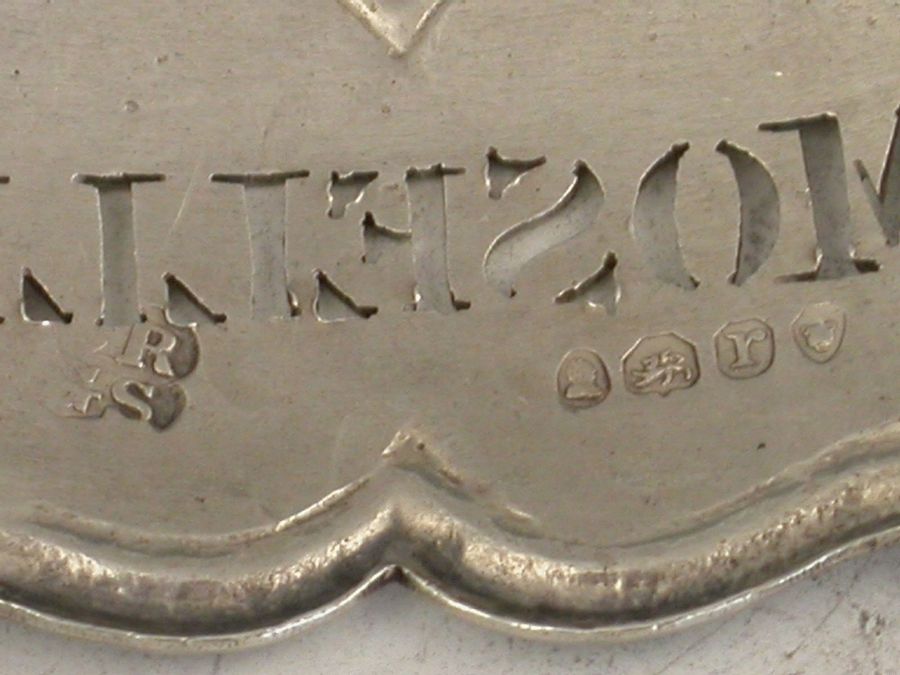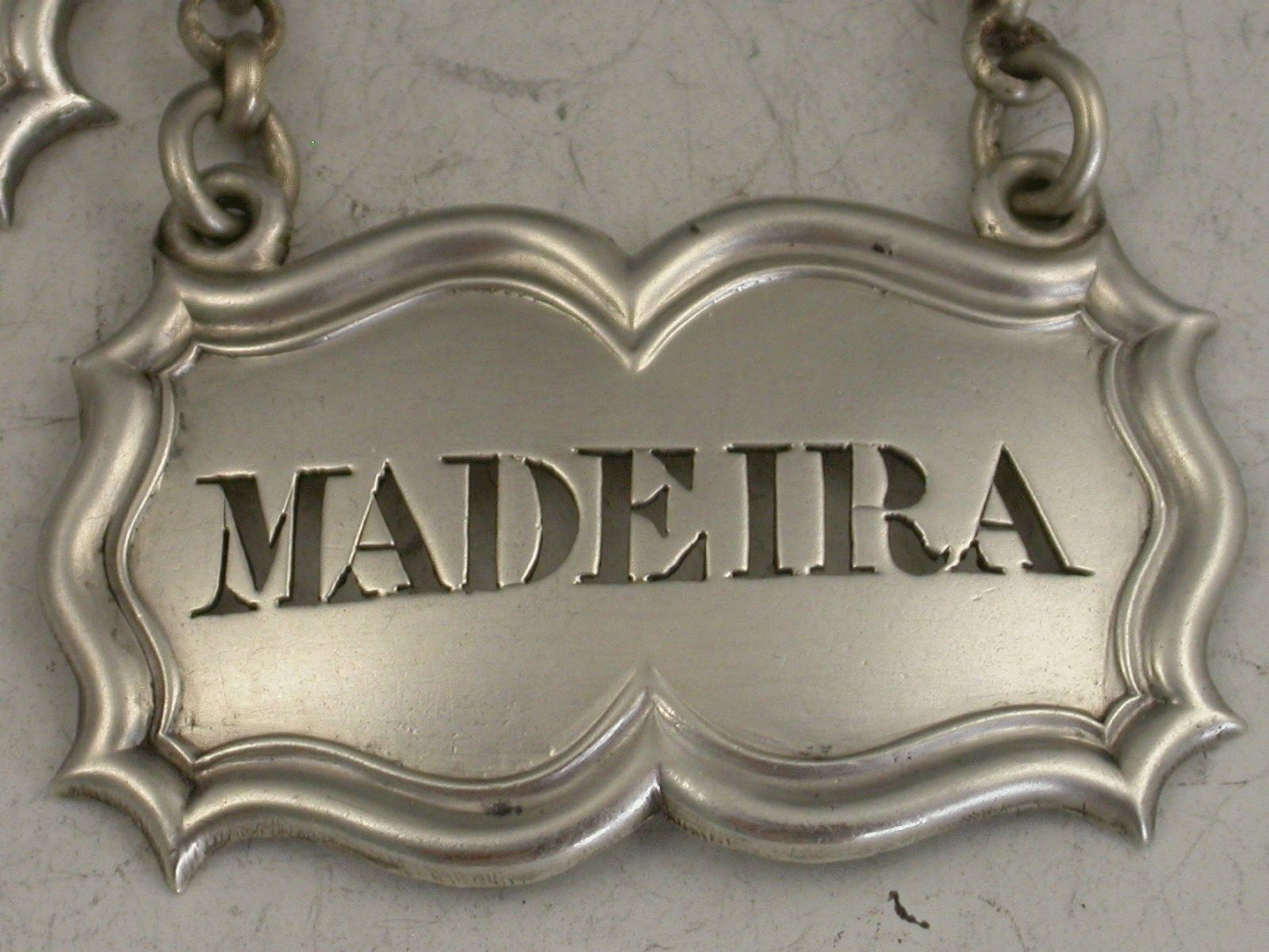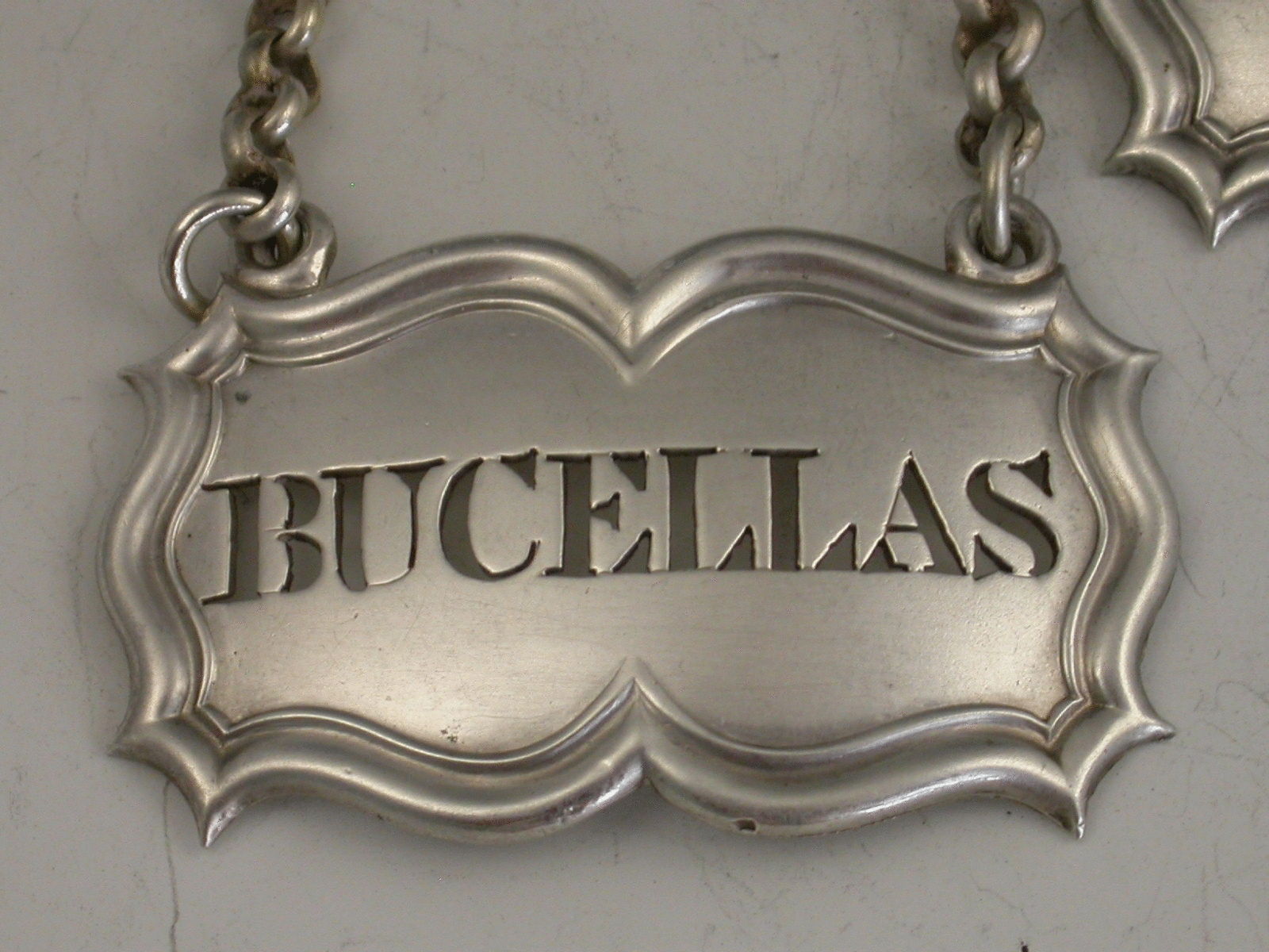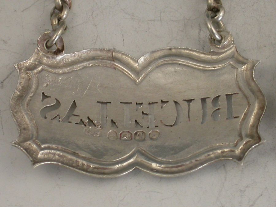 A good quality set of three William IV silver Wine Labels of shaped rectangular or architectural form with moulded borders and raised eyelets, pierced for Bucellas, Moselle and Madeira. Complete with heavy quality suspension chains.