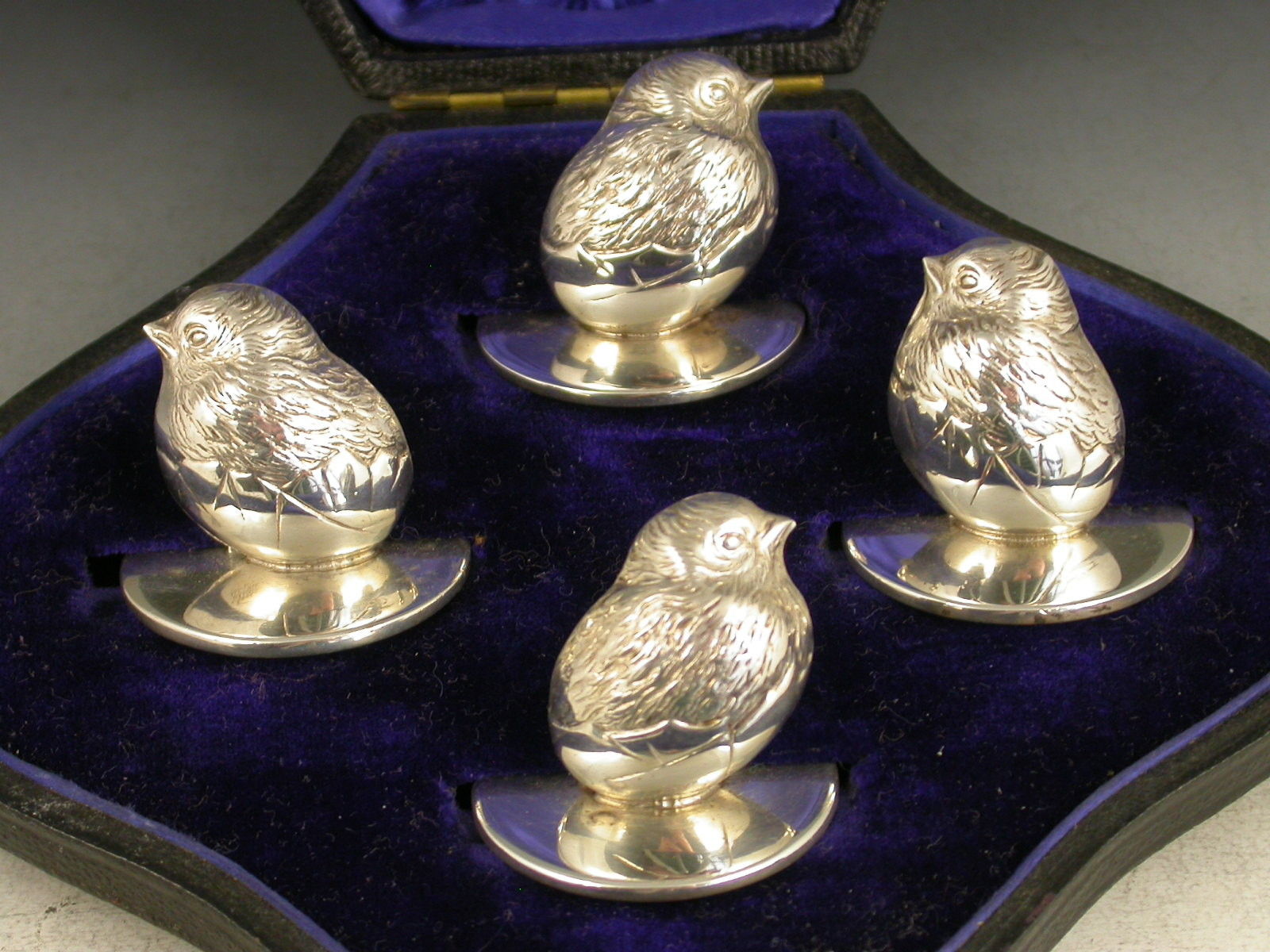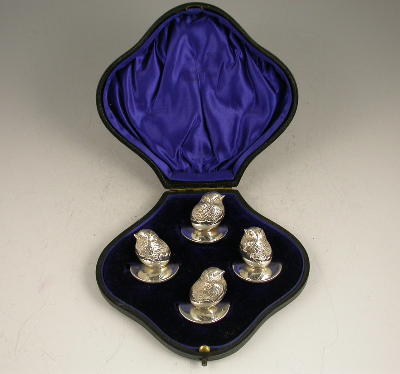 Set 4 Cased Edwardian Silver 'Hatching Chicks' Menu Holders