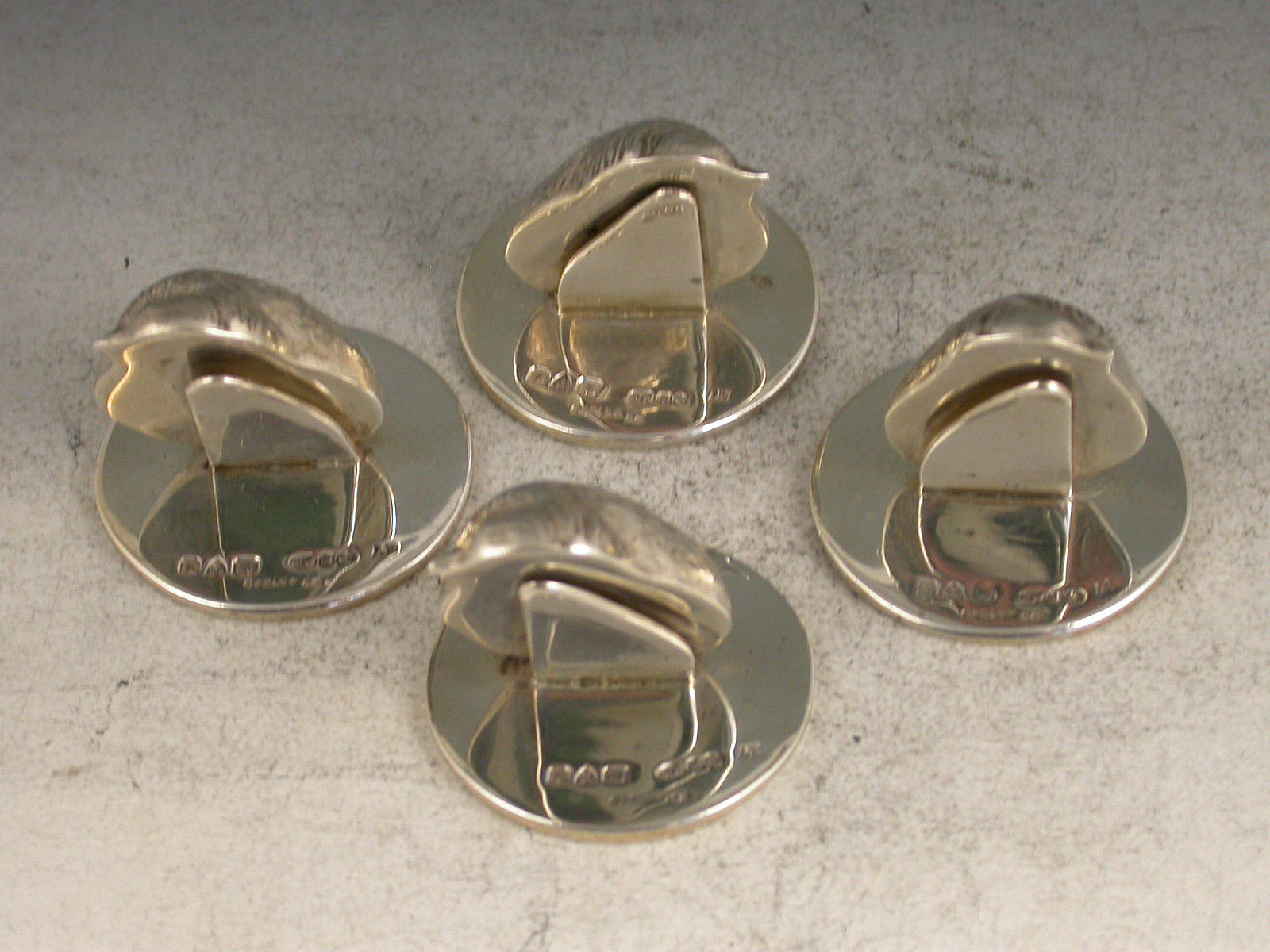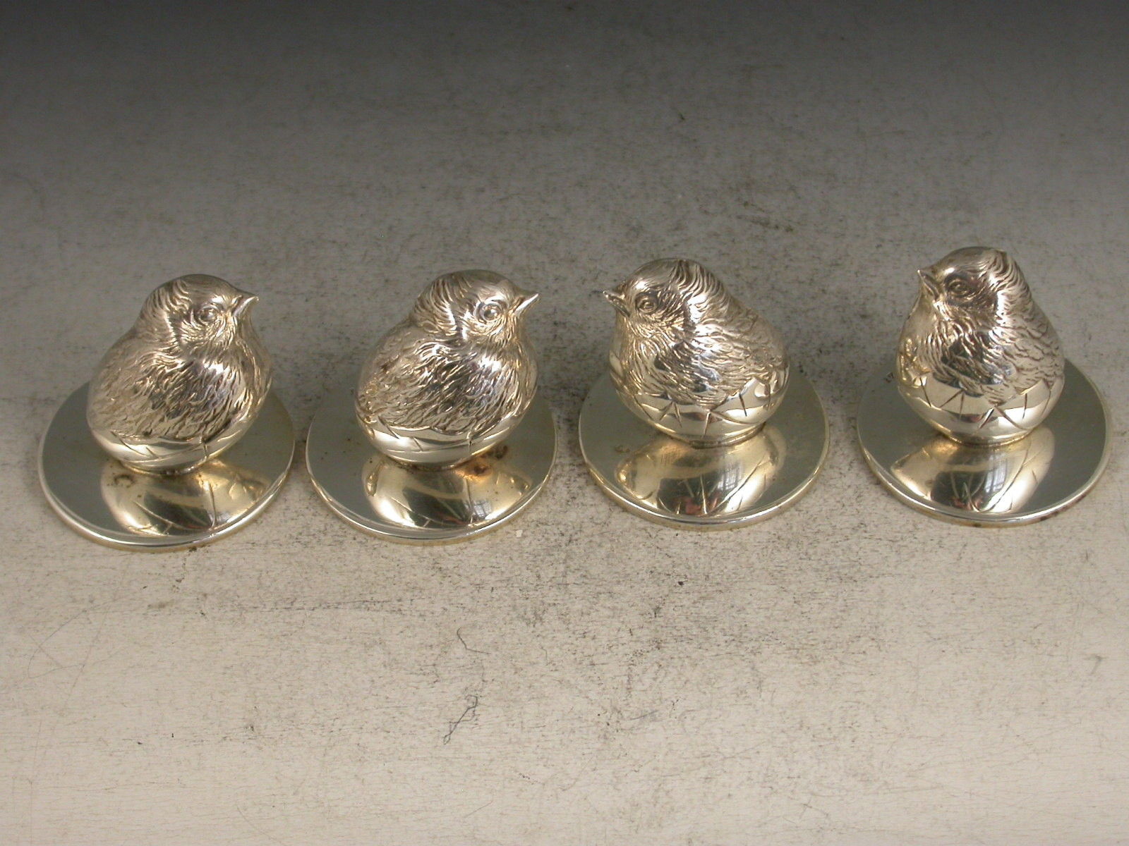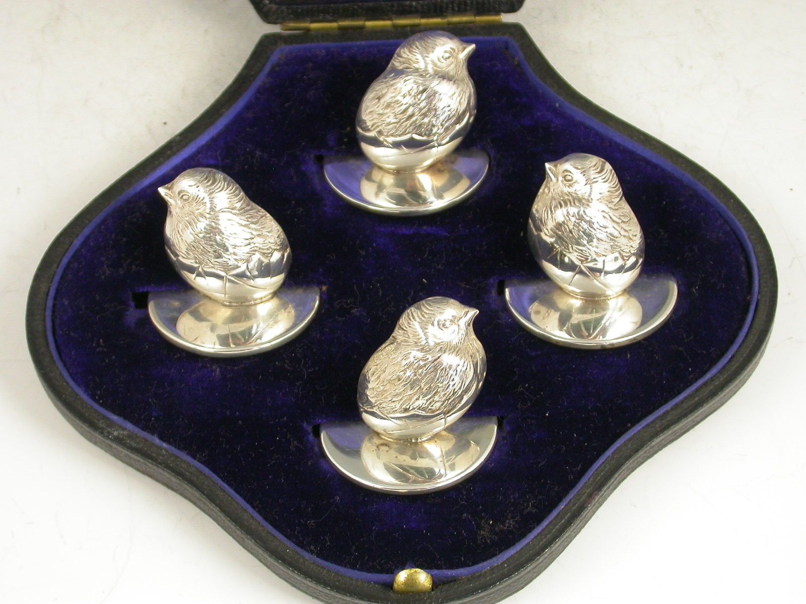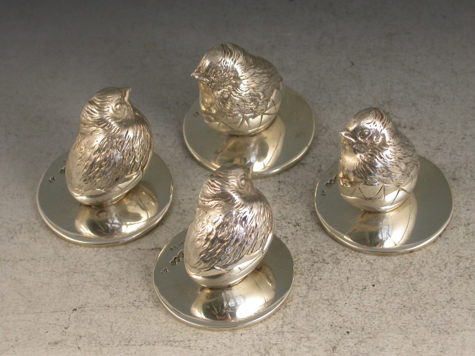 A good cased set of four Edwardian silver Menu Holders formed as Hatching Chicks (two facing left and two facing right), on flat circular bases.