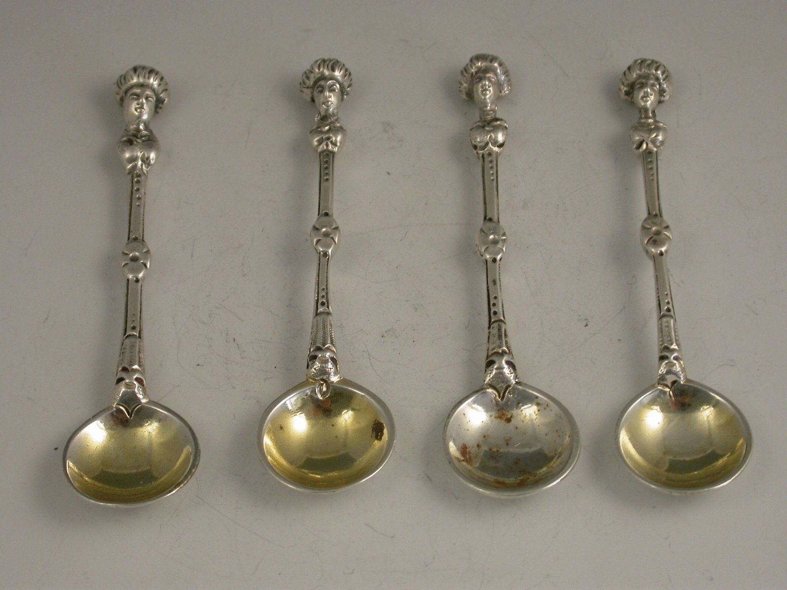 A set of four Vicotriran cast silver Salt Spoons with circular gilded bowls, the terminals of the handles formed as classical 'Blackamore Heads'.