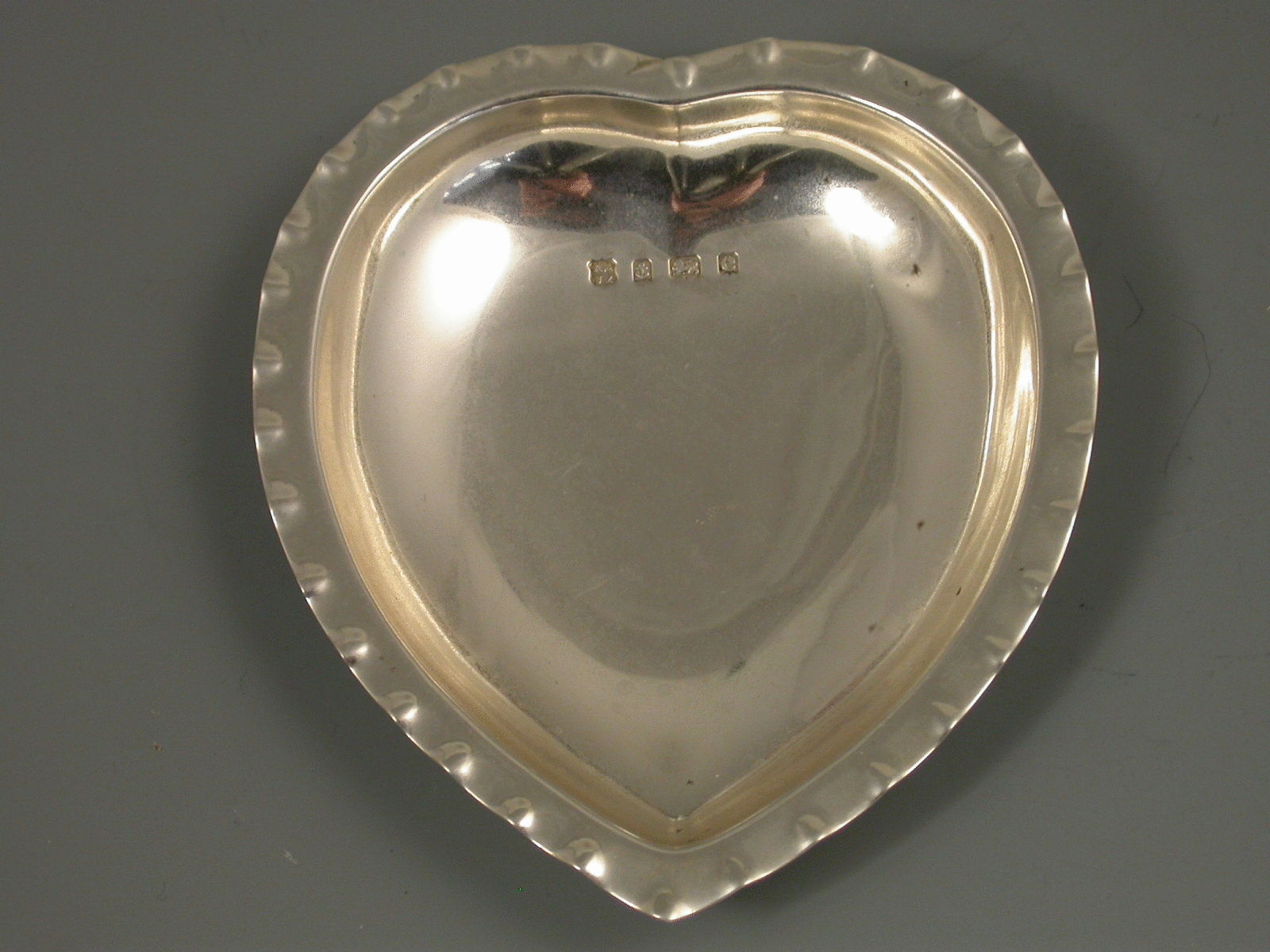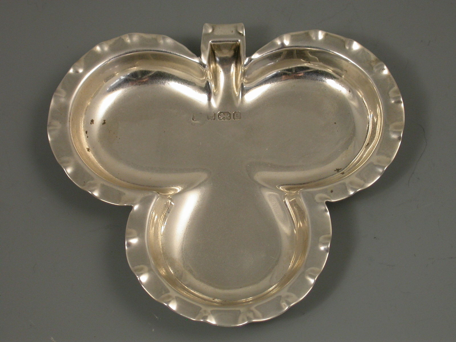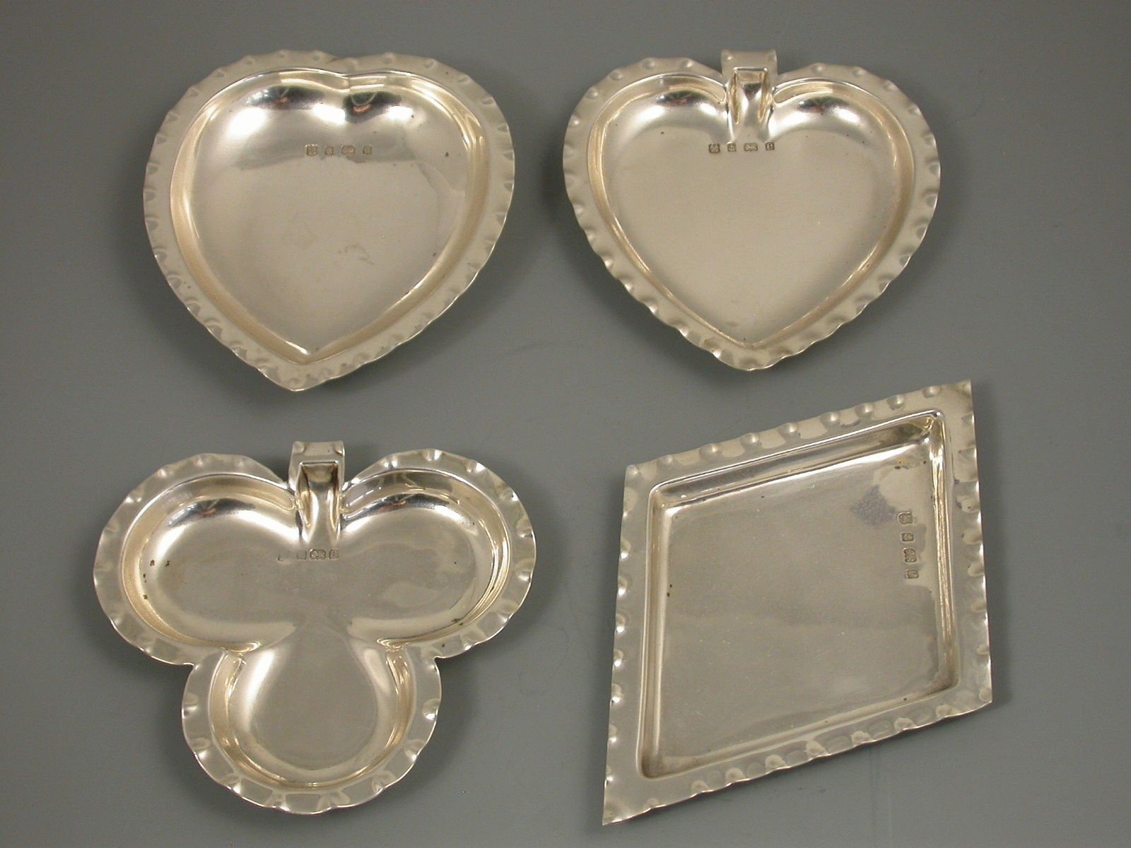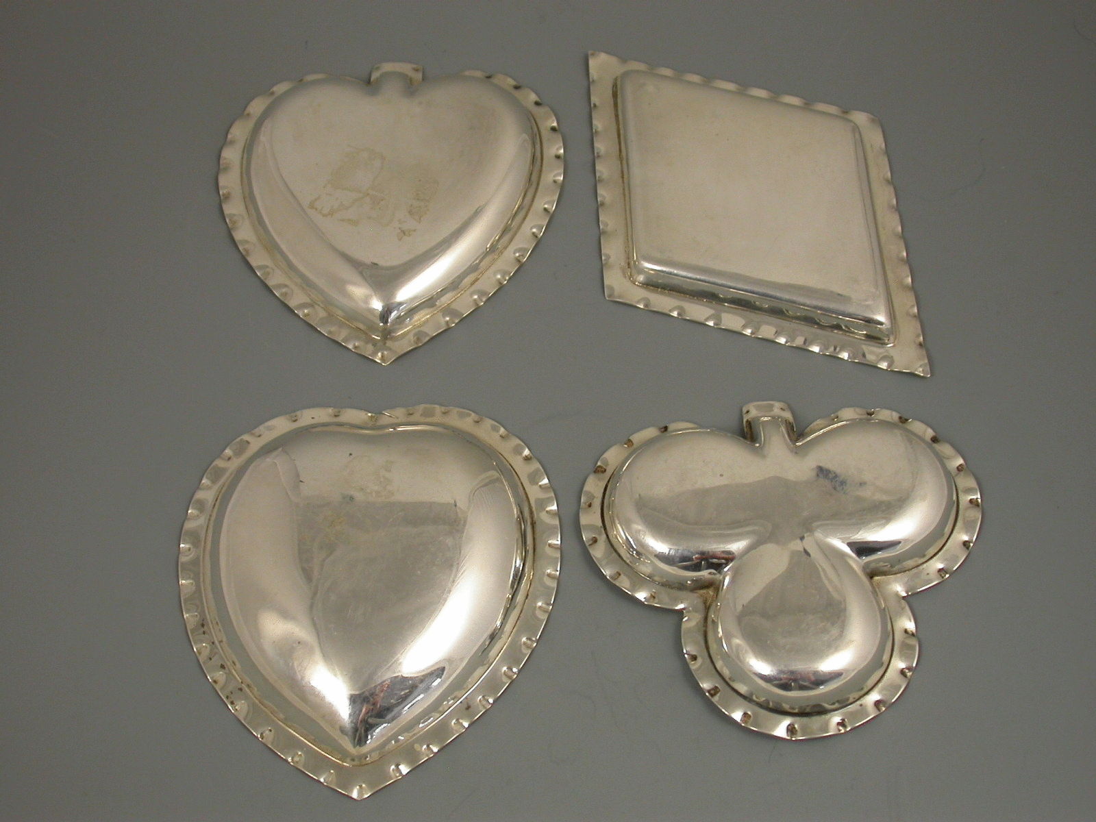 A set of four Edwardian novelty silver Gaming Counter Dishes made in the form of the four suits, Hearts, Spades, Diamonds and Clubs with crimped edges.