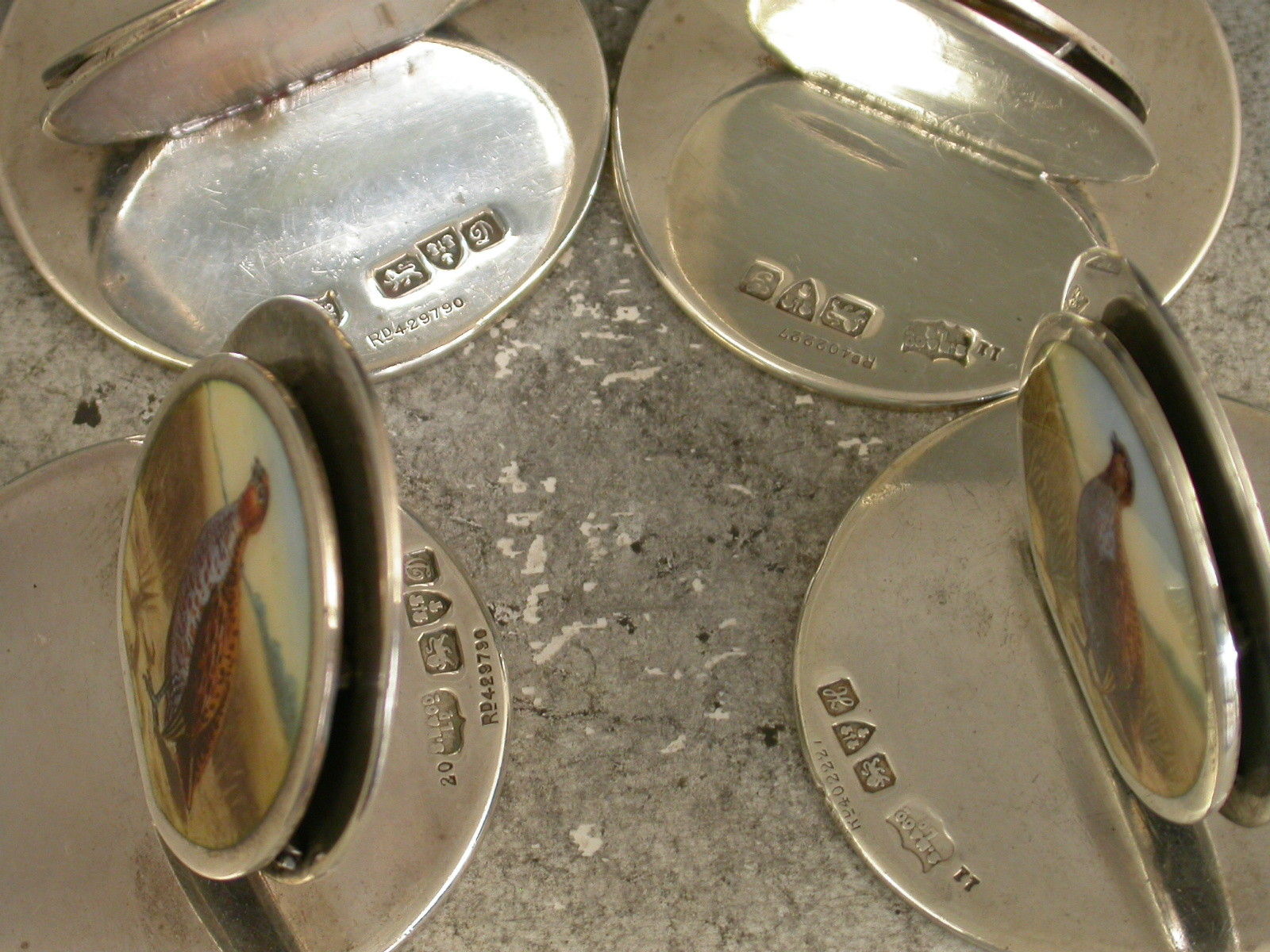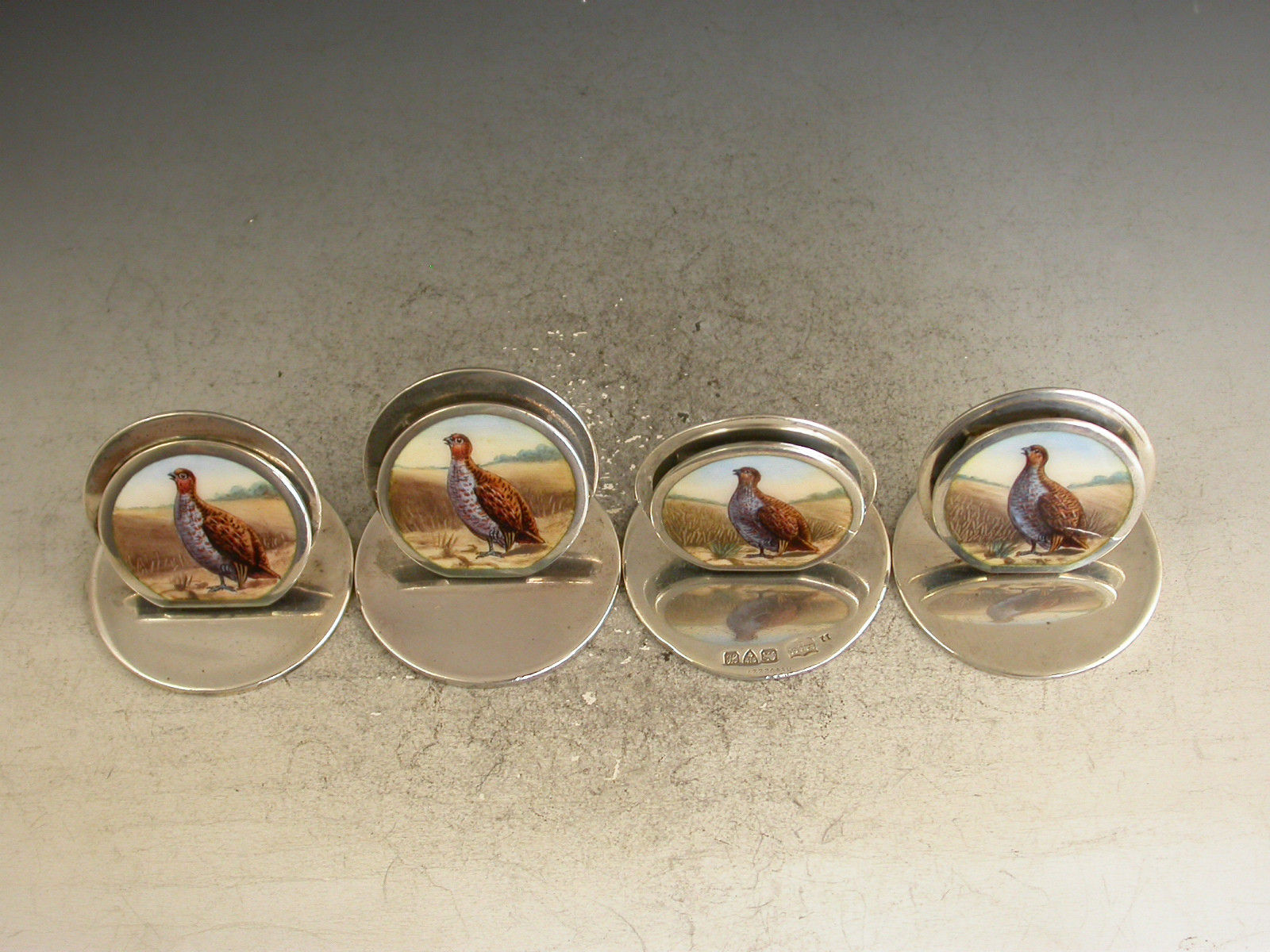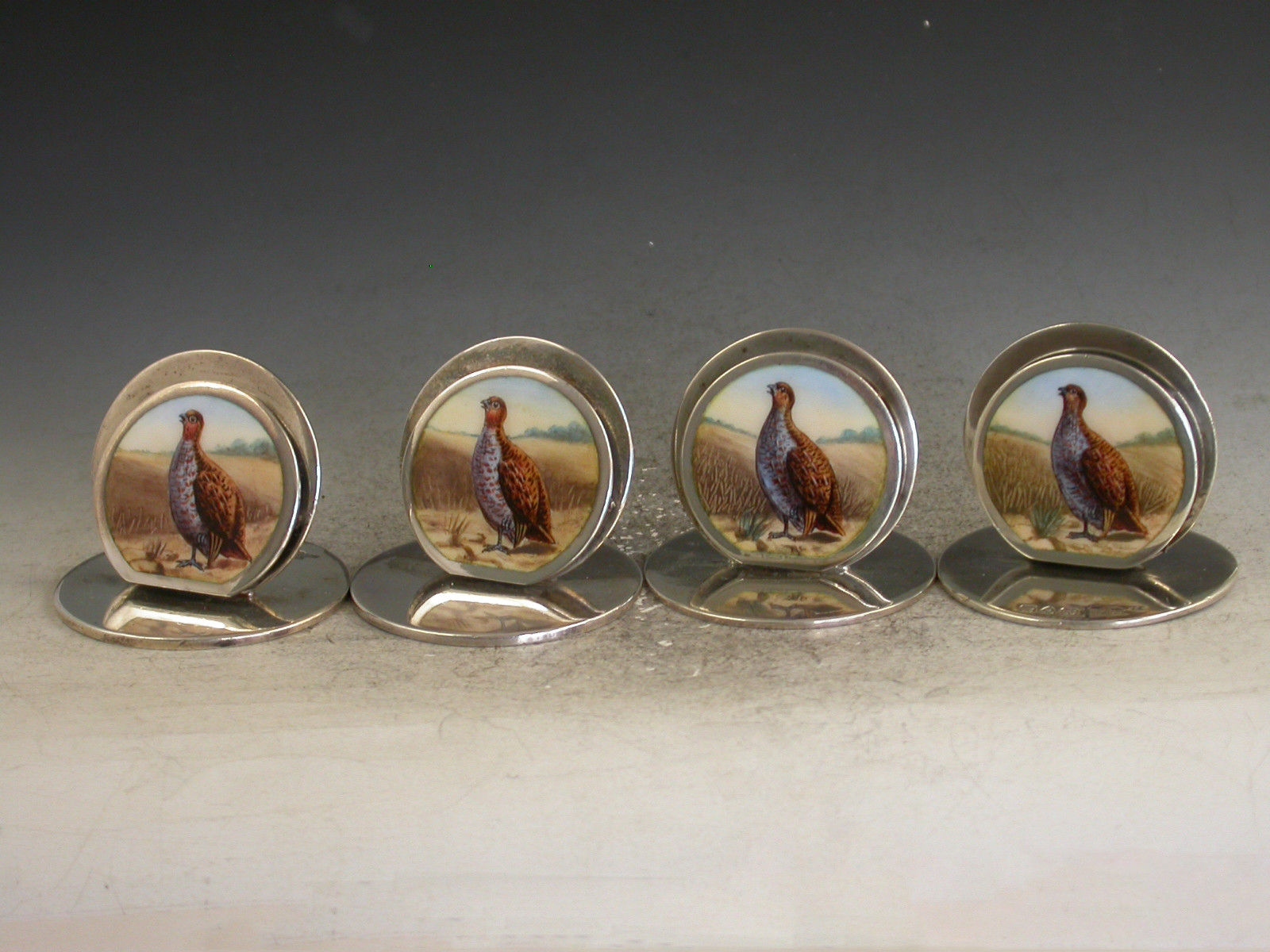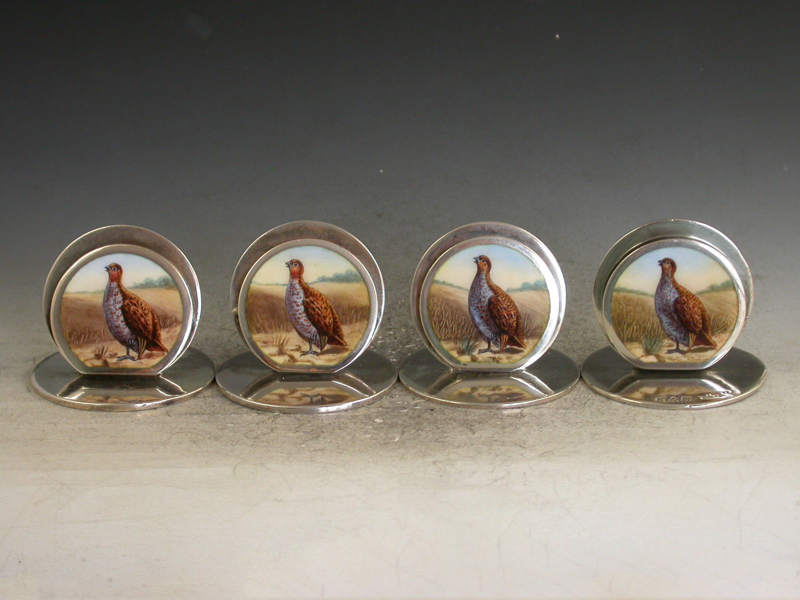 Set 4 Edwardian Silver & Enamel Game Bird Menu Holders - English Partridges