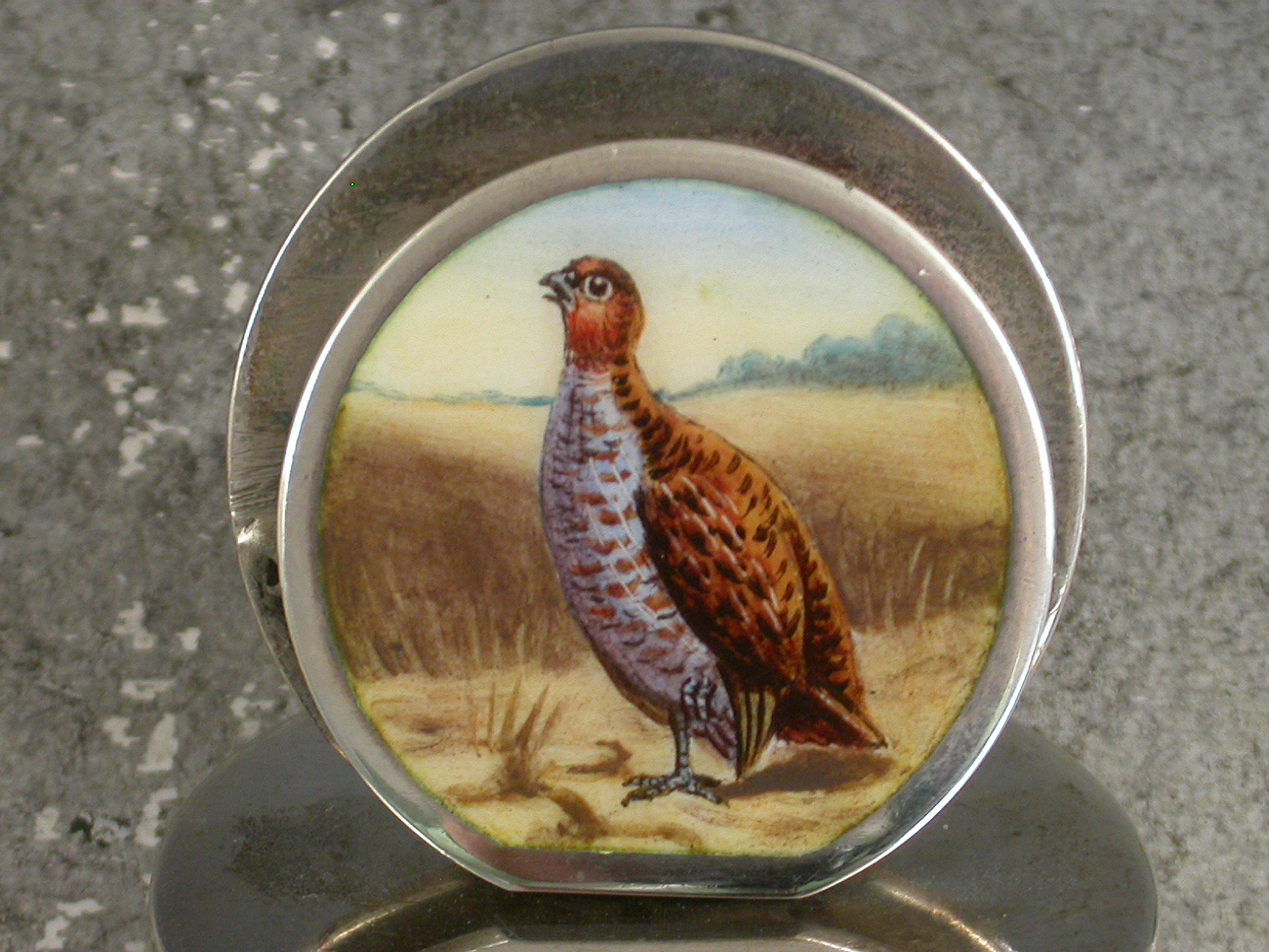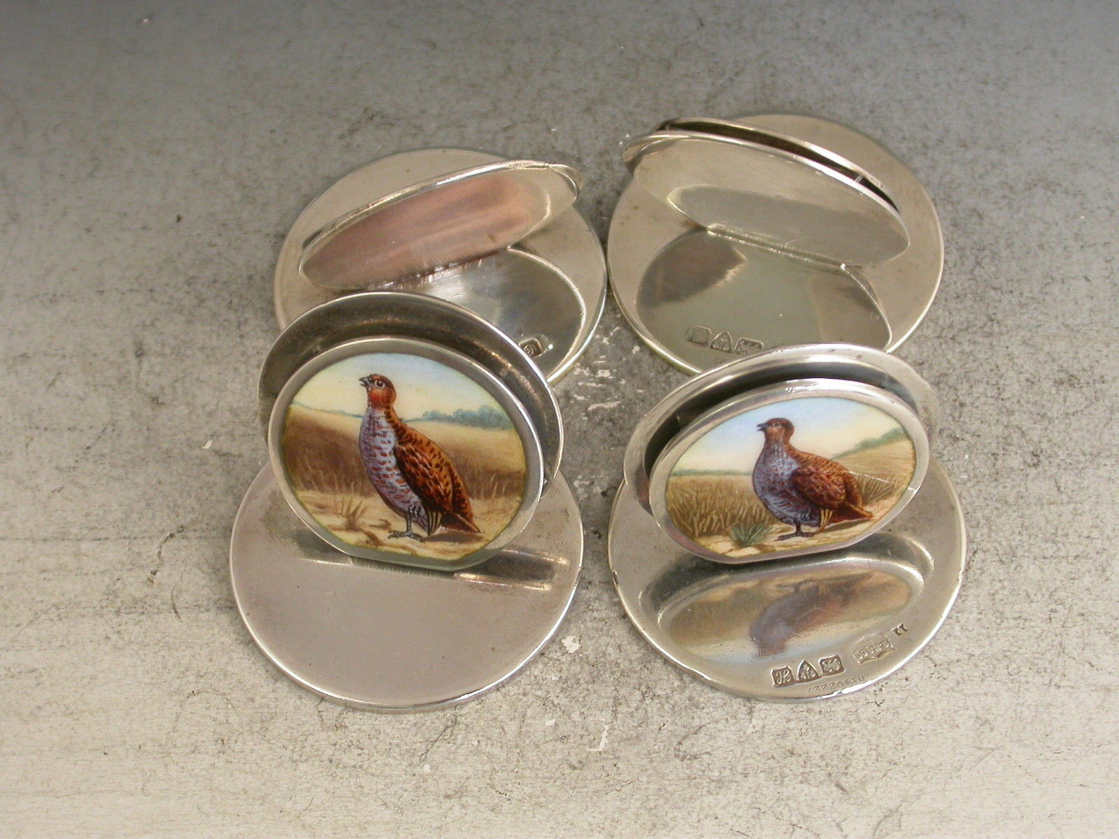 A very fine and rare composed set of four Edwardian silver and enamel Game Bird Menu holders of sprung double-disc form on flat circular bases. The faces finely enamelled with portraits of English Partridges in landscape scenes.