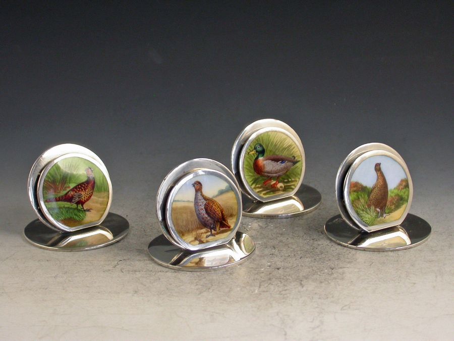 Set 4 Edwardian Silver & Enamel 'Game Bird' Menu Holders
