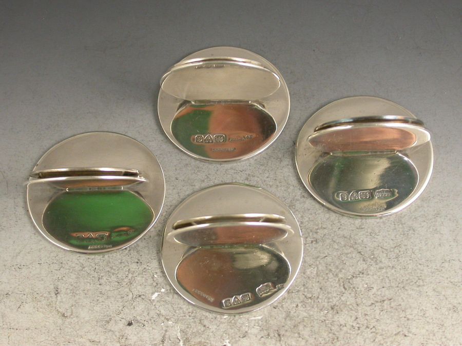 A very fine set of four Edwardian silver and enamel Game Bird Menu Holders of sprung double-disc form on flat circular bases. The faces finely enamelled with portraits of a cock pheasant, a drake mallard, an English partridge and a red grouse in landscape scenes.