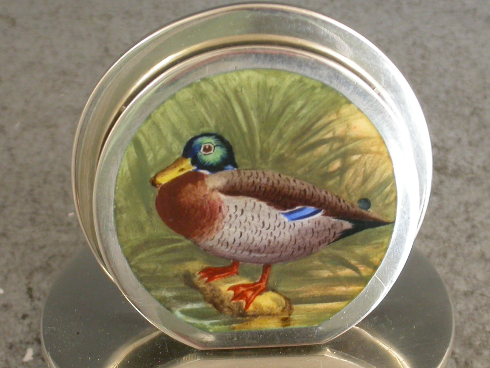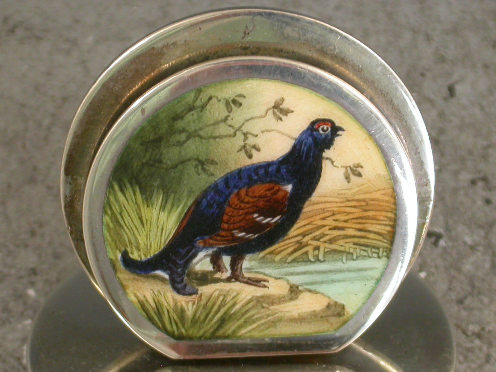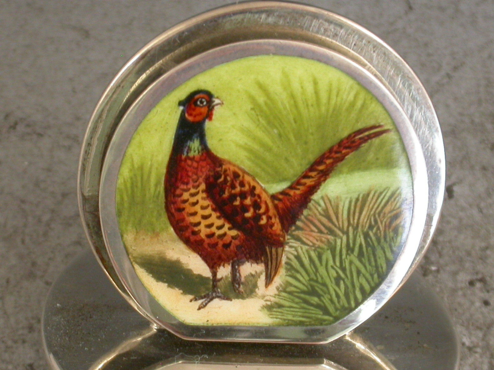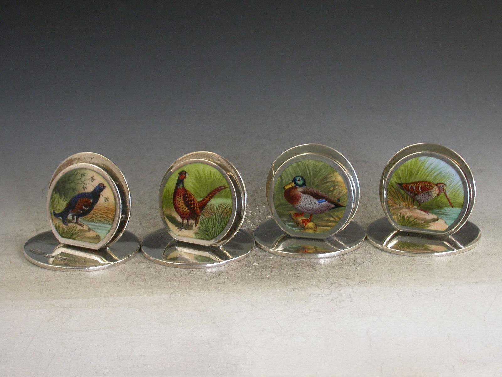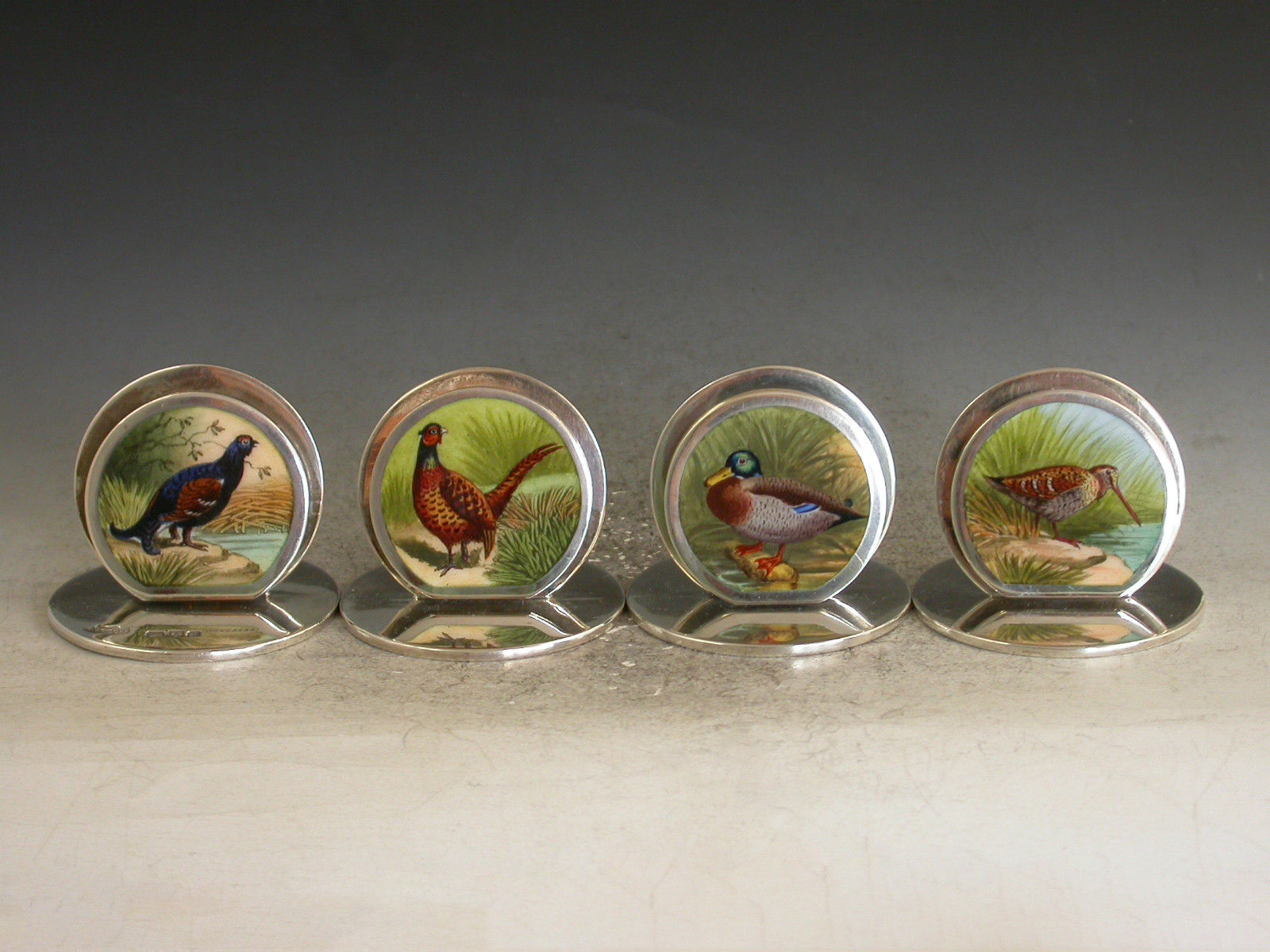 A very fine and rare set of four Edwardian silver and enamel Game Bird Menu holders of sprung double-disc form on flat circular bases. The faces finely enamelled with portraits of a cock Pheasant, a drake Mallard, a Woodcock and a Black Cock. All in landscape scenes.