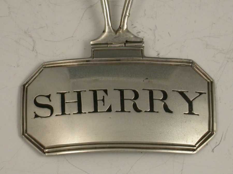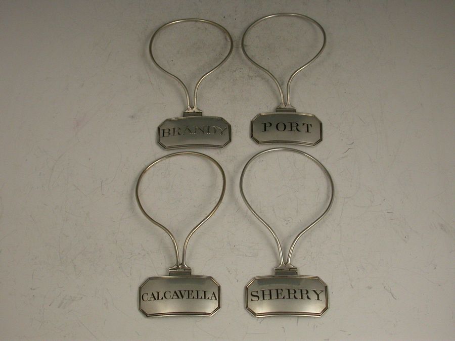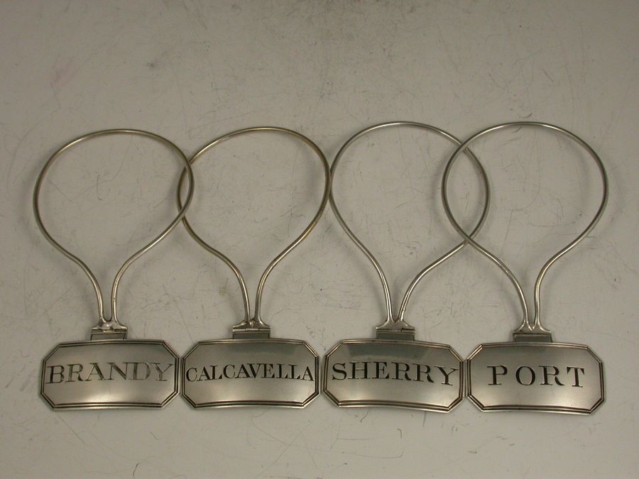 A good set of four George III silver Wine Labels of cut-cornered rectangular form with hinged neck-ring wire supports, engraved and niello filled for Brandy, Port, Calcavella and Sherry.