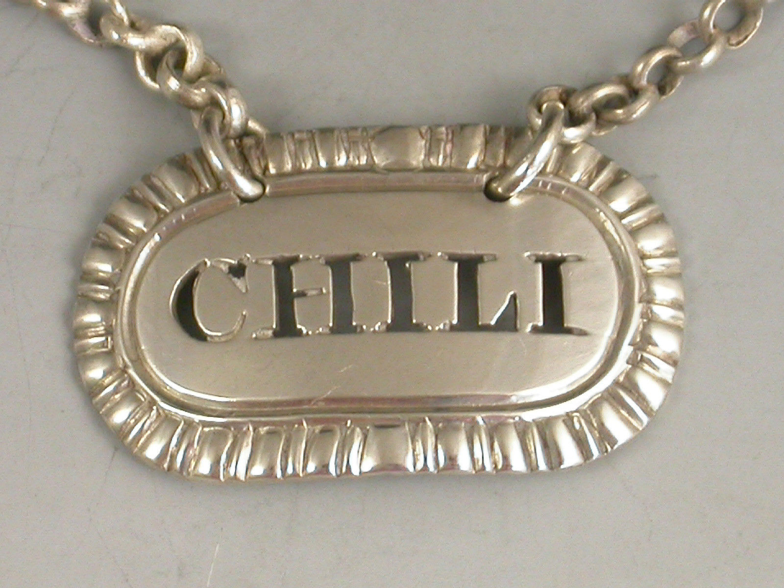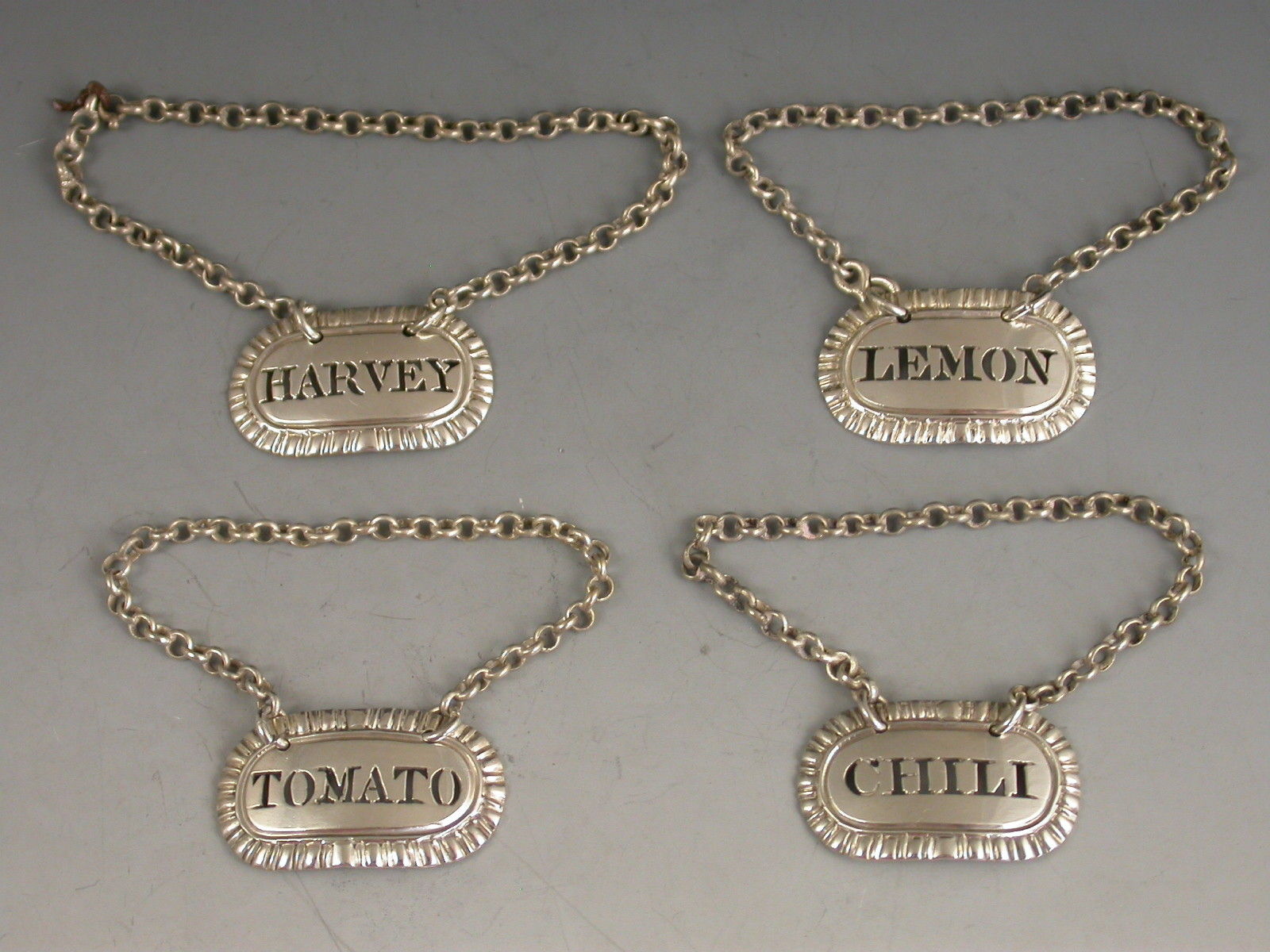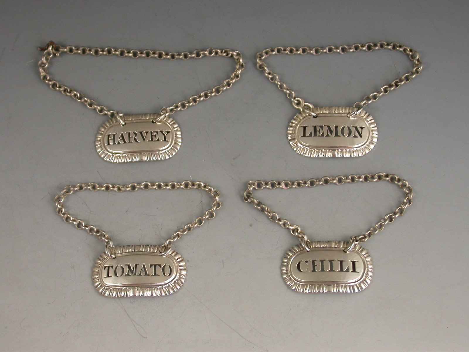 A rare set of four George III silver Sauce Labels, of rounded rectangular form with gadrooned borders and pierced for Tomato, Lemon, Chili and Harvey.