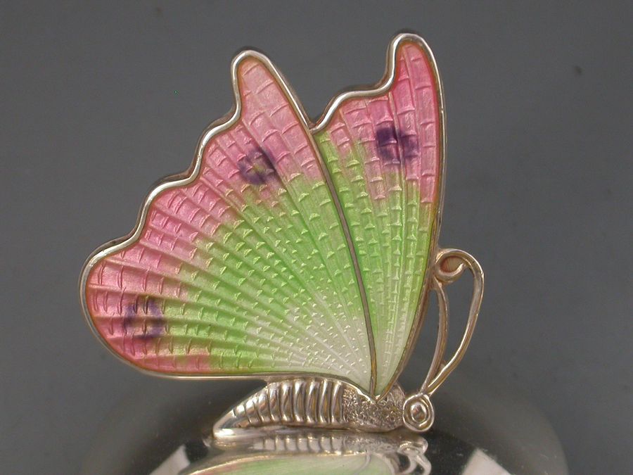 A fine quality set of four George V silver and guilloche enamel Menu Holders formed as multi-coloured butterflies, on domed circular bases.