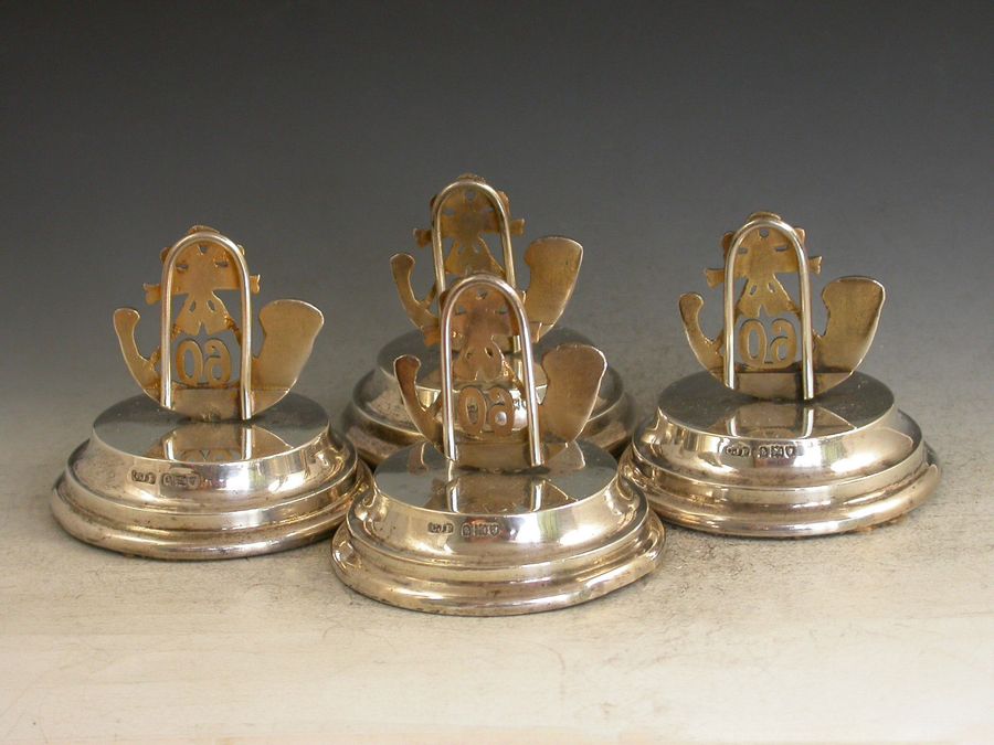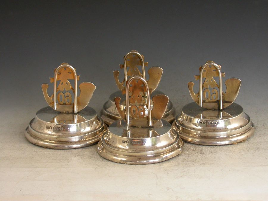 A good set of four George V parcel gilt silver Menu Holders formed as Badges of The Kings Royal Rifle Corps (60th) Regiment. Set on filled circular pedestal bases, engraved with contemporary initials A & MW.