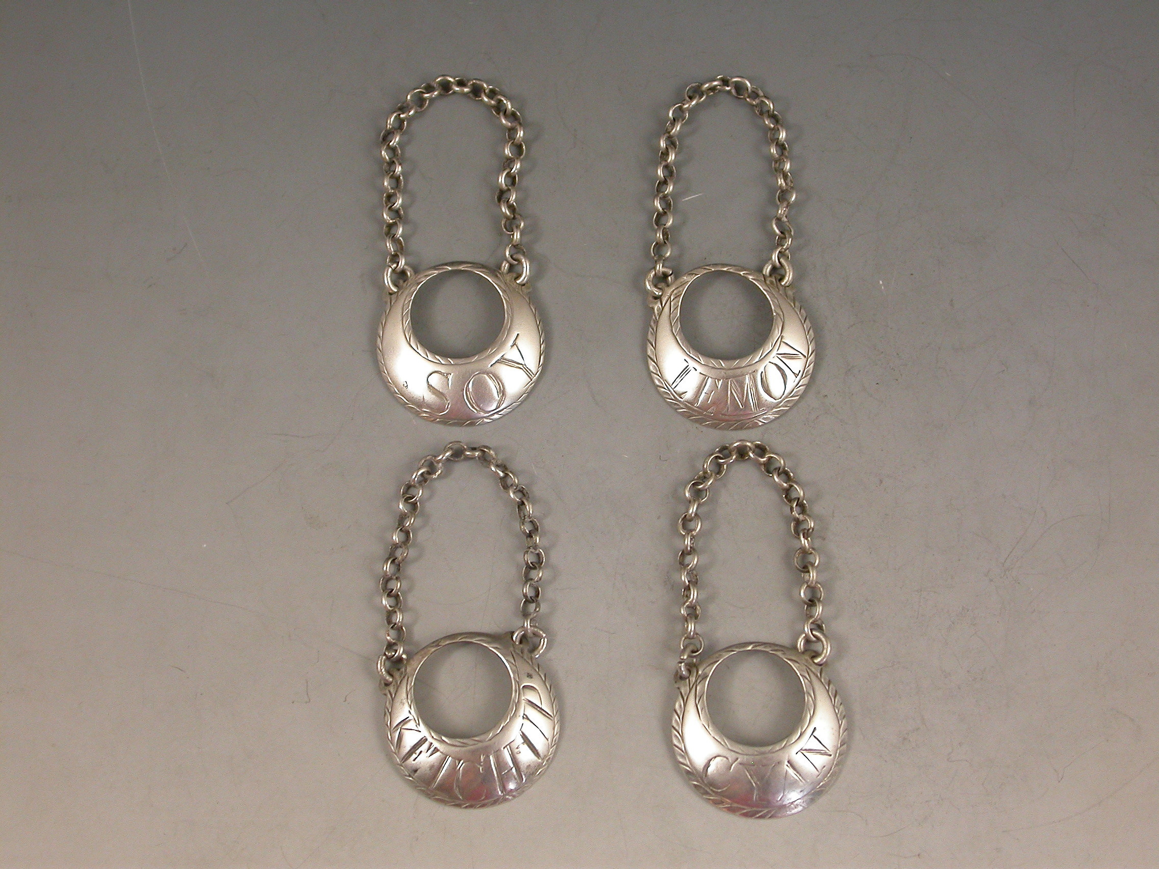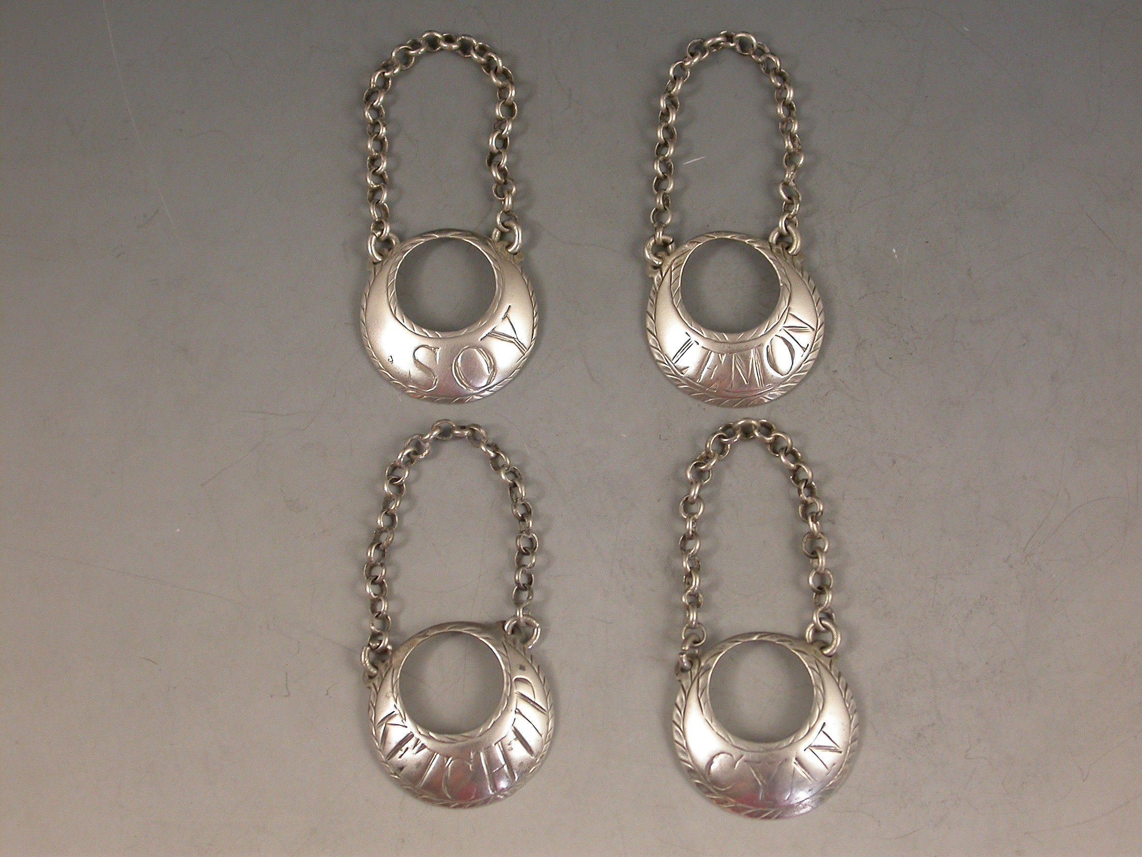 Set 4 Mid 18th Century Silver Sauce Labels Soy - Ketchup - Lemon - Cyan