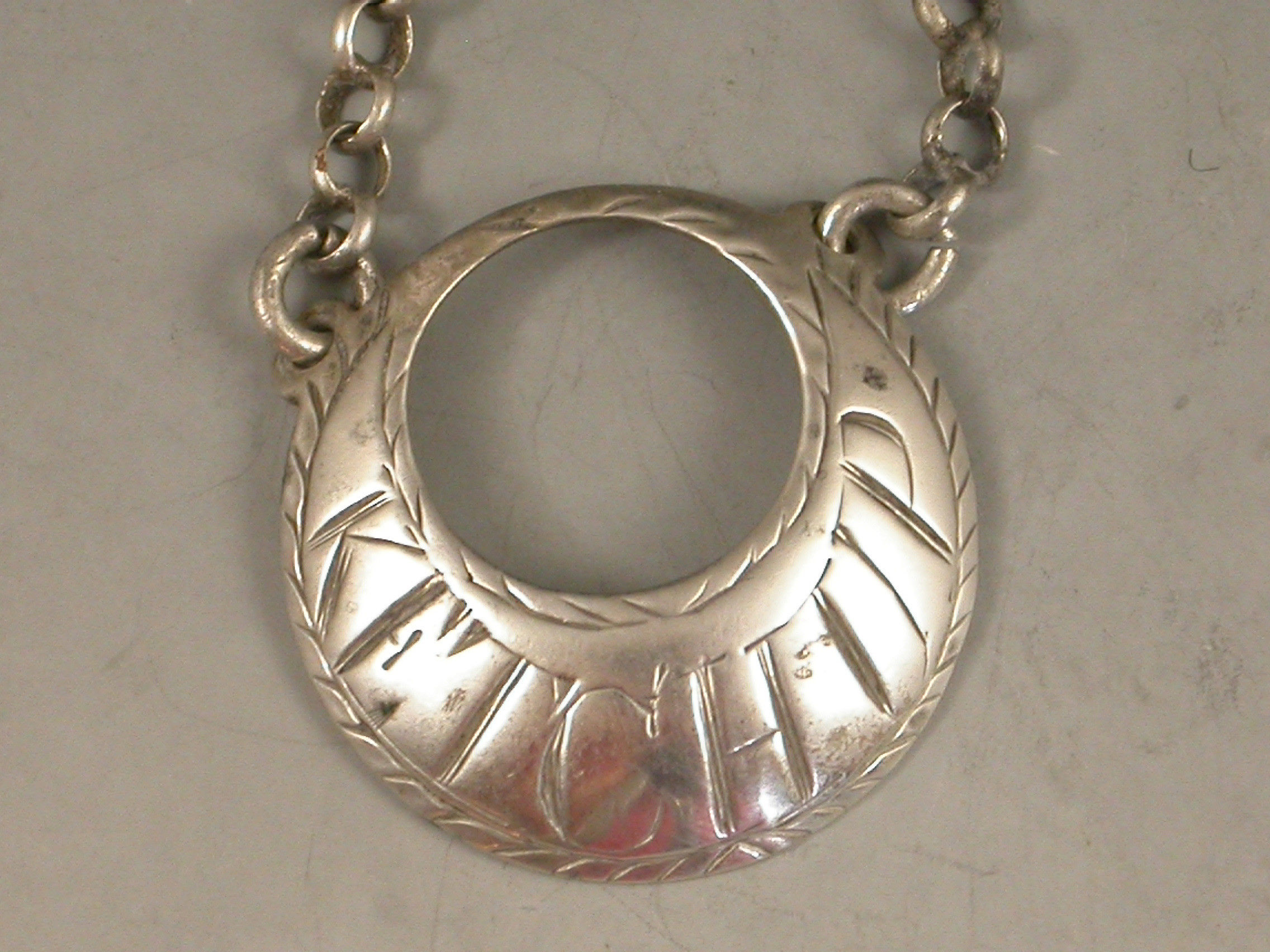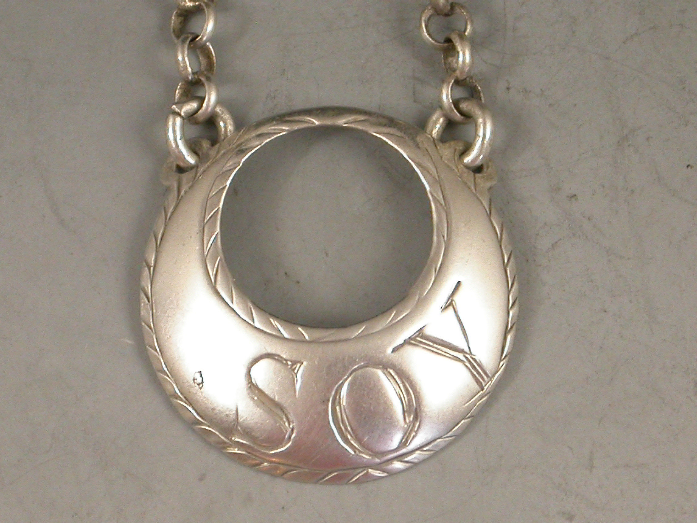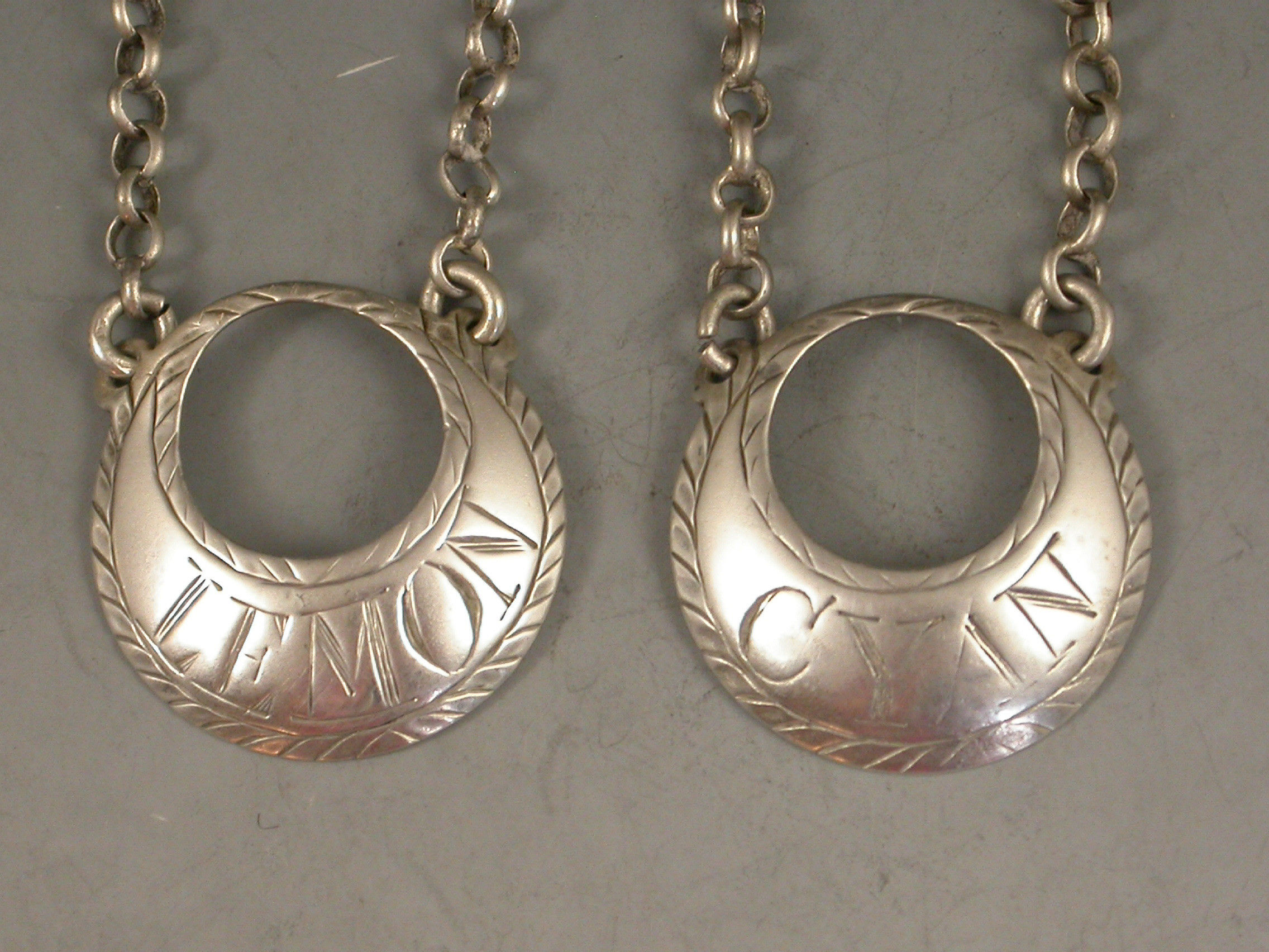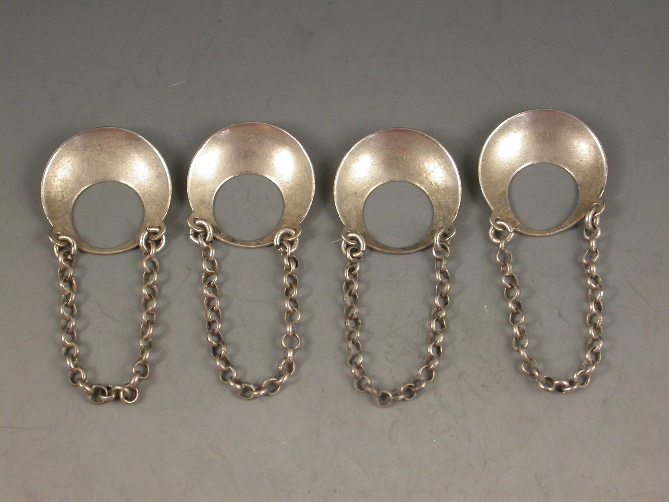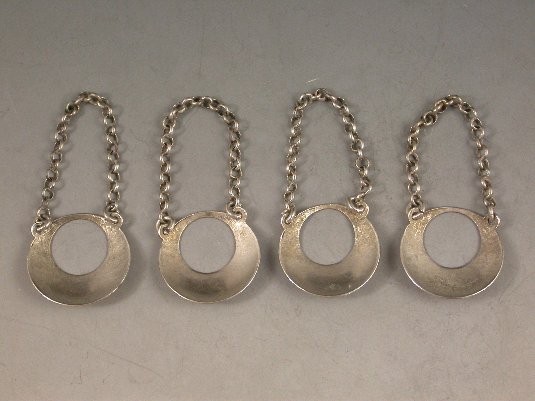 A rare set of four early George III silver Sauce Labels of enclosed crescent form with raised eyelets and feather edge borders.