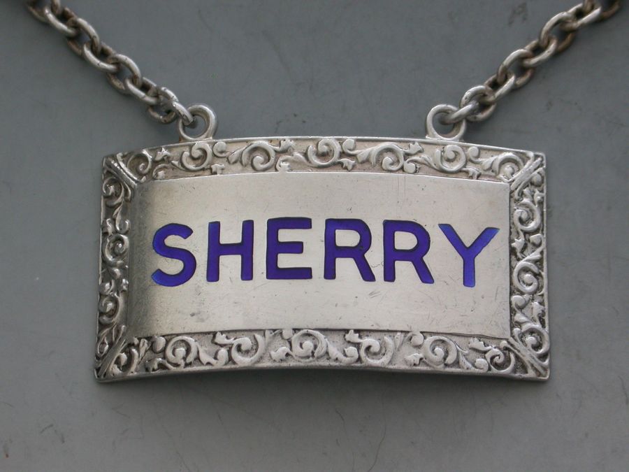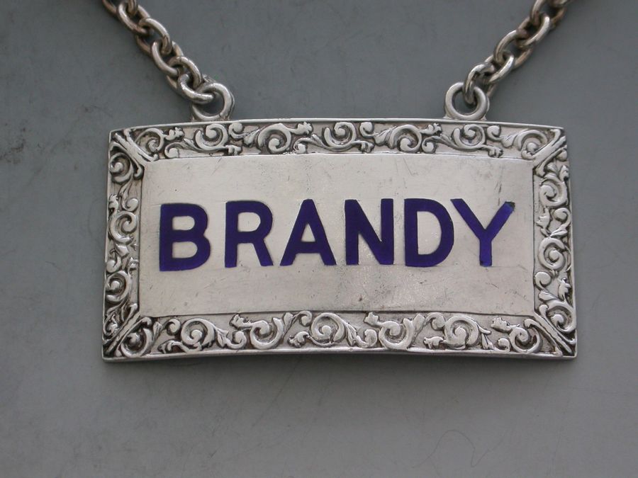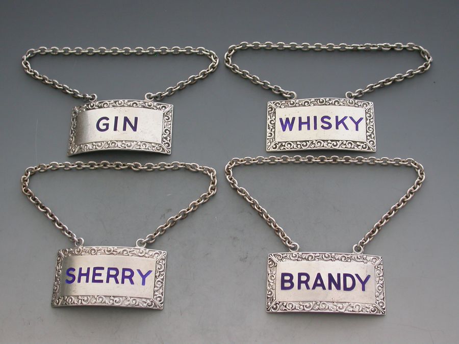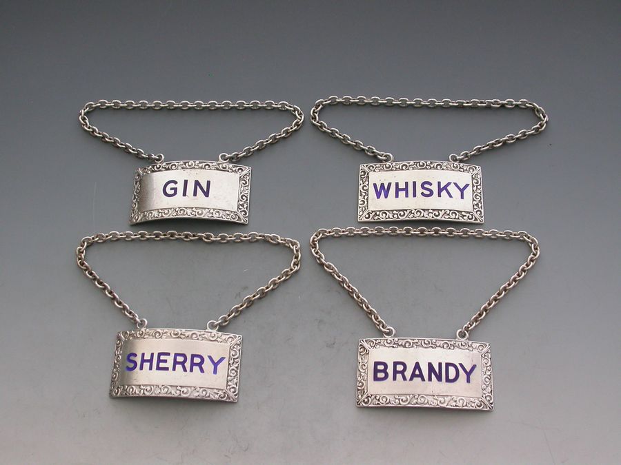 Set 4 Mid 20th Century Cast Silver & Enamel Wine Labels 'Gin, Brandy, Sherry & Whisky'