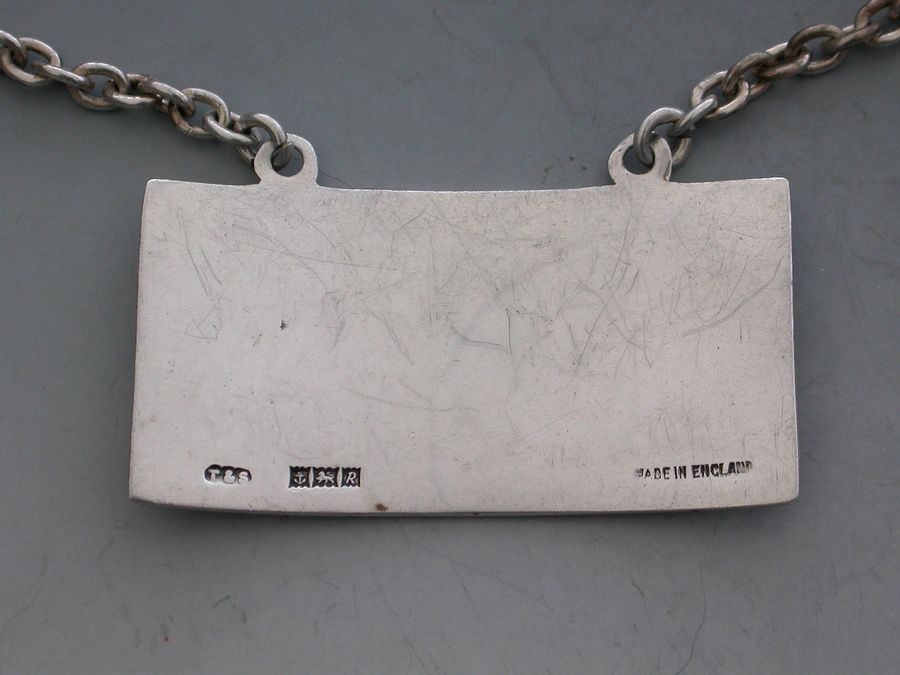 A good quality set of four mid 20th century heavy cast silver and enamel Wine Labels of rectangular form, the borders deeply chased with a scrolled design, royal blue enamel titles for Gin, Whisky, Sherry and Brandy.